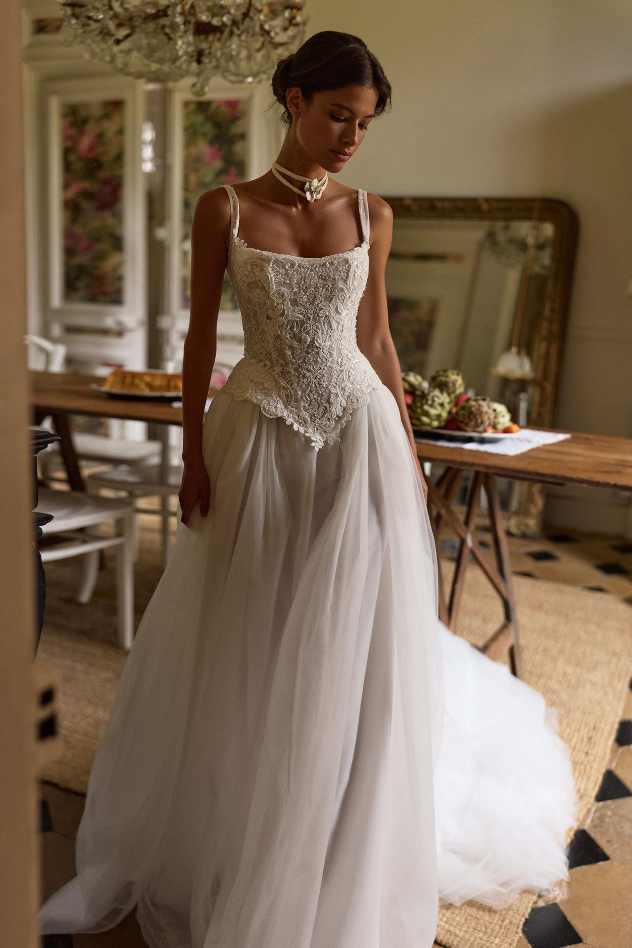 An A-line wedding dress with a waist-cinching lace corset bodice and a voluminous tulle skirt, highlighted by a three-dimensional detachable rose at the back.