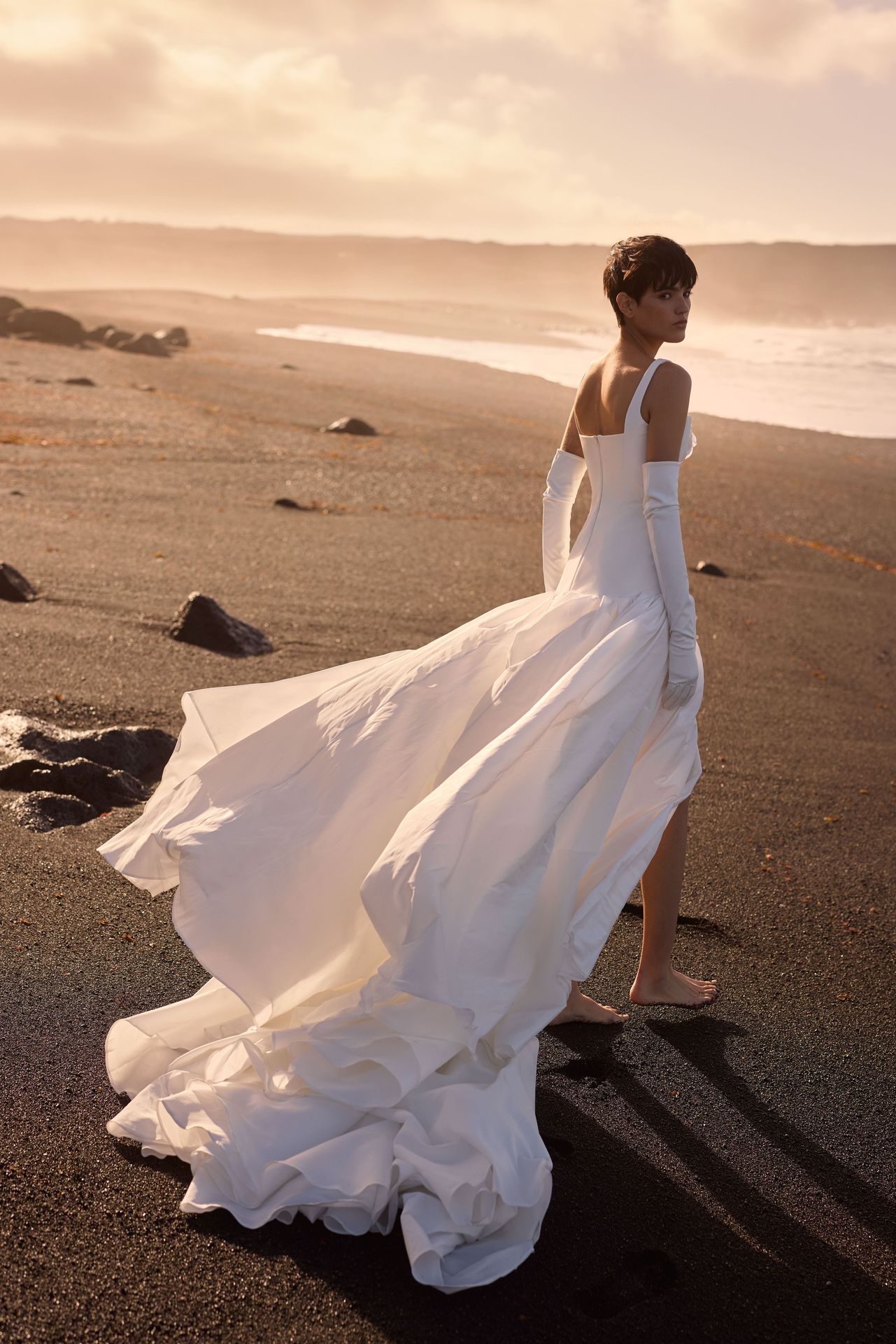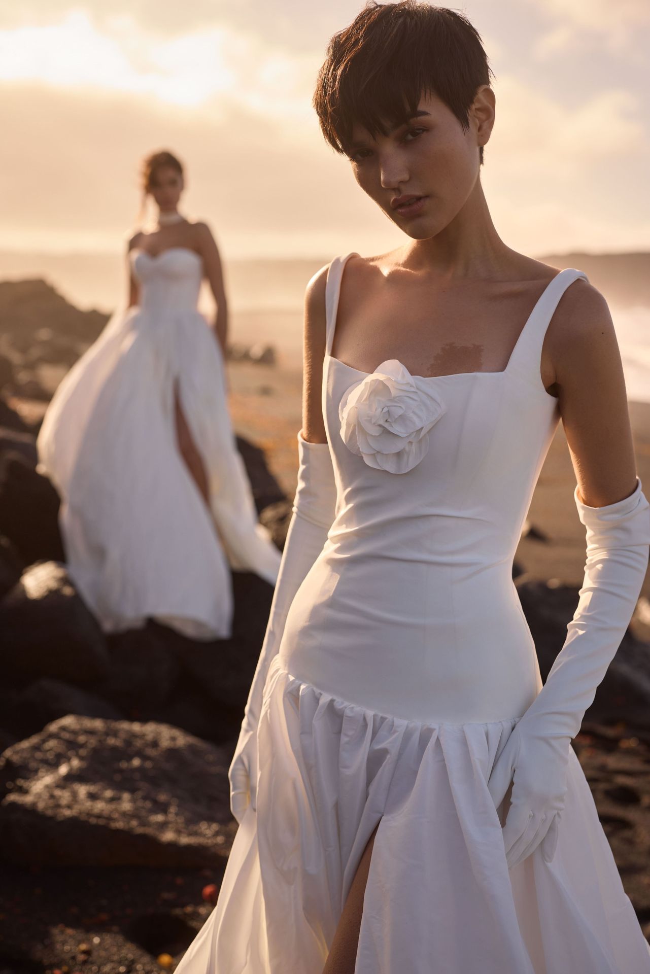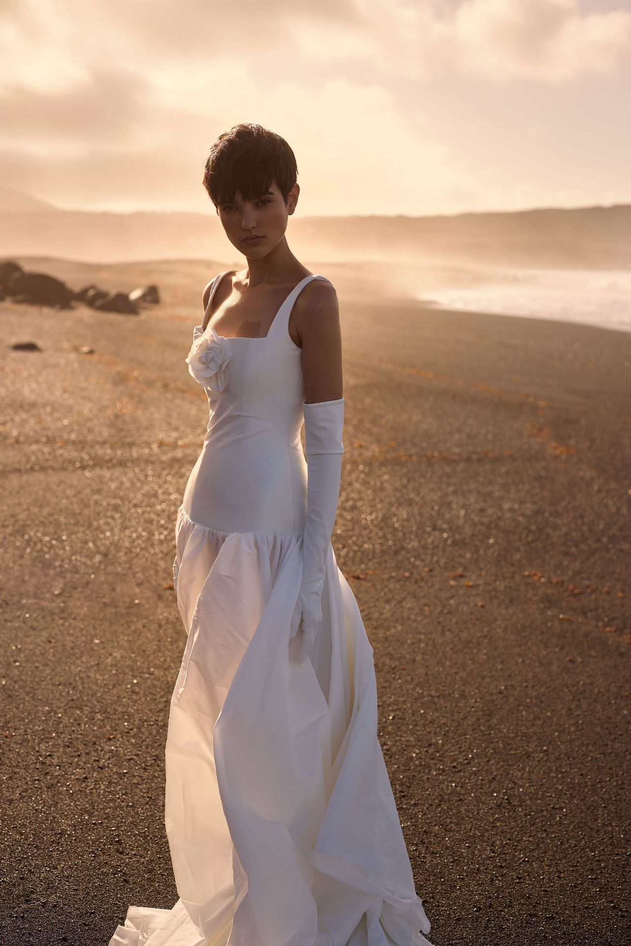 Minimalist drop-waist wedding gown crafted from taffeta in a corset style. Featuring a square neckline framed by wide shoulder straps, a detachable centerpiece flower, and a fitted bodice with a discreet zip closure at the fully covered back. The voluminous skirt is beautifully gathered, flowing from a low waist into a maxi length with a side slit and midi train. Finish the look with Aveline satin opera gloves for an extra touch of sophistication.