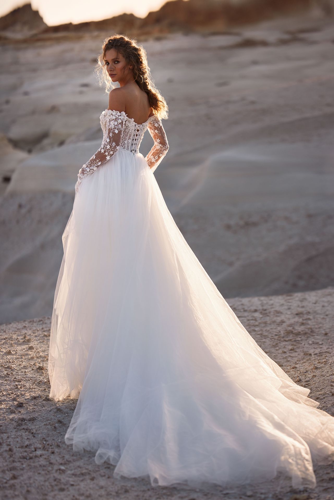 Enchanting off-the-shoulder wedding gown with long sleeves, puffy tulle skirt, embellished with a lace applique bodice, a lace-up closure on the back, and a midi train.