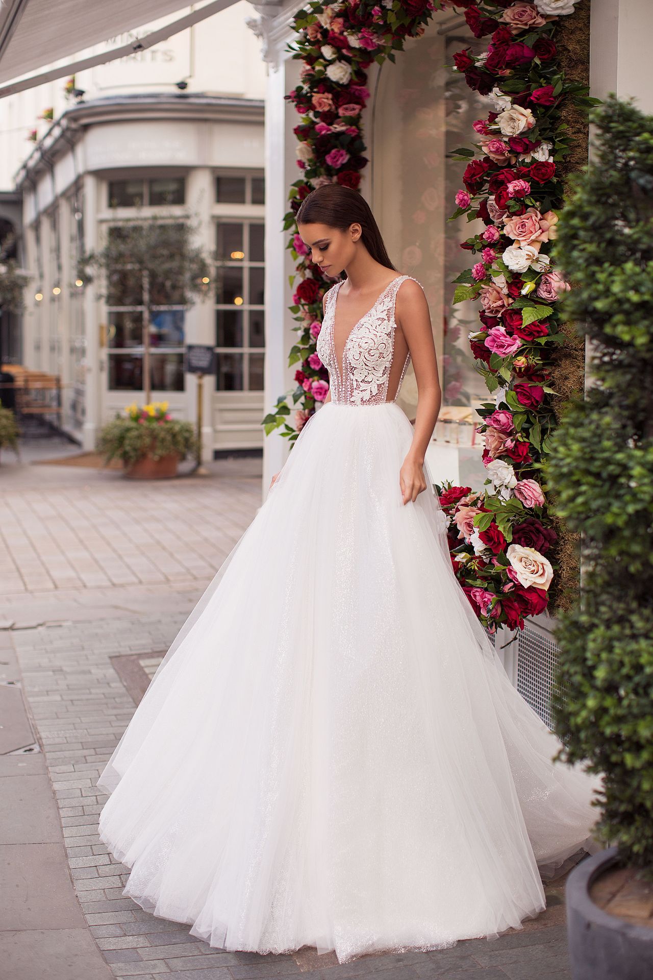 Tender A-line wedding combination with a fluffy tulle skirt and sleeveless semi-transparent adorned with lace beaded corset with a daring plunging neckline and side cuts.