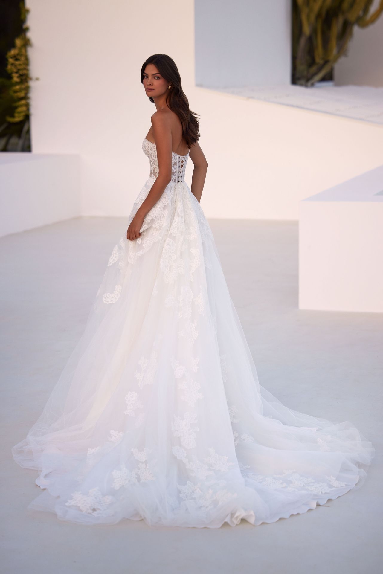 Dreamy strapless A-line wedding gown with handcrafted chantilly lace floral ornament. Featuring a heart-shaped neckline, lace-up closure on the back, and a voluminous tulle princess skirt with a long train. The look can be elevated with a sheer long-sleeve bolero and light tulle long veil.