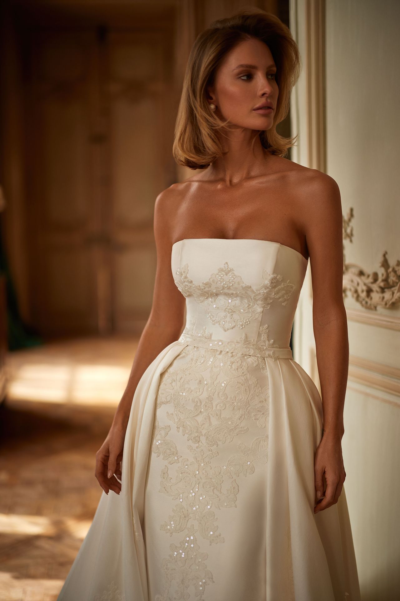 Refined sheath wedding gown crafted from mikado and adorned with sensational floral lace appliques hand-embellished with sequins. Featuring a straight sleeveless neckline, a fitted bodice, a zip closure on the closed back, and a straight column skirt with a slit at the back. May be complemented by a detachable spectacular mikado train adorned with shiny floral lace appliques along the long train.