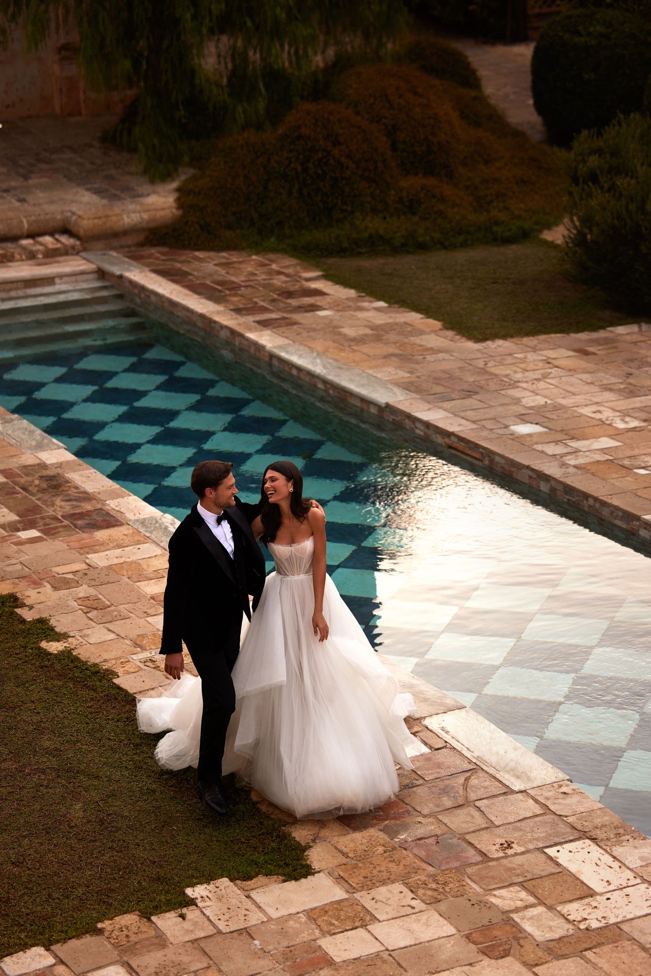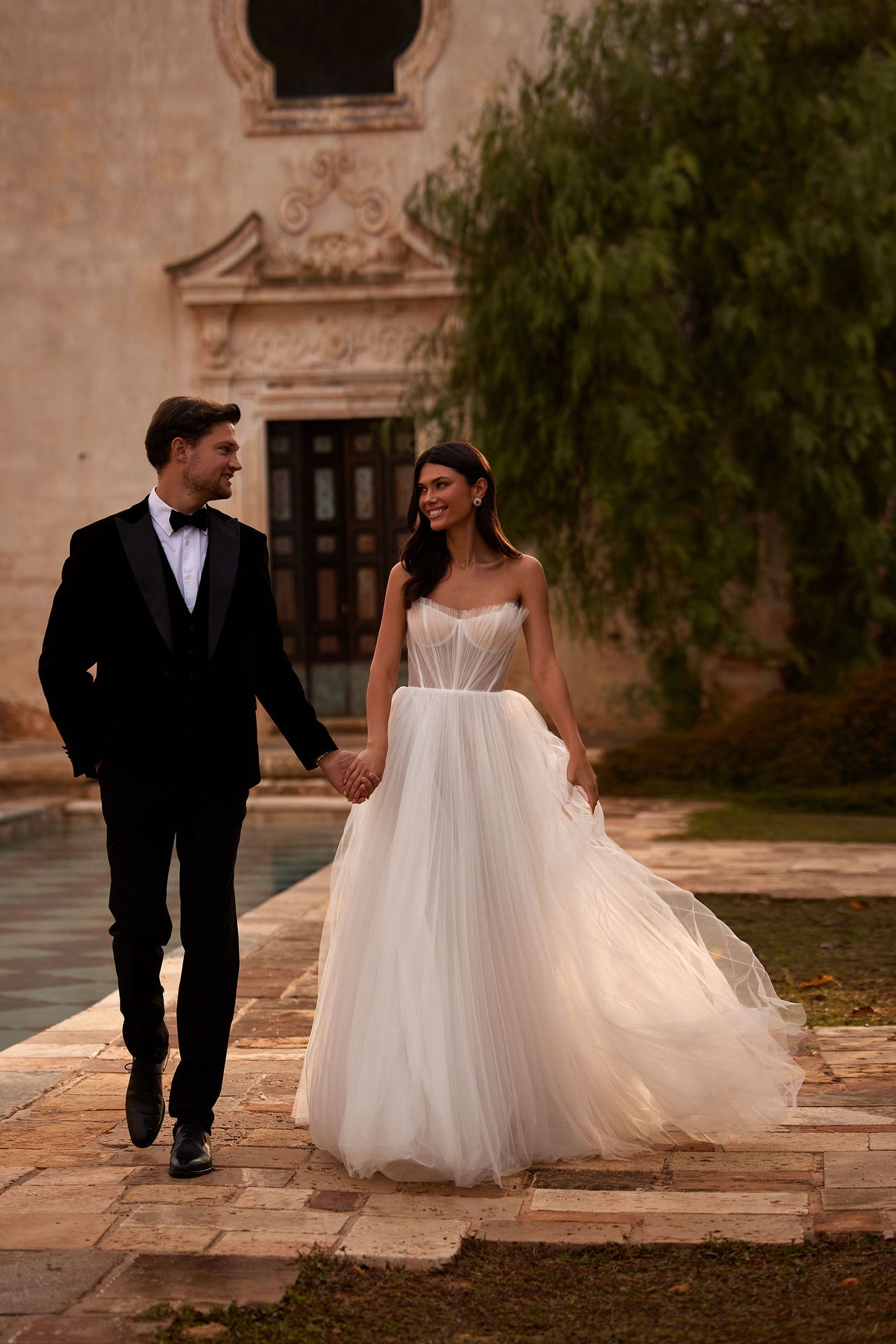 Romantic sleeveless semi-sheer wedding gown made from exclusive pleated tulle. Its heart-shaped boned corset, complete with built-in cups, offers a flattering silhouette, while the zip-up closure on the sheer closed back adds a touch of elegance. voluminous lush skirt from frothy layers of pleated tulle. Can be complemented by a puffy train with wavy layers of tulle.