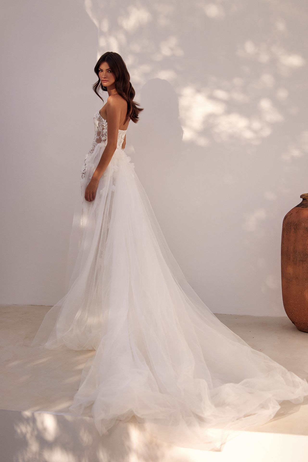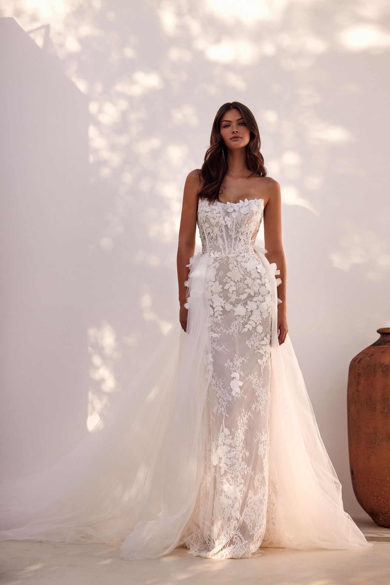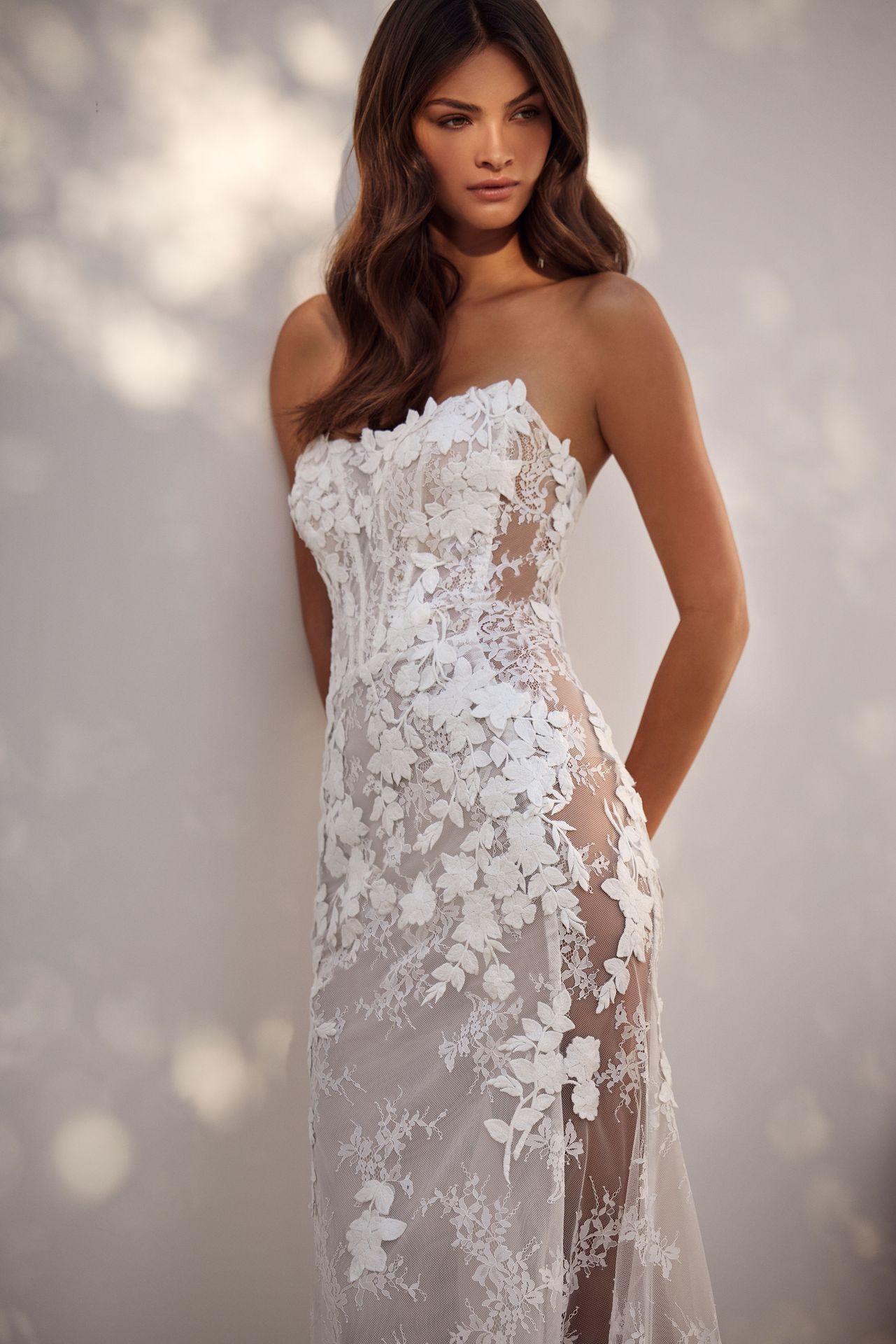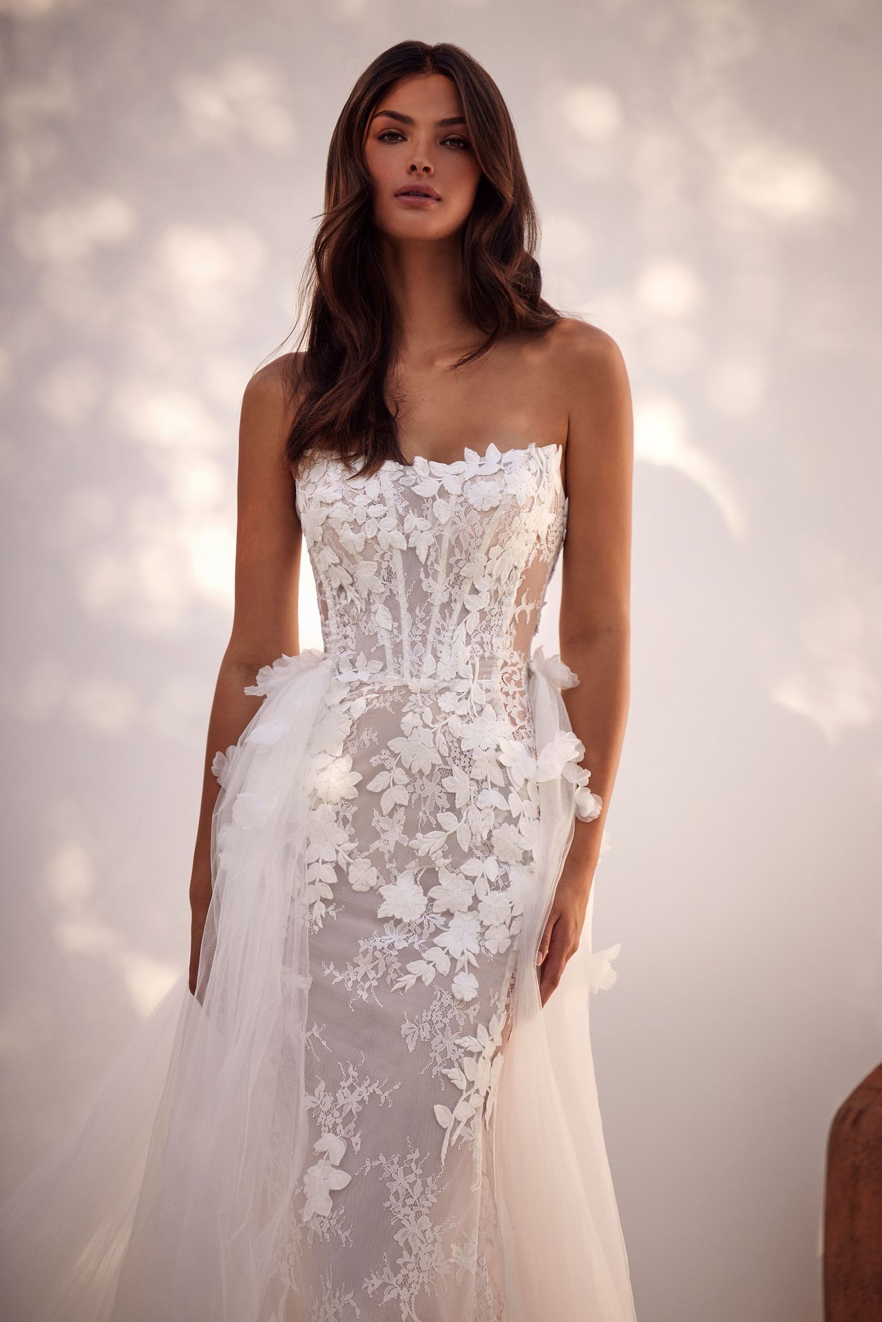 Fairylike mermaid wedding gown covered in chantilly floral lace. Features geometric boned corset, lace-up closure or zipline on the back, and semi-transparent fitted skirt with a short train. Comes with underwear and a detachable underskirt. The underskirt can be ordered as built-in for an additional fee.