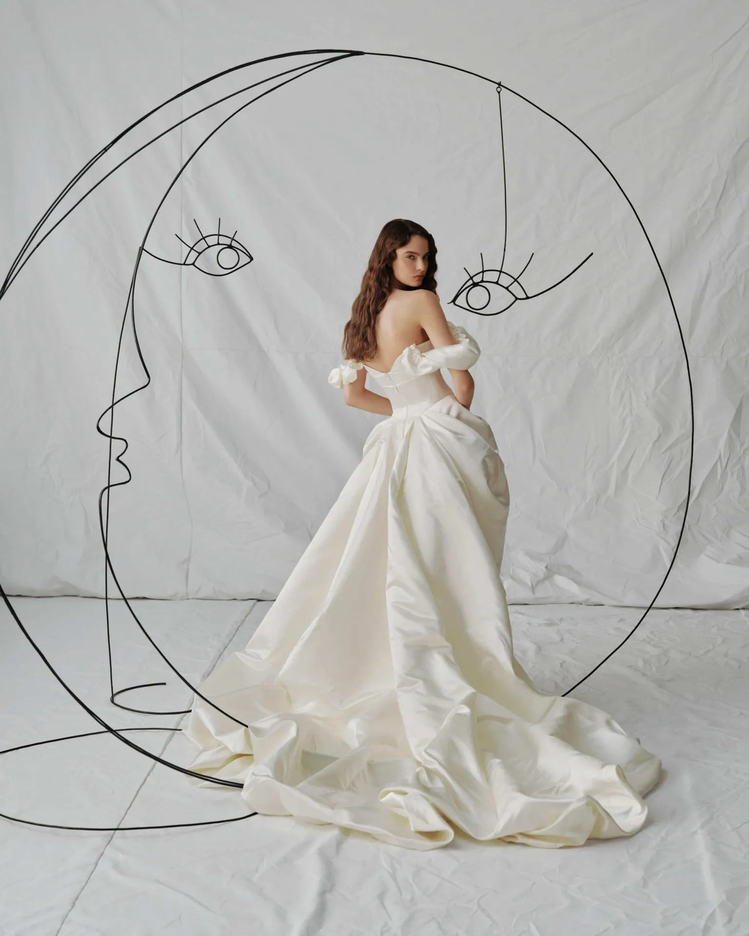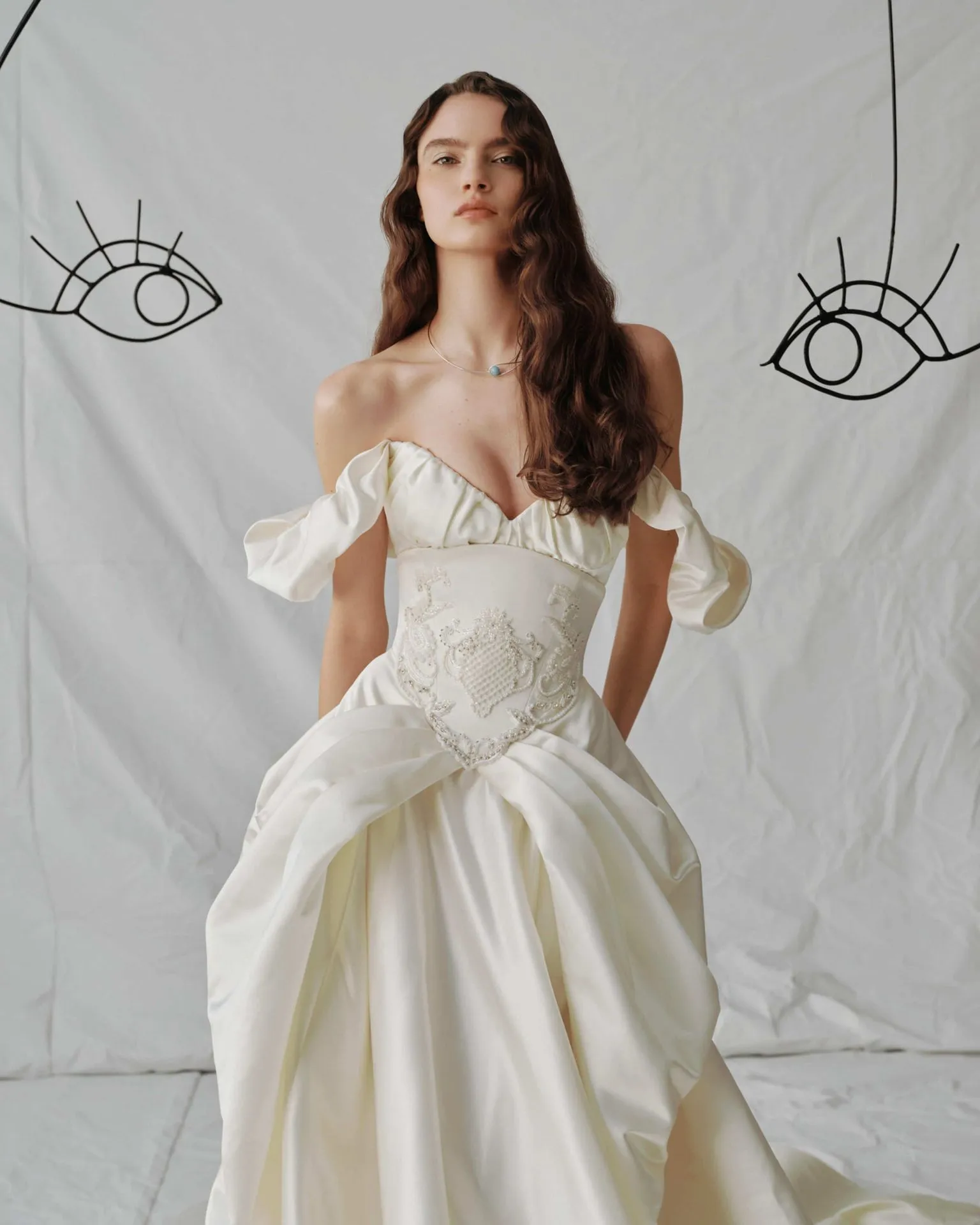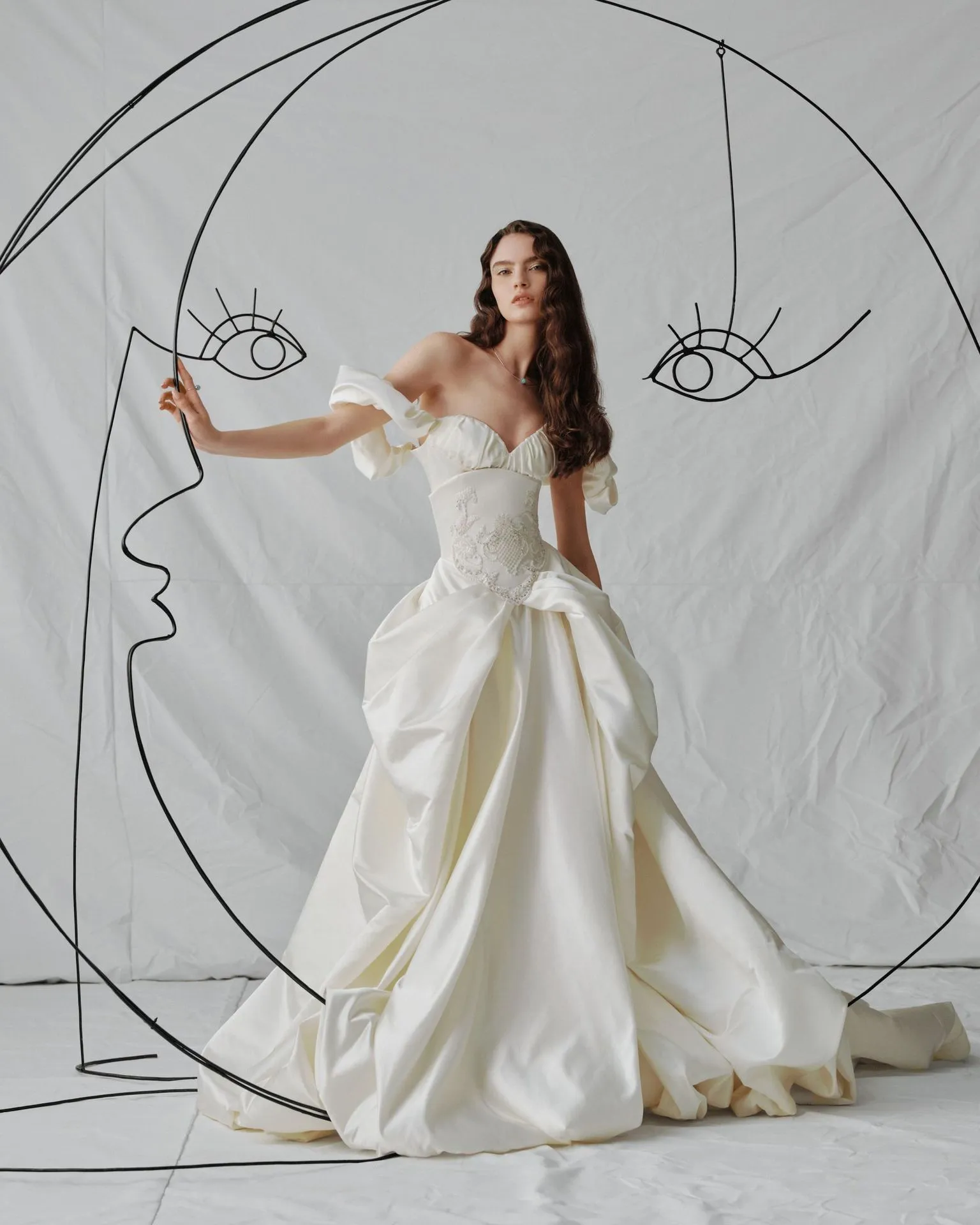 An off-shoulder ball gown in ivory satin with a draped, voluminous skirt that feels effortlessly light despite its grandeur. The structured corset bodice is embellished with intricate beading and crystals, defining the waist and adding a touch of quiet opulence. Softly ruffled off-shoulder sleeves give the silhouette a romantic, almost dreamlike quality — the kind of gown you'll still be thinking about long after the wedding day is over.