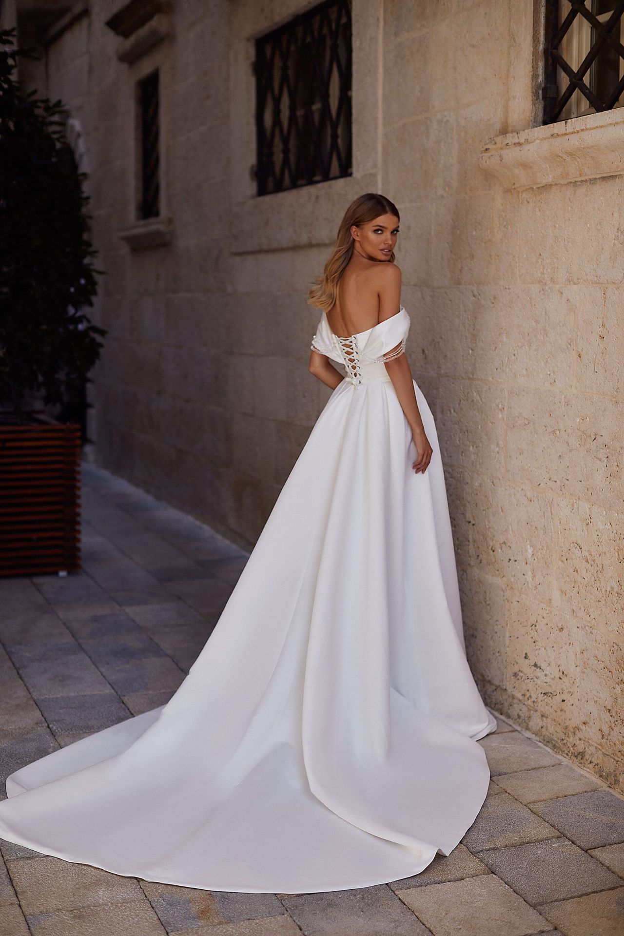 Off‑the‑shoulder satin A-line ivory gown with a heart-shaped corset discreetly decorated with sequins. The skirt of a gown has a slit. The gown is also available in mikado fabric.