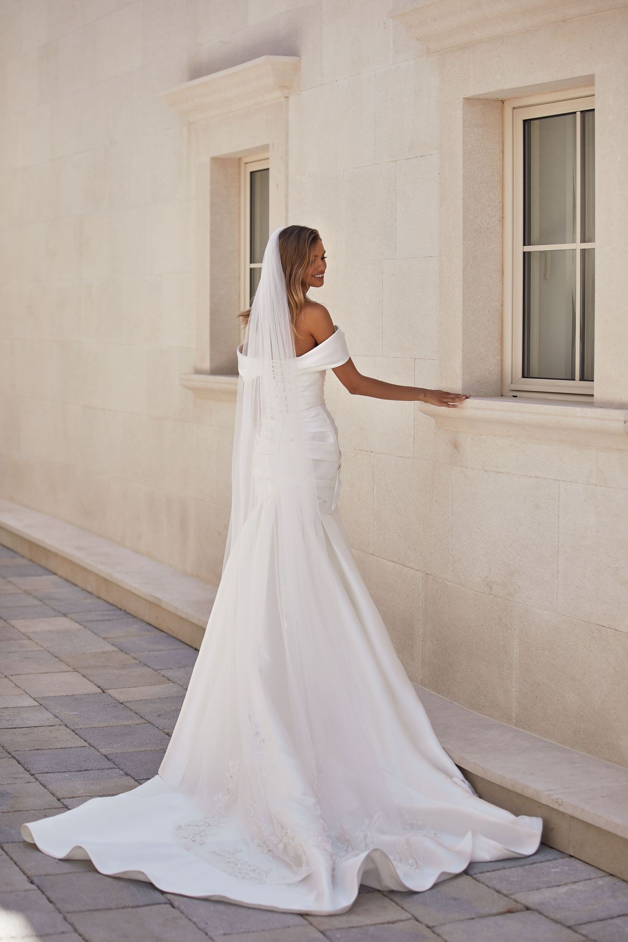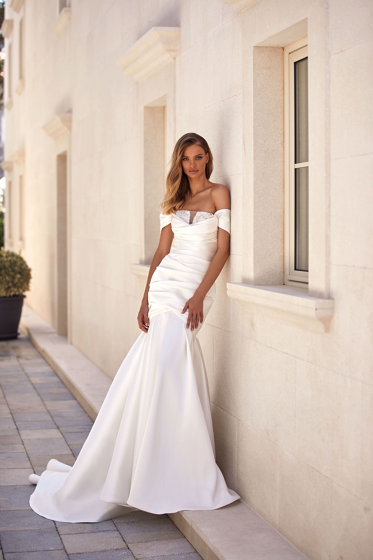 Mermaid mikado ivory wedding gown with off-the-shoulders short sleeves. Corset has a small slit in the neckline, and a lace-up closure on the back.