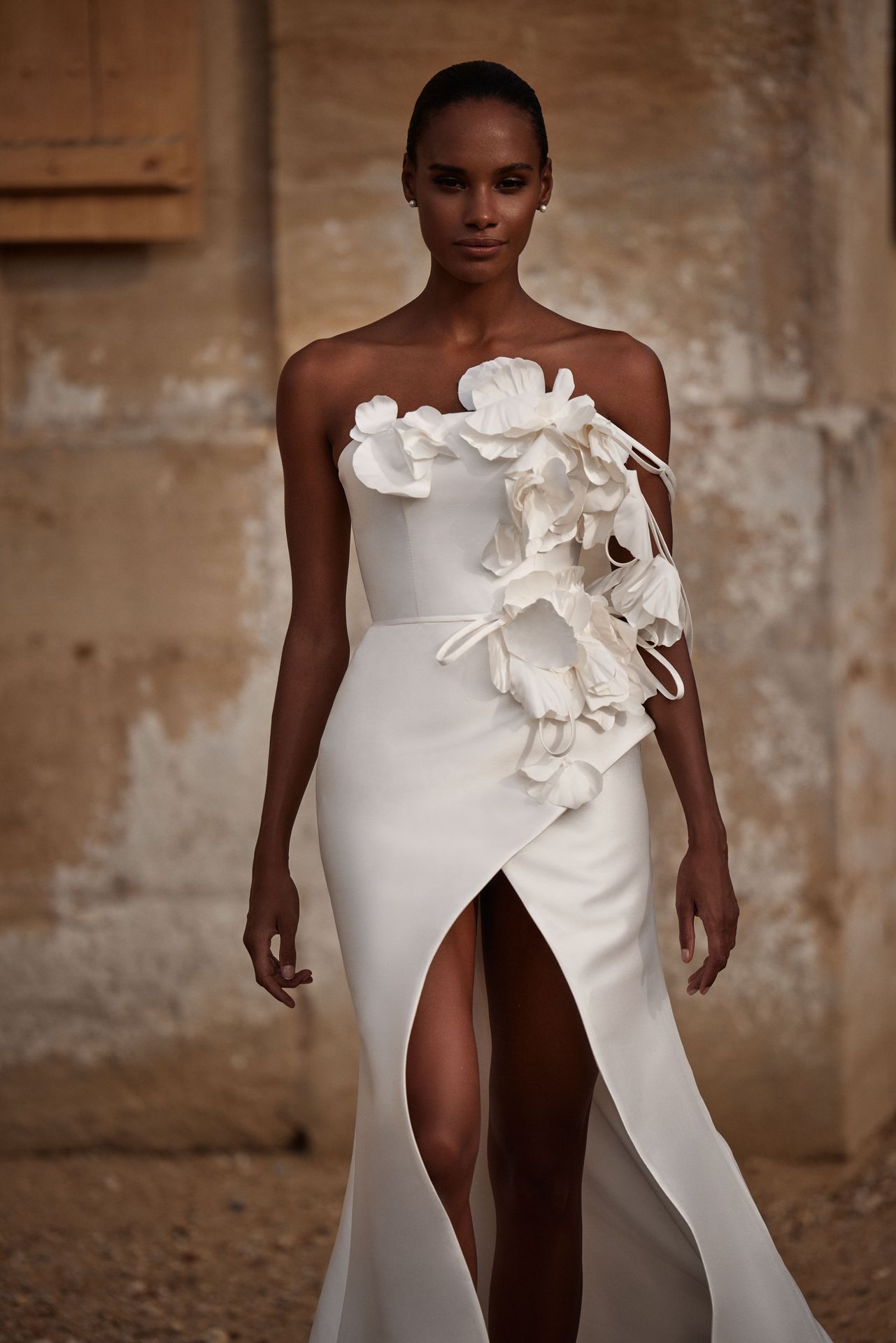 Chic one-strap mikado wedding gown in ivory with an alluring high slit, boned bodice, and lace-up closure on the back. Voluminous 3D flowers take this gown to completely another level.