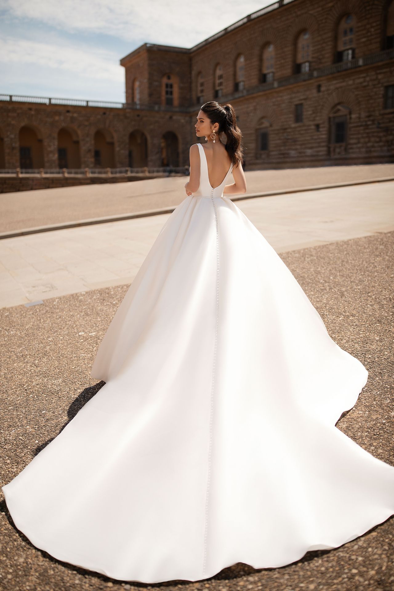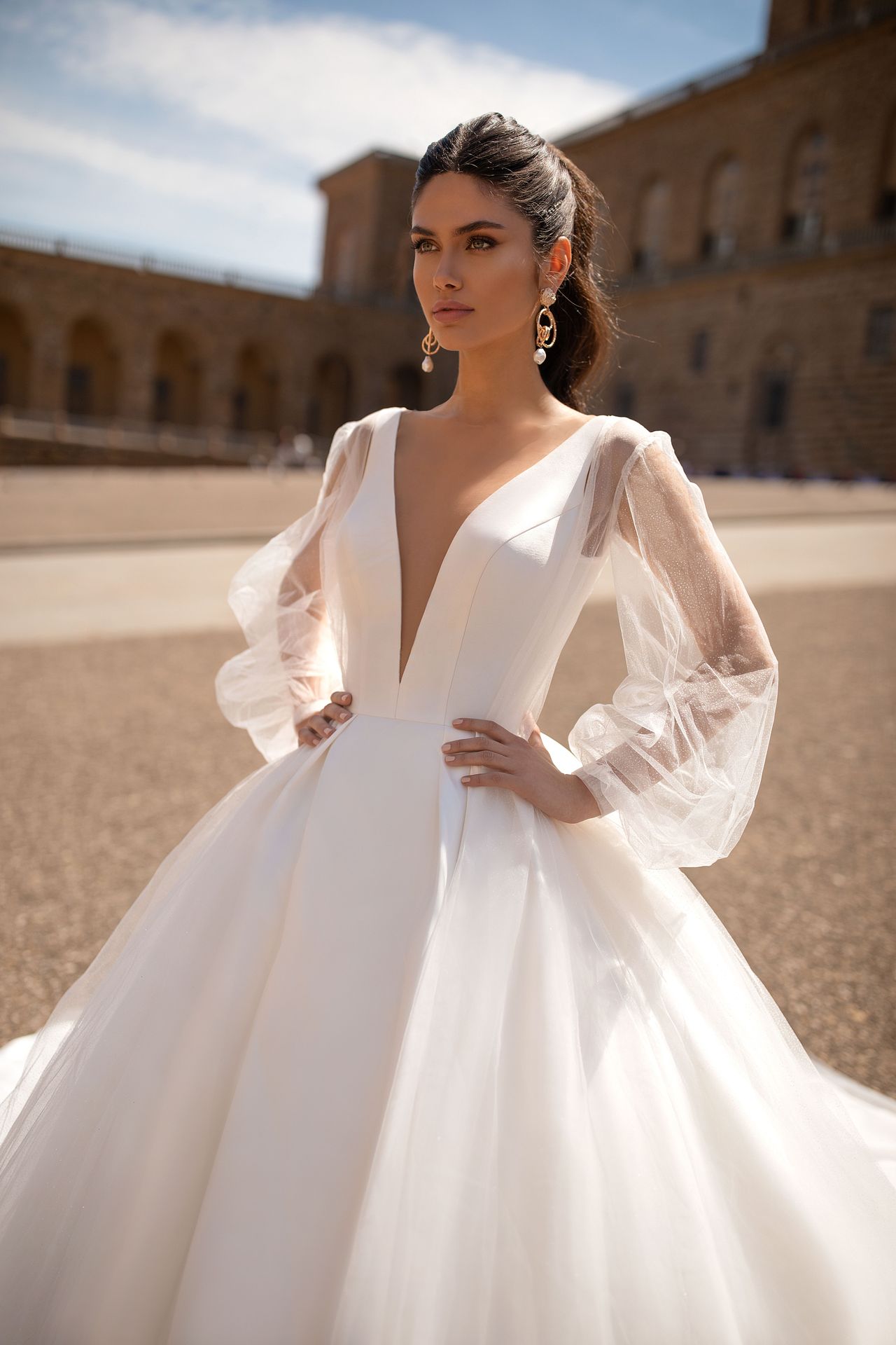 Strapped showstopper mikado ball gown with a daring plunging neckline, open back, and a gorgeous long train. Can be complemented with a puffy long-sleeved tulle cape.