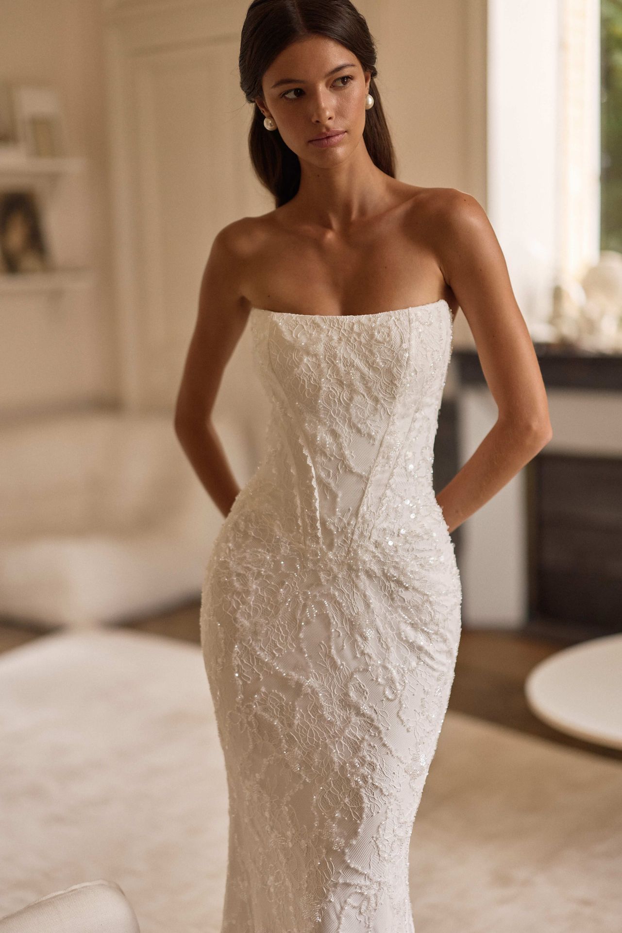 Sensual wedding gown that blends vintage elegance with contemporary allure. Crafted from delicate lace and adorned with glimmering sequins, this fitted silhouette celebrates the feminine form. The structured corset bodice features visible boning for a sculpted effect, while a soft, draped neckline gently falls off the shoulders, adorned with a delicate knot detail at the center, adding a subtle touch. The draped detail on the decolletage is detachable, allowing for a more minimalist and sleek silhouette.