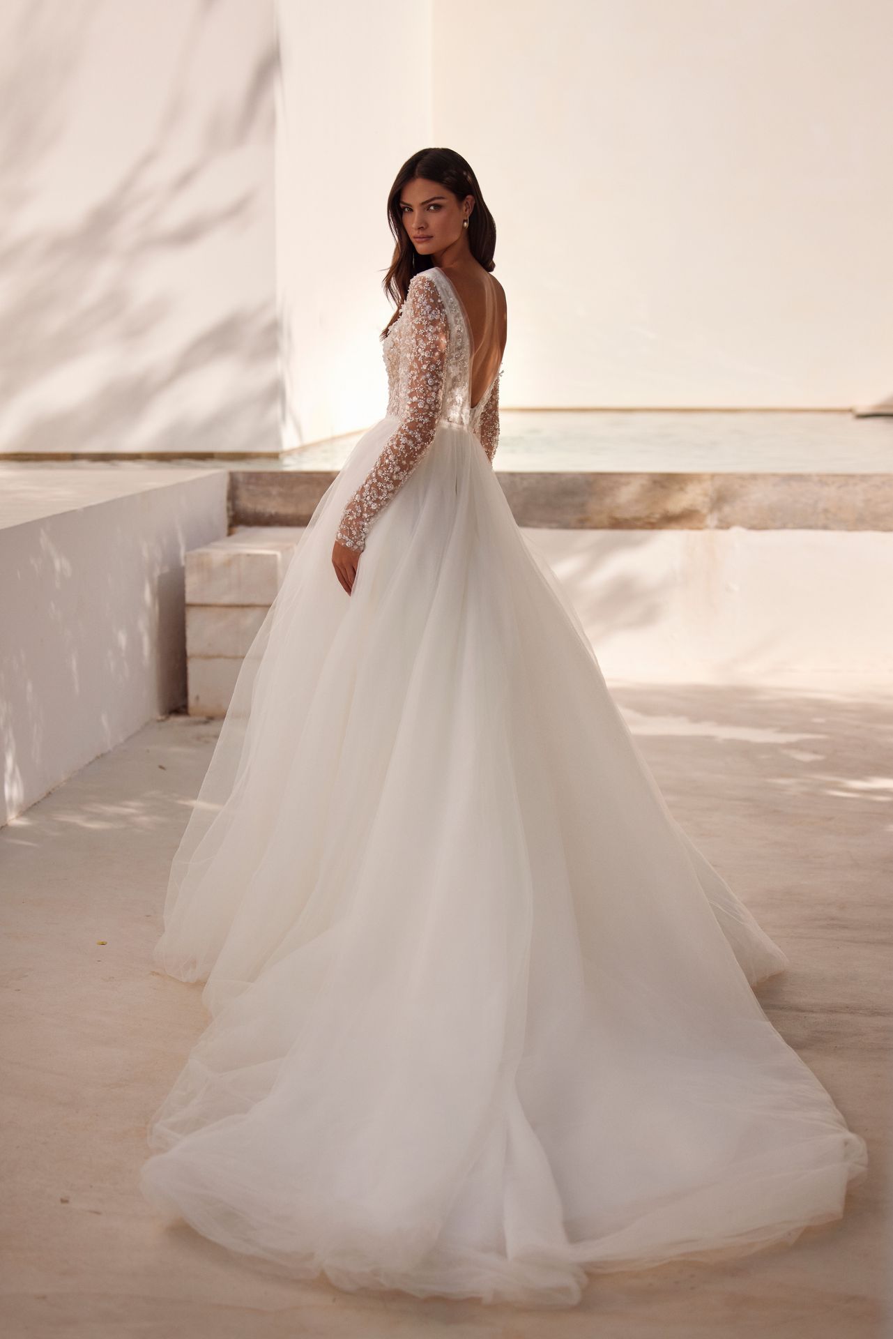 Enchanting A-line wedding gown with a sheer effect for maximum appeal delicately sprinkled with flower lace applique. Featuring a plunging V-neckline, sheer long sleeves, an open back, and a puffy princess tulle skirt with a long train.