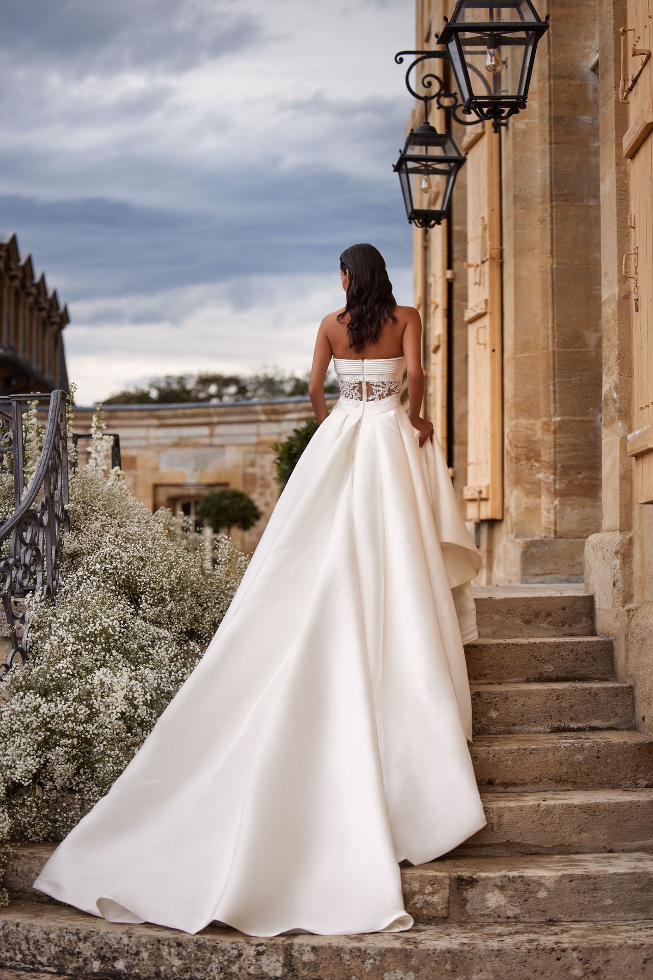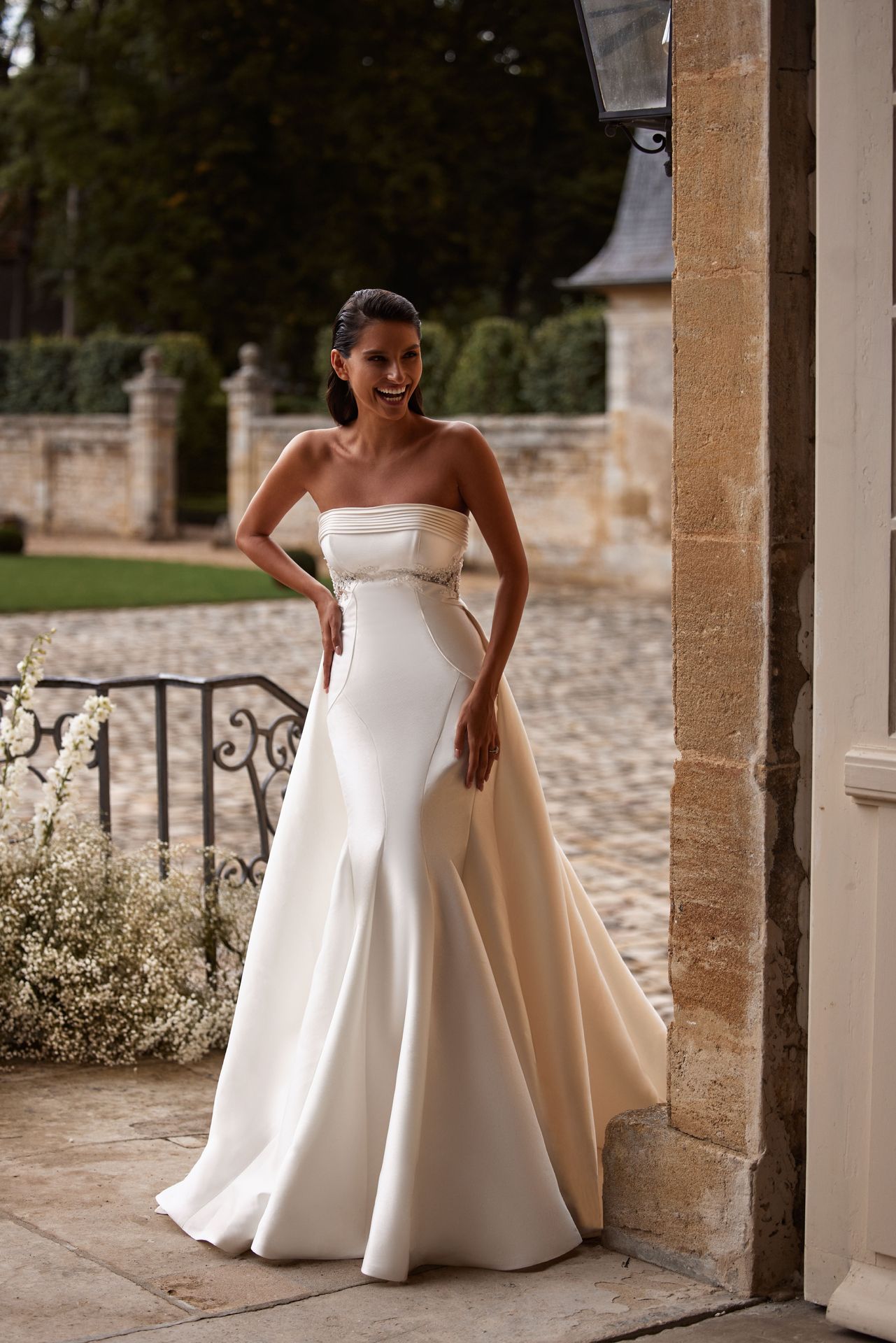 Sophisticated strapless mermaid silhouette gown in mikado. Featuring a renaissance-inspired cut-out at the waistline embellished with sequined ornament, and a long maxi flaring skirt.