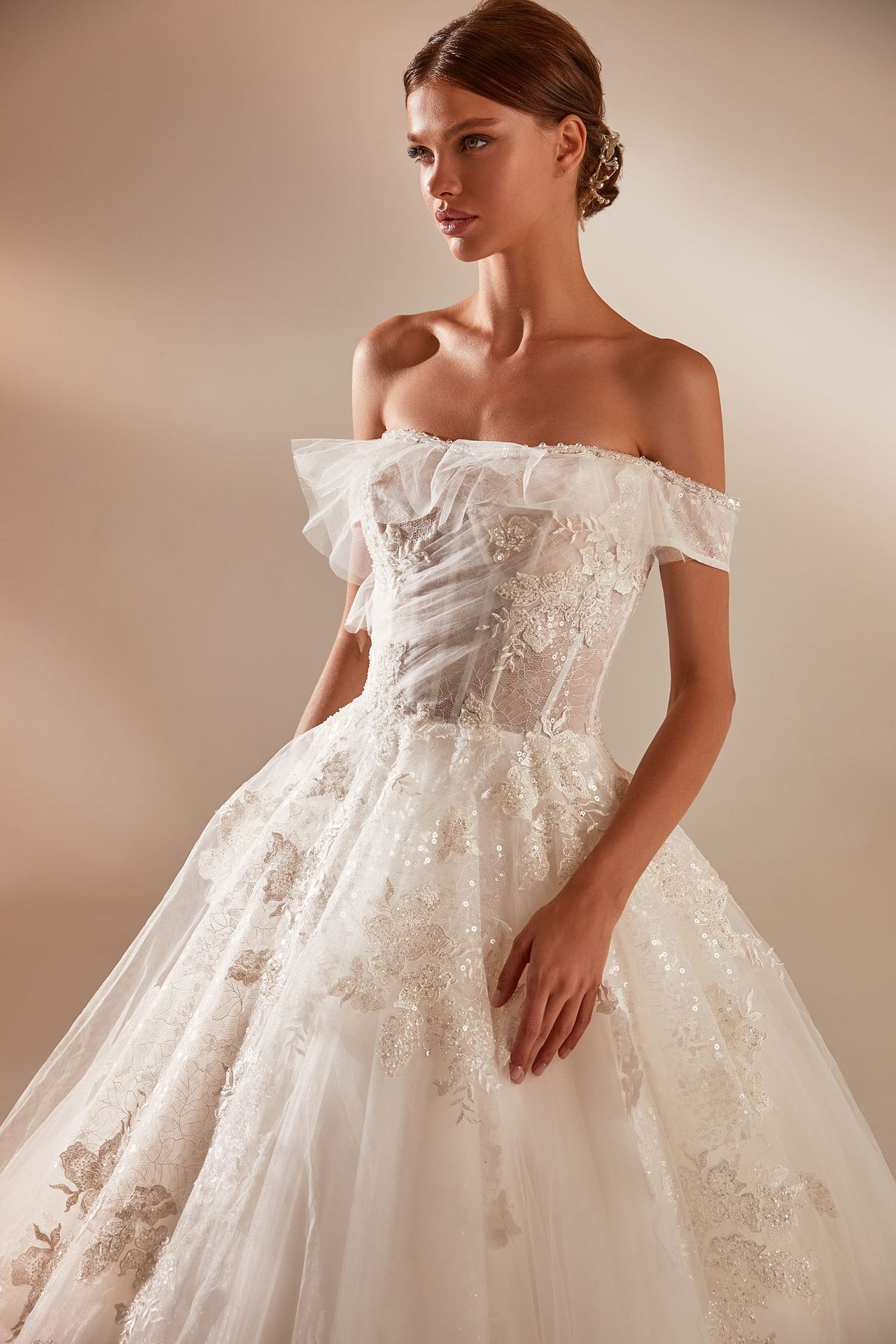 Off-the-shoulder princess wedding gown with a ruffle corset, a lace-up closure on the back, and a mesmerizing long train. The gown is generously decorated with sequins and floral lace embroidery.