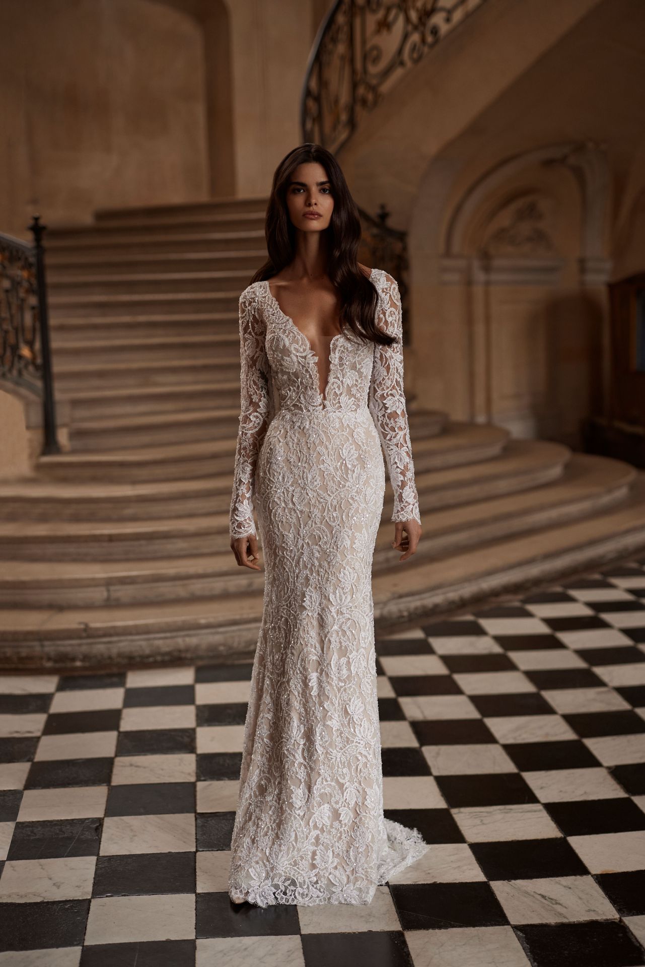 Astounding long-sleeved wedding gown cut from lace with a floral pattern and hand-embellished with sequins. Featuring a semi-transparent top with a plunging daring illusion neckline, sheer floral long sleeves, a button-up illusion open back, and an elegant fitted skirt with a nude lining and a short train.