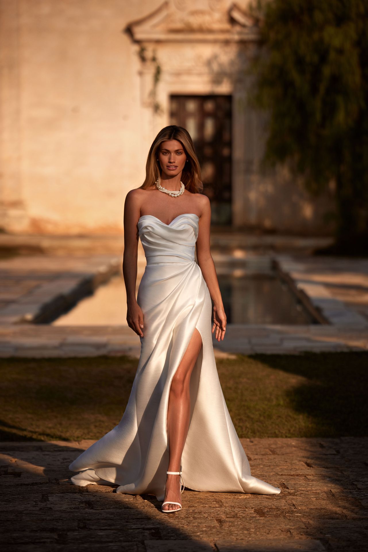 Chic sleeveless mermaid gown crafted from mikado with masterful exclusive drapery. Featuring a heart-shaped neckline and impeccably draped waist flowing into a skirt with a daring thigh slit and a long train.