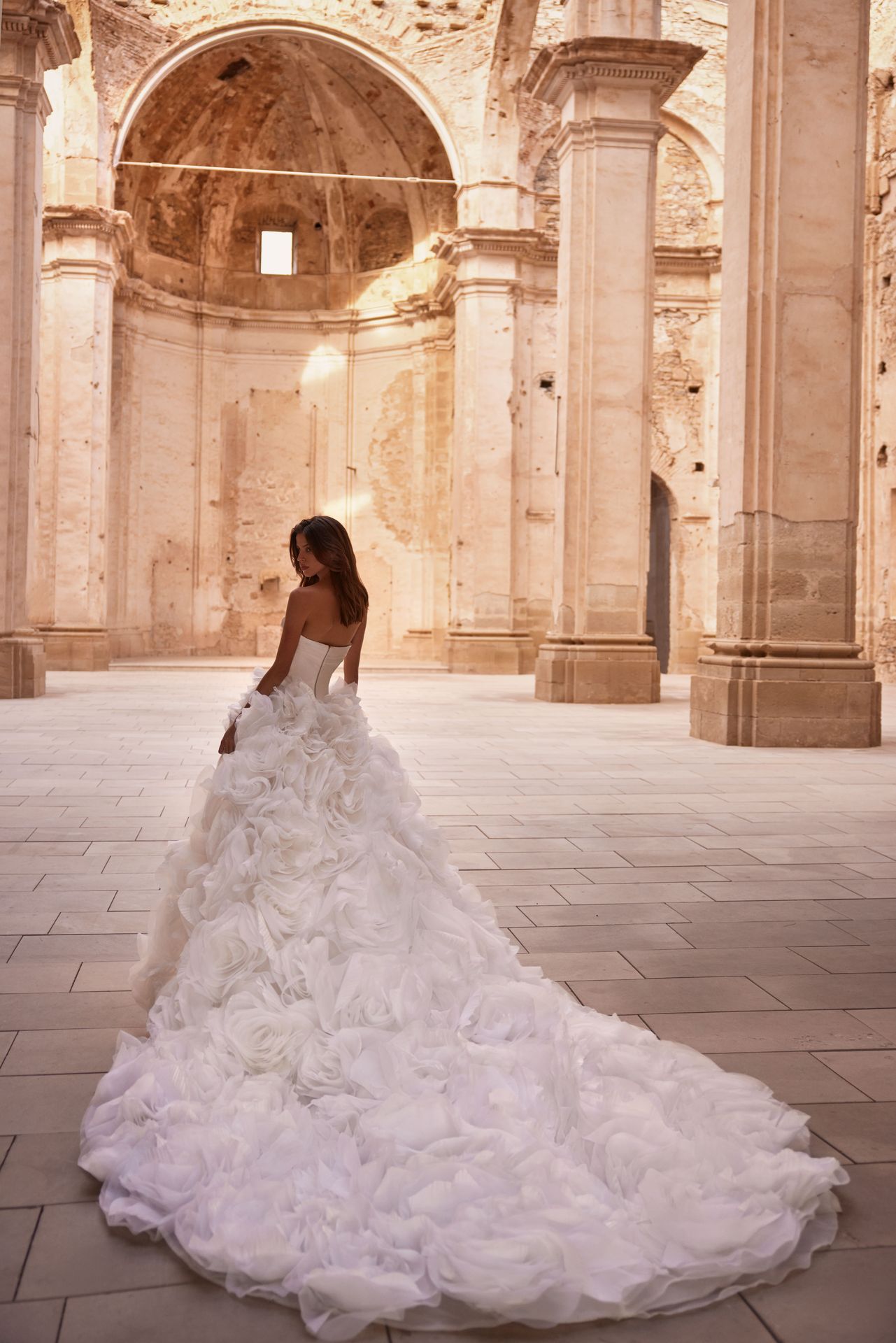 Attention-stealer wedding gown with an extremely volumetric skirt with a midi train. Featuring a satin doubled corset on a zipper, with an additional shaping corset sewn in, and a lush voluminous skirt with a front slit handcrafted from dozens of organza layers fashioned into flowers.