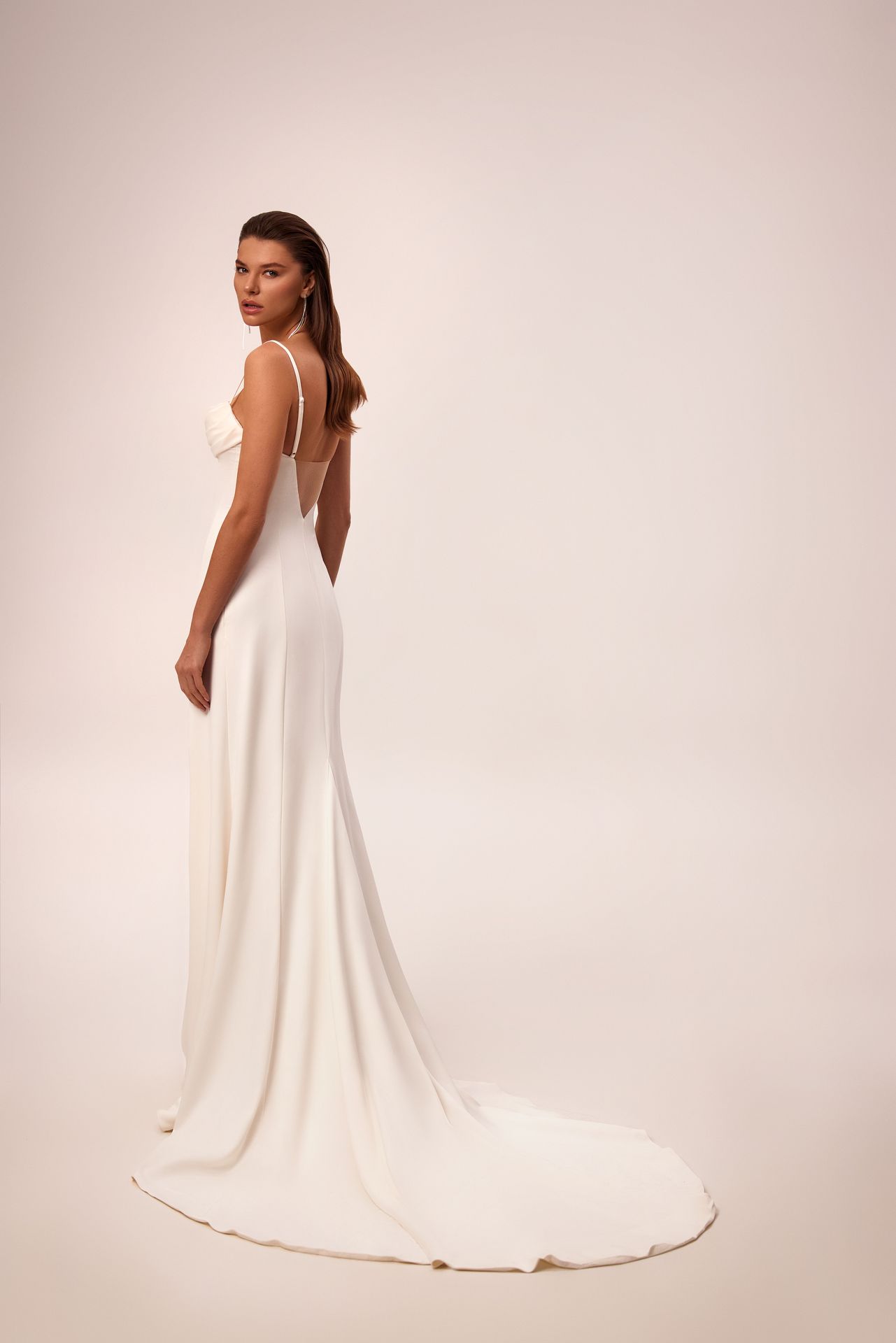 Refined spaghetti straps mermaid gown fashioned from stretchy satin. Featuring a floor-length fitted silhouette with a draped straight neckline on a boned corset, a deep V-open back, and a long flow train.