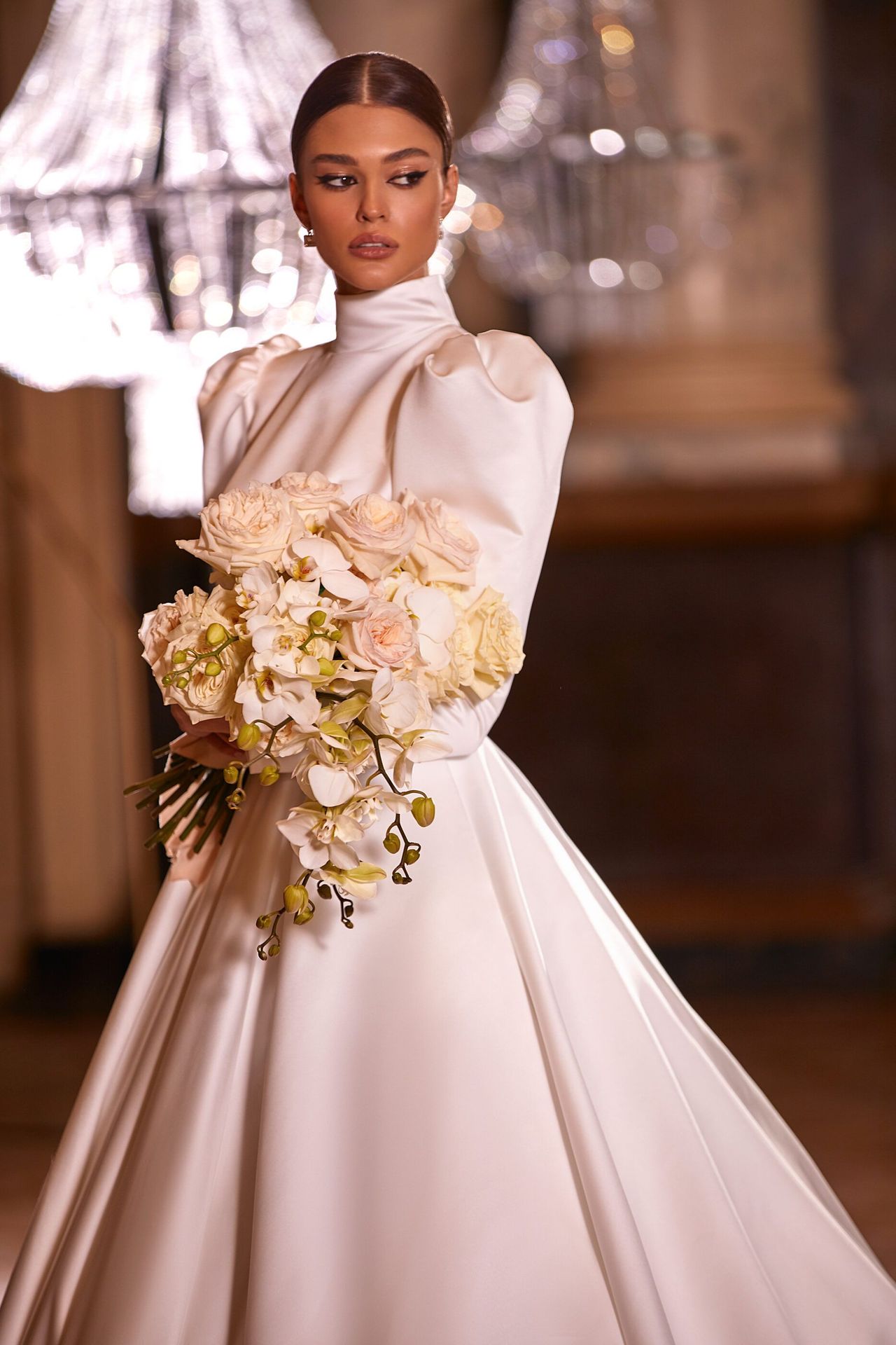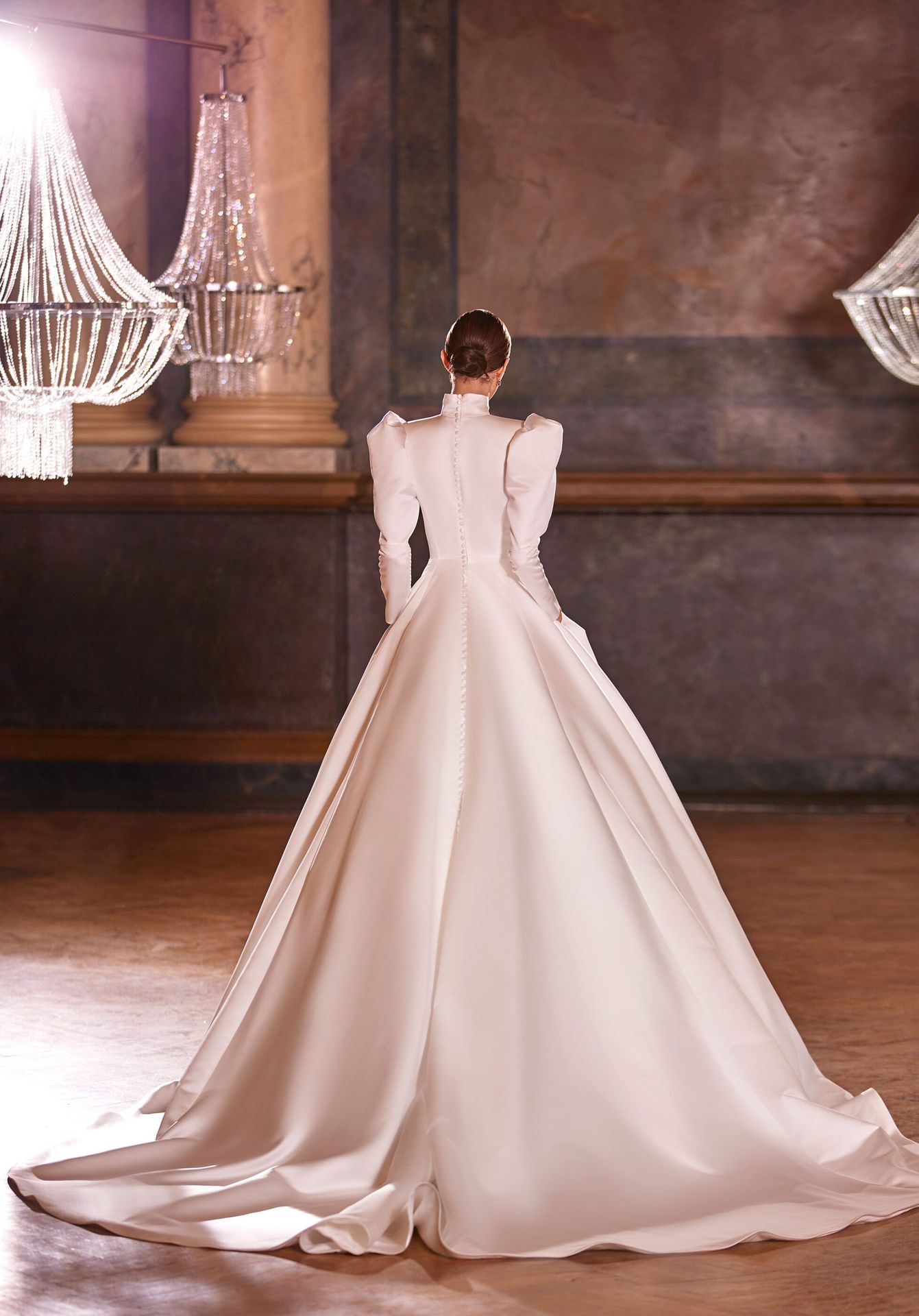Statement satin wedding ball gown in white. Features a turtleneck, ‘leg of mutton’ long sleeves, full skirt, button back, and a long train. Can be combined with a detachable embellished colour to achieve a fully royal look.