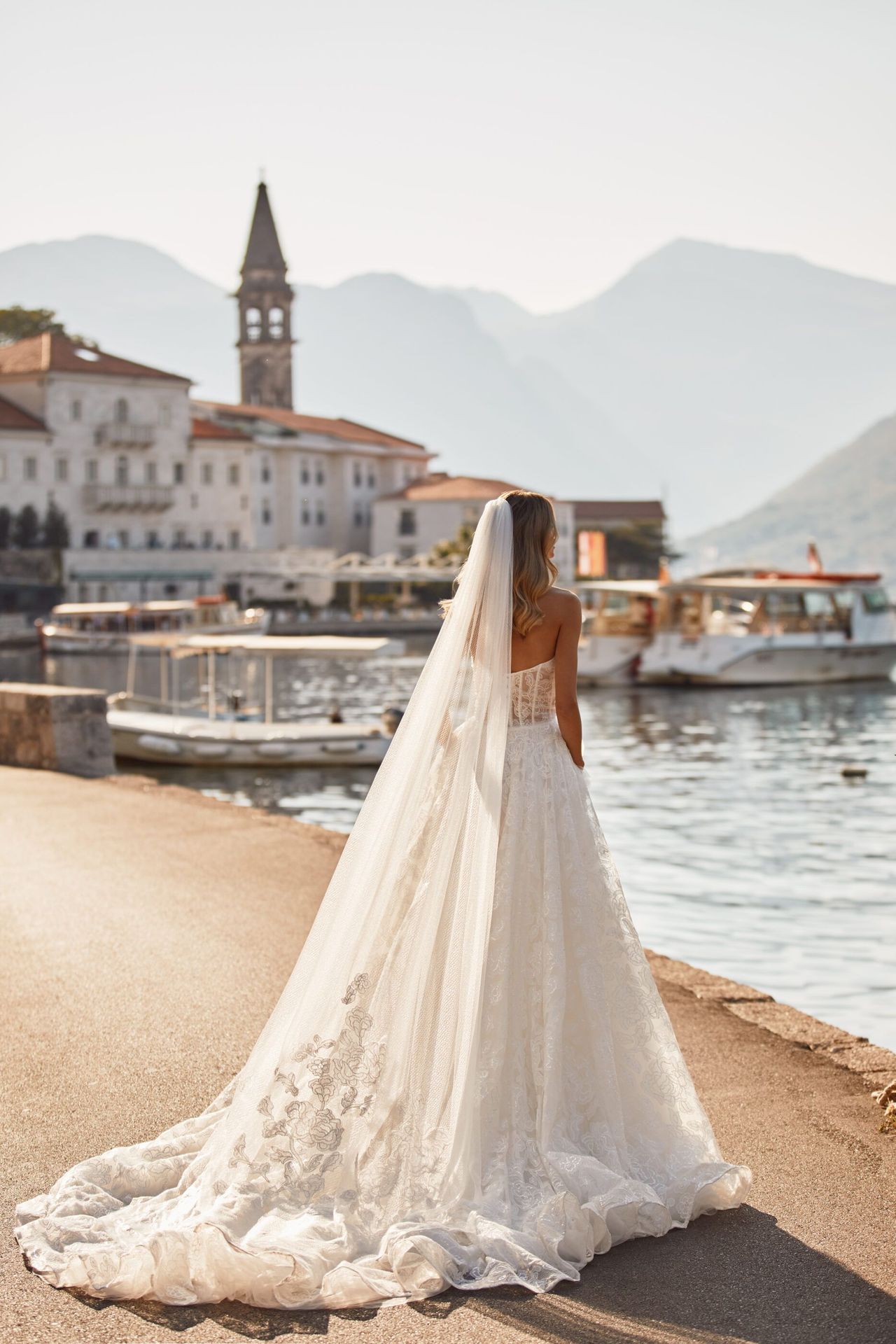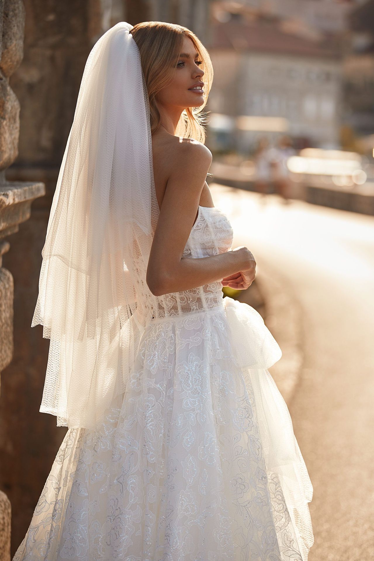Lavishly strewn with lace flowers along the entire length gown in ivory color with a sharp-cornered corset and lace-up closure on the back. The gown comes with detachable off-the-shoulder accessory.The look can be complemented with Ginevra veil or Ginara veil.