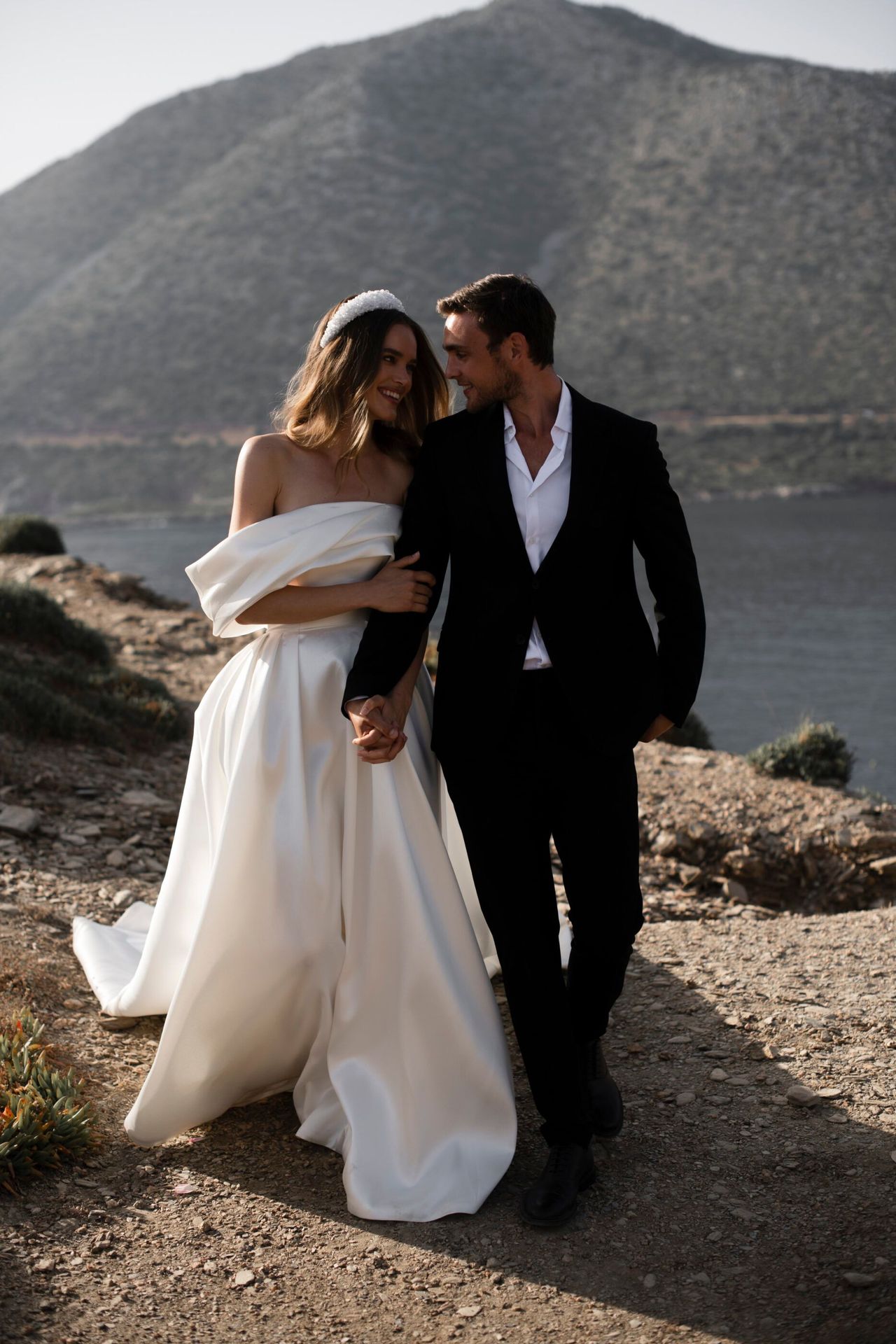 Royal satin ball gown in ivory with an off-the-shoulder, bow-tie bodice. Features a partially lined full skirt with a long train.