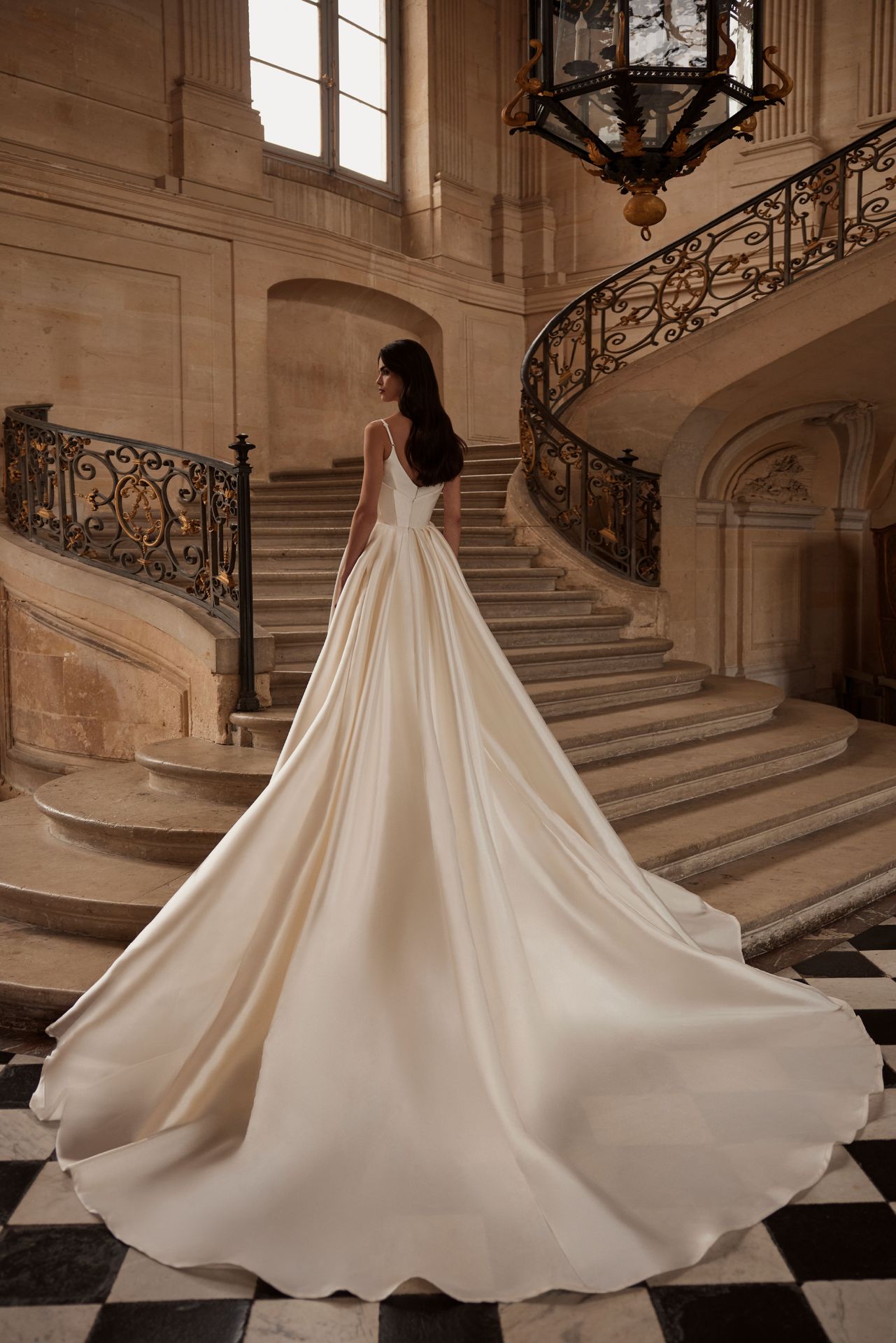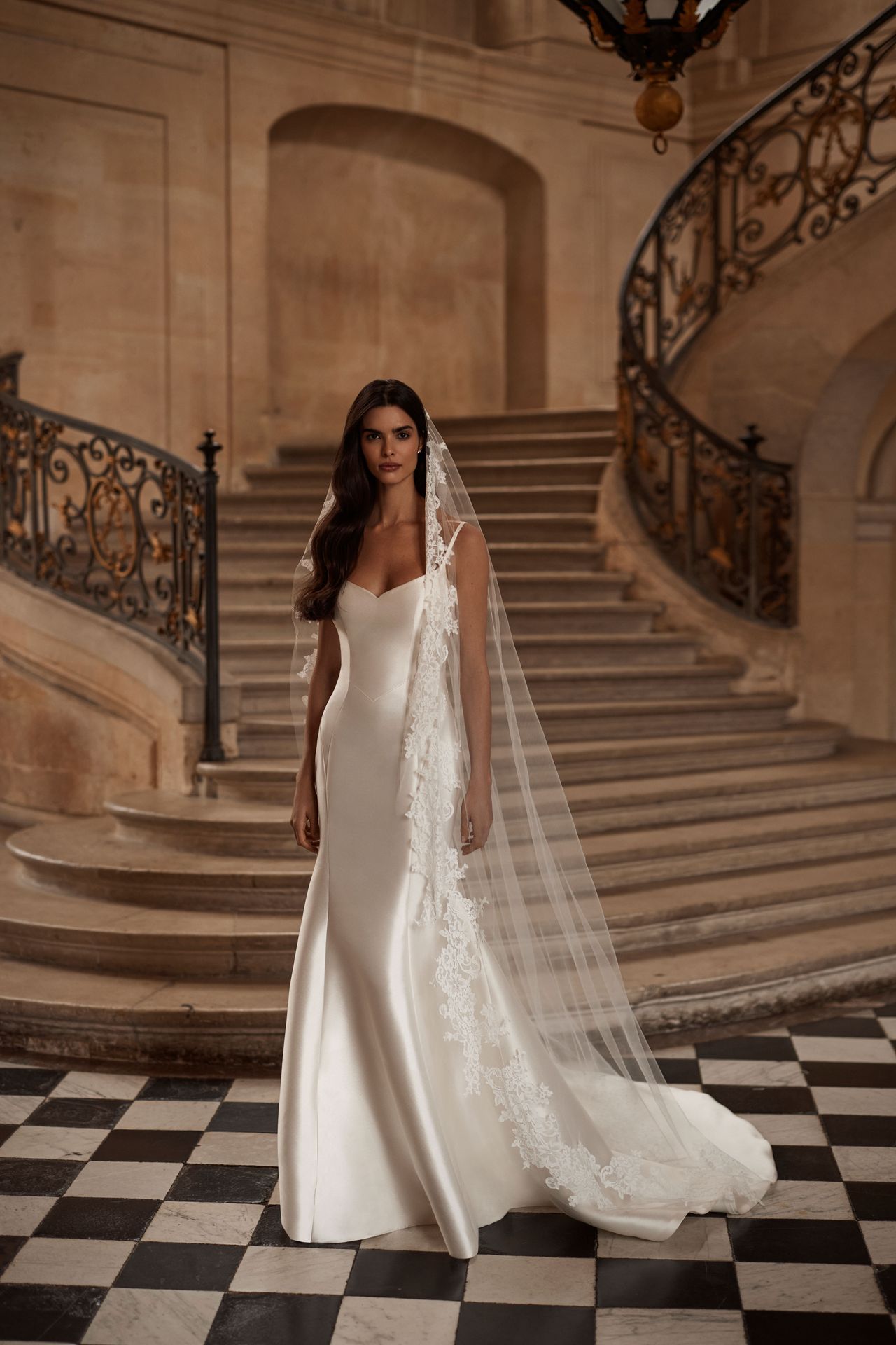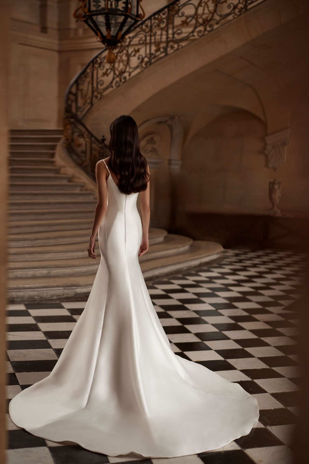 Spaghetti strap mermaid wedding gown made of mikado. Featuring a heart-shaped corset bodice, spaghetti straps, stitched lines along the fitted skirt that accentuate curves, and a flowing midi train. The outfit might be completed with a stunning cover dress Raimonda that boasts off-the-shoulder mikado sleeves and a long majestic train.