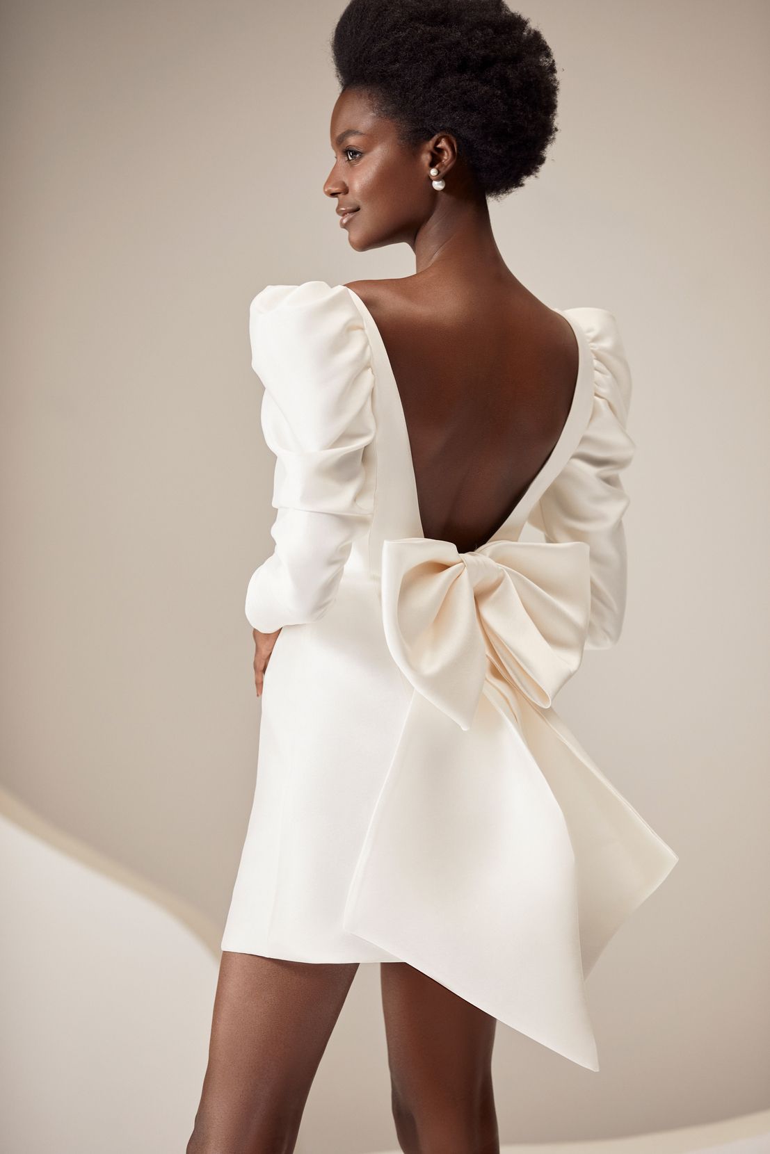 Mikado mini wedding dress with puffy long sleeves, square neckline and open back. Complemented with beautiful detachable bow.