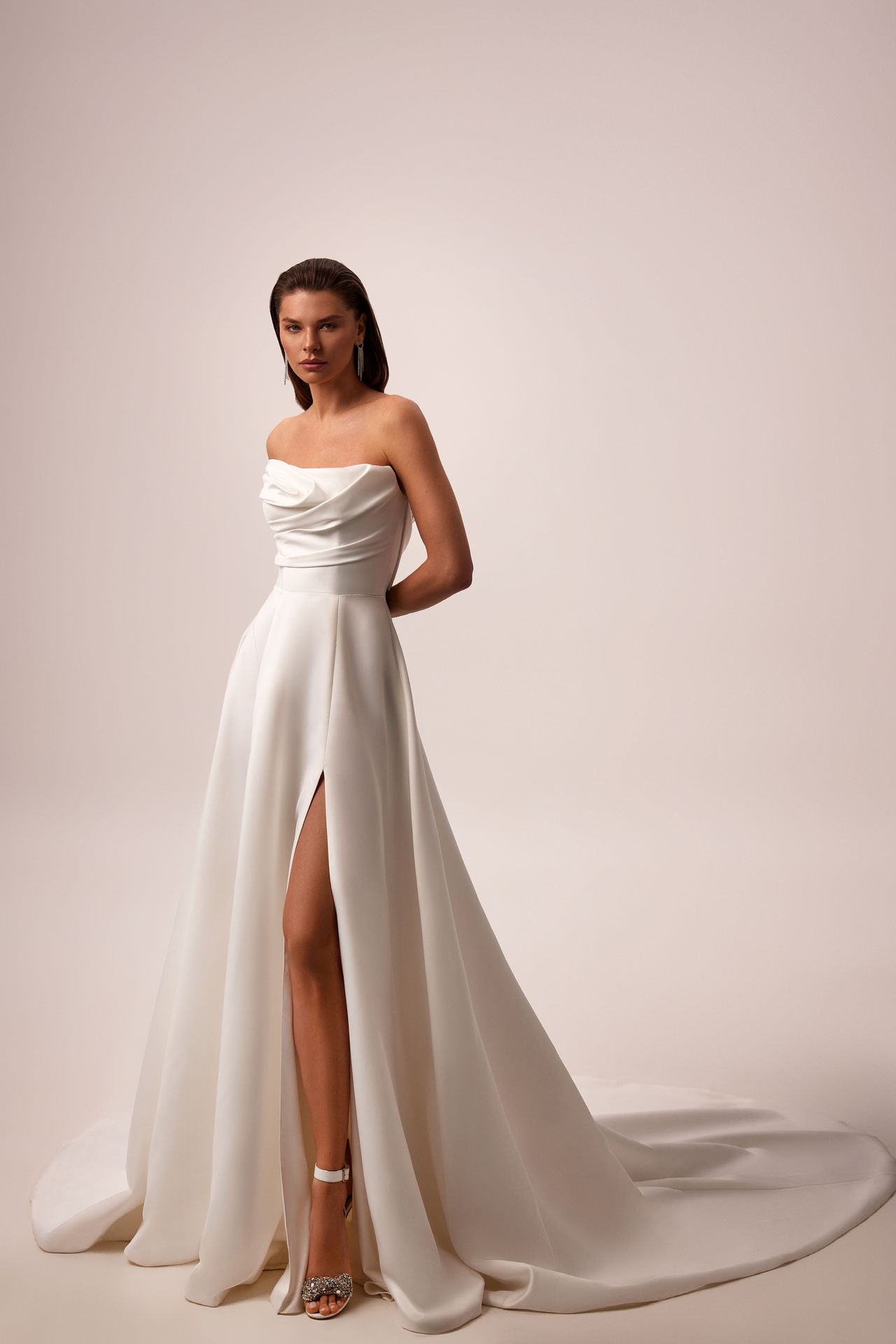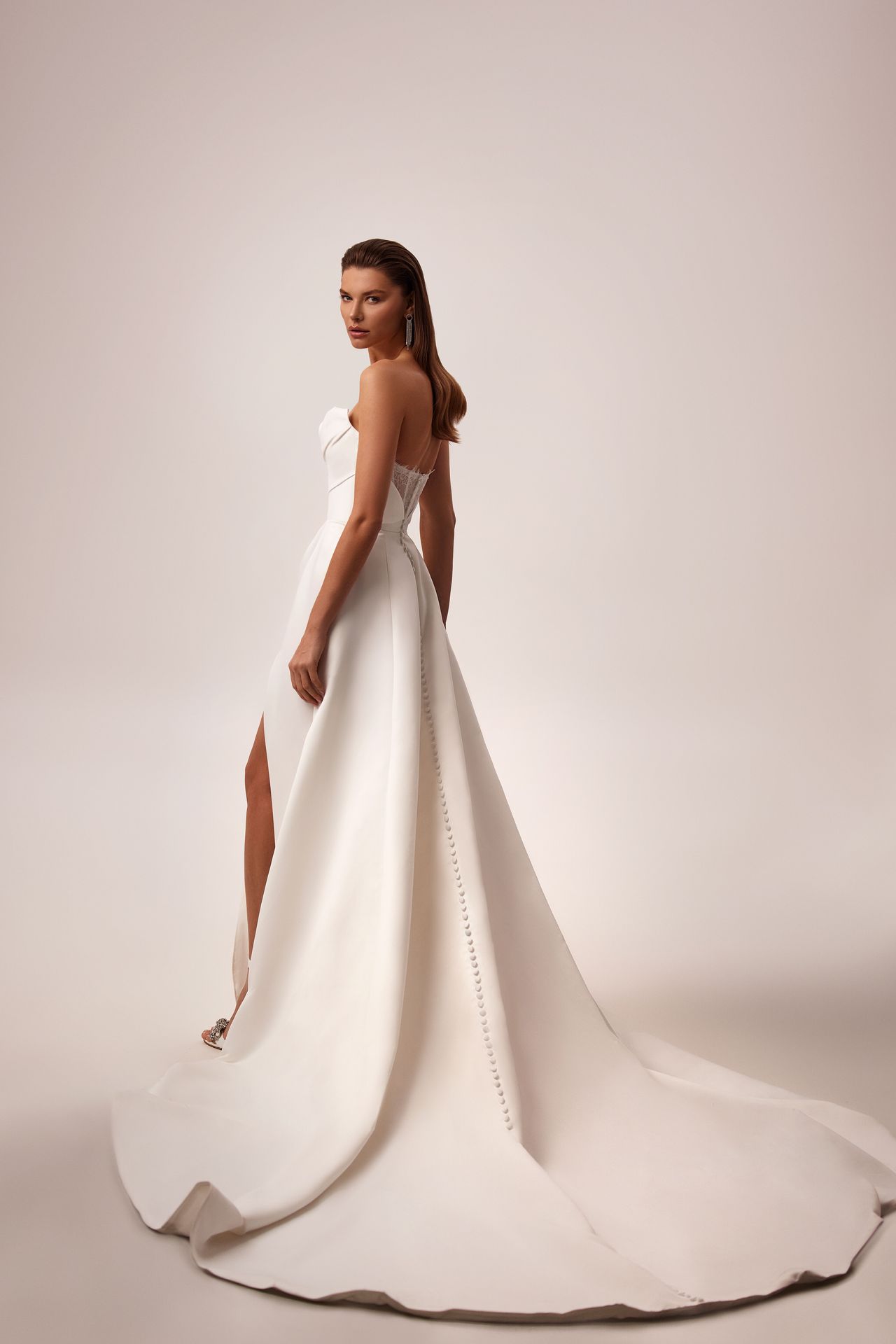 Ravishing strapless A-line wedding gown made from satin. Featuring a ruched strapless bodice with a chantilly lace insert on the buttoned back, and a full princess maxi skirt with a high slit and a long opulent train.