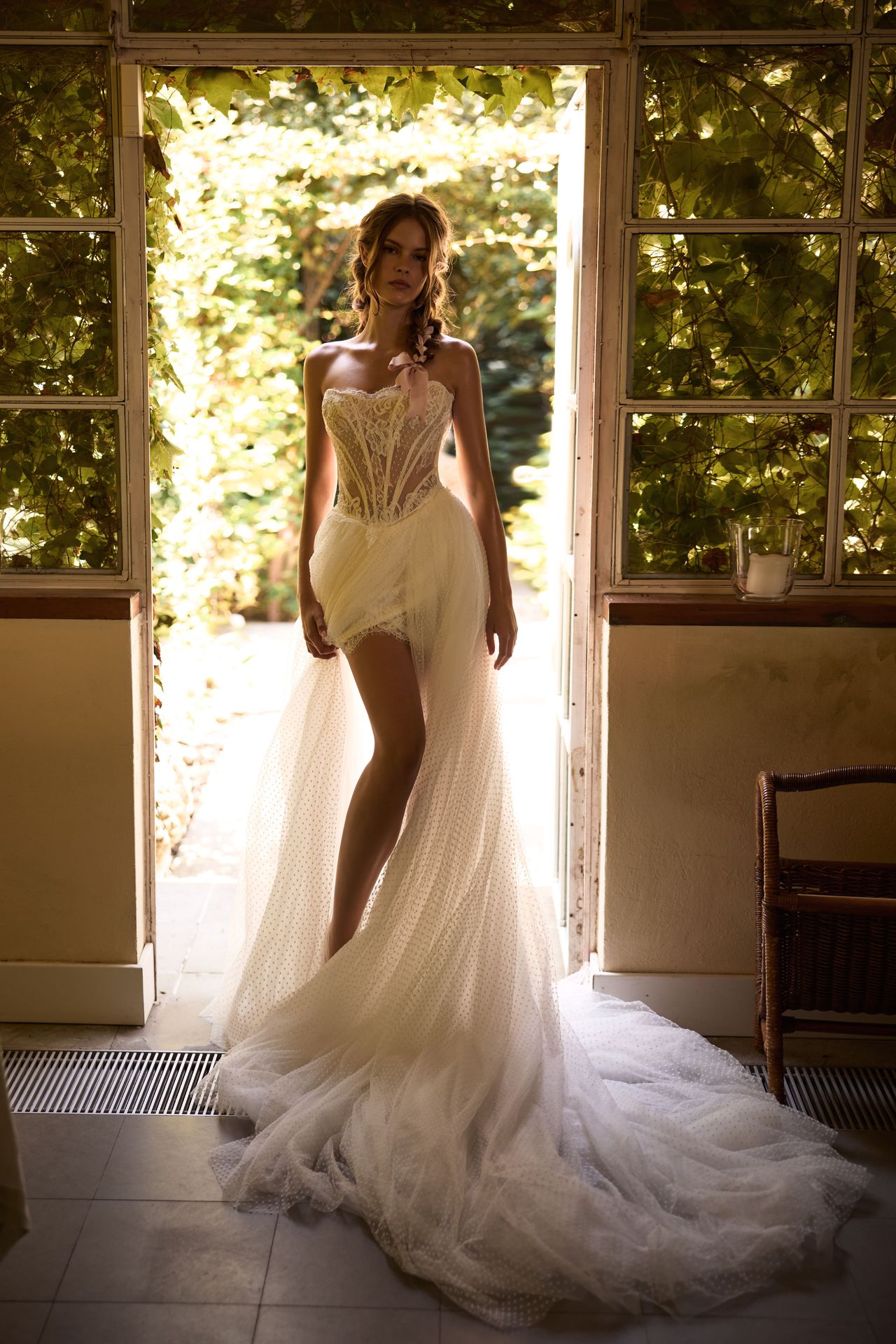 Bohemian A-line wedding gown made of lightweight dotted tulle adorned with lace ornament. The strapless design showcases a heart-shaped neckline, fitted boned bodice with delicate floral lace, zip closure back, and a flowing dotted tulle skirt with a high side slit that reveals soft lace detailing underneath. Includes matching panties in the set.