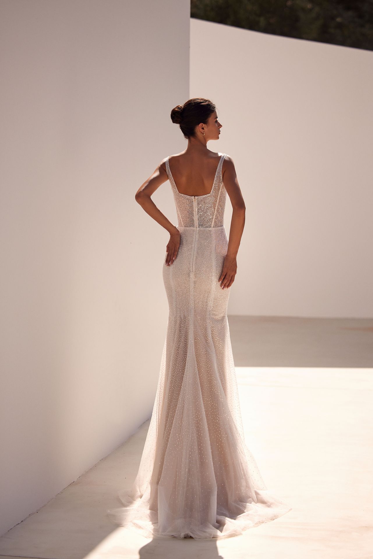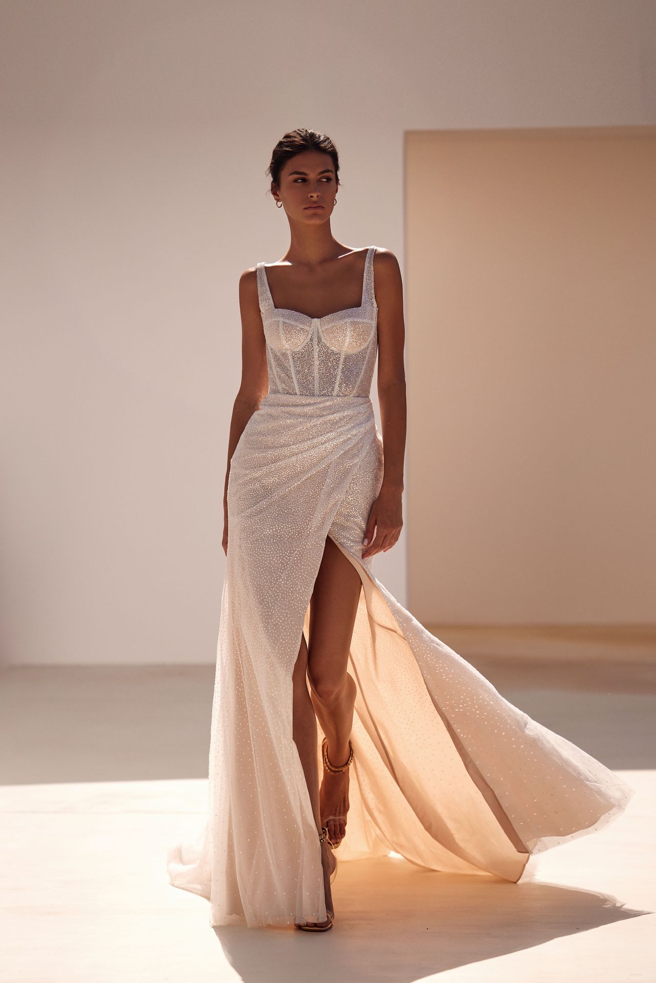 Exceptional sheath sparkling semi-transparent wedding gown on spaghetti straps. Featuring a sweetheart neckline with built-in cups, a boned corset with lace-up or zipper closure on the back, and a wrapped skirt with a daring side slit and a midi train. Comes with a built-in ivory underskirt.
