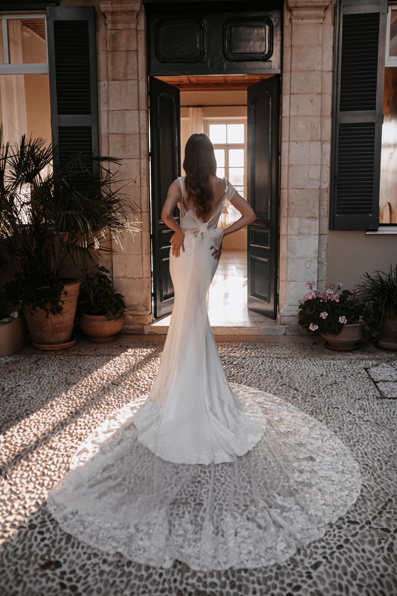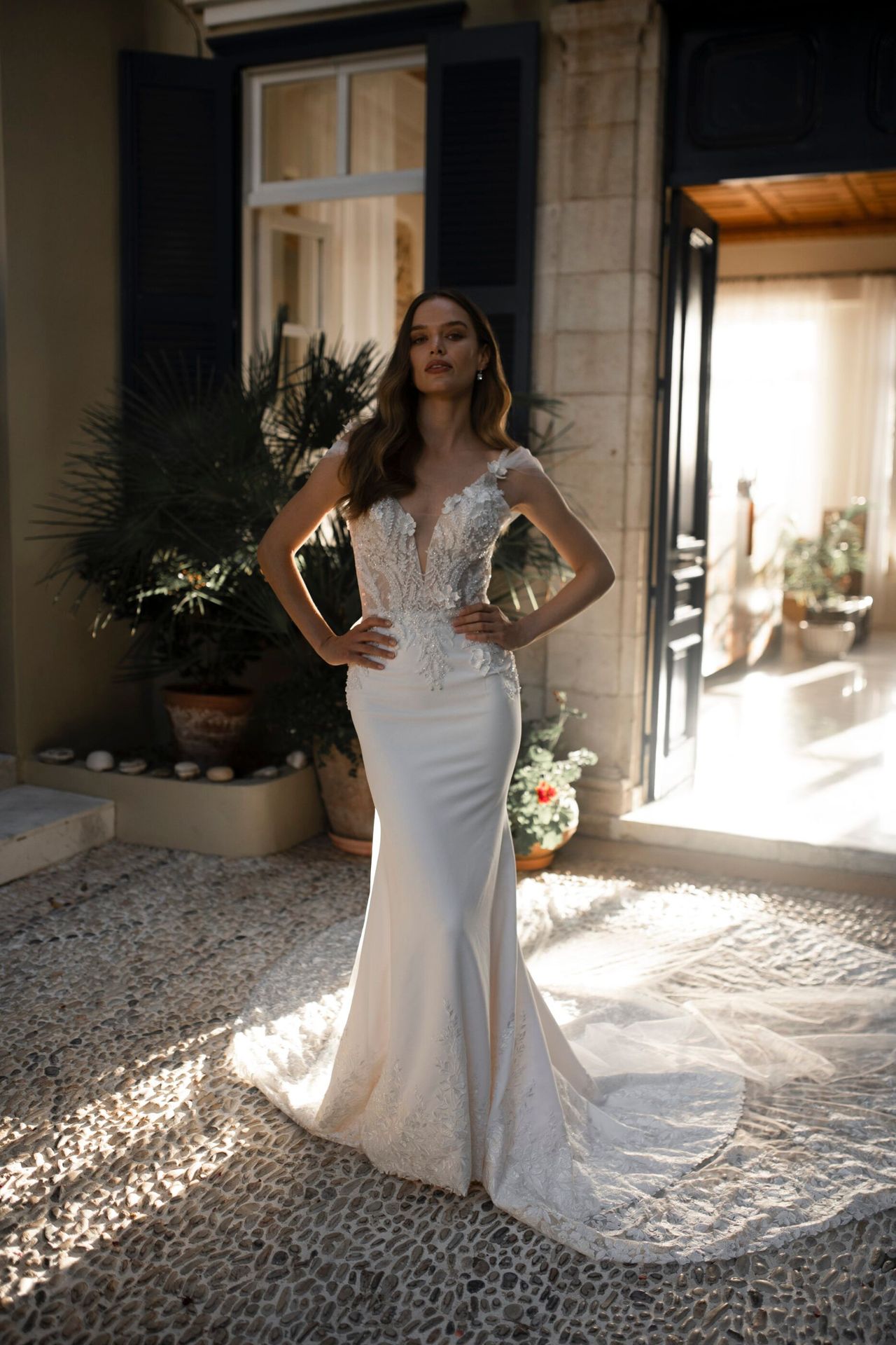 Delicate spaghetti strap wedding dress in ivory colour. Features a lace-applique bodice with a plunging heart-shaped neckline and a maxi mermaid skirt with a long cathedral train.