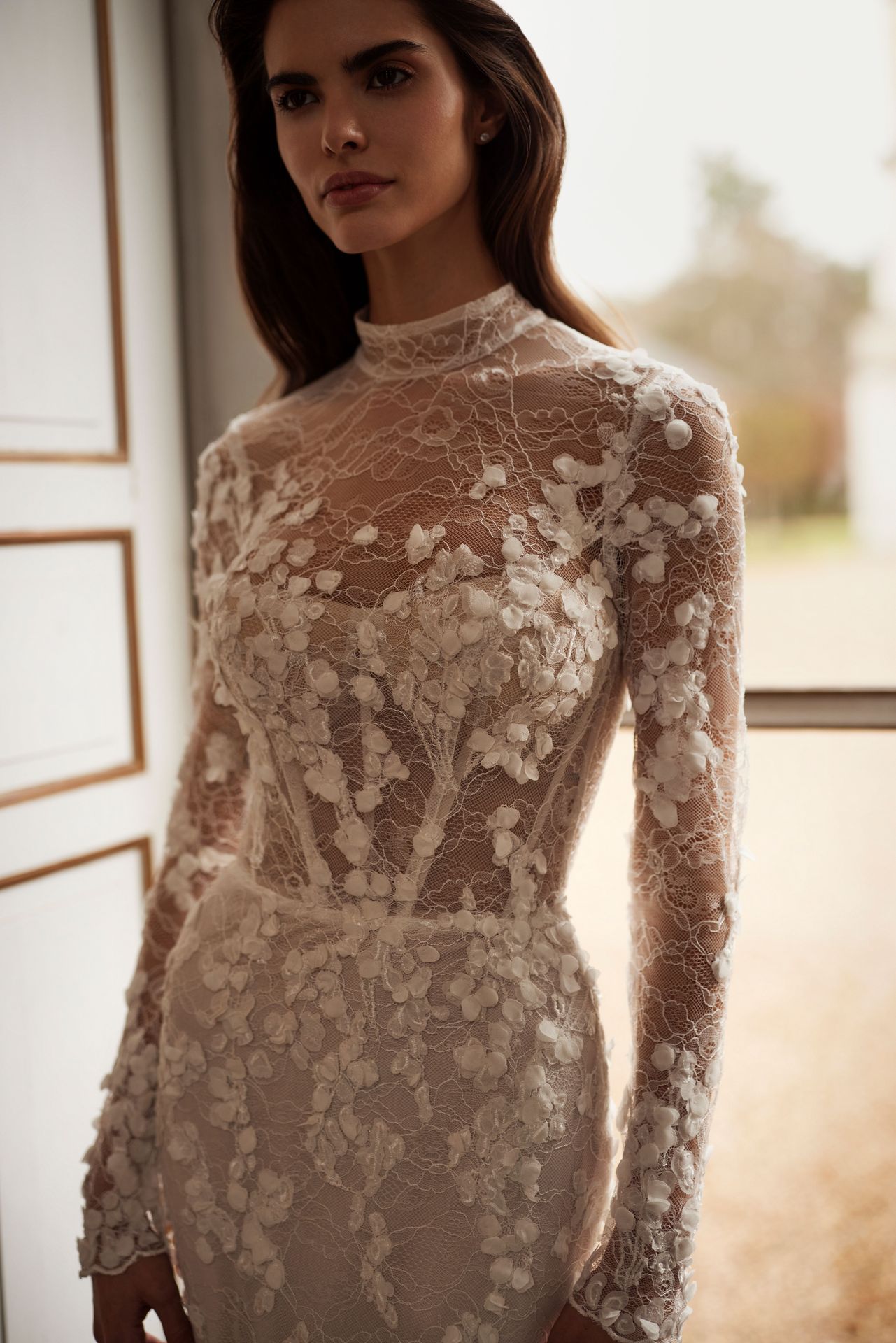 Delicate semi-transparent long-sleeved gown with a fitted sheath silhouette made of chantilly lace, adorned by hand with sequins and 3D flower applique embellishments. Featuring a turtleneck, boned corset with built-in cups, sheer long sleeves, button back, and a fitted skirt with nude lining and a short train.