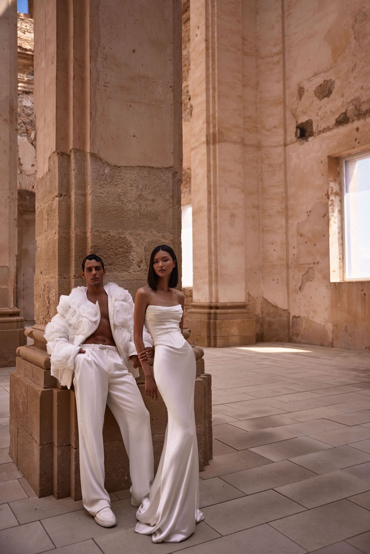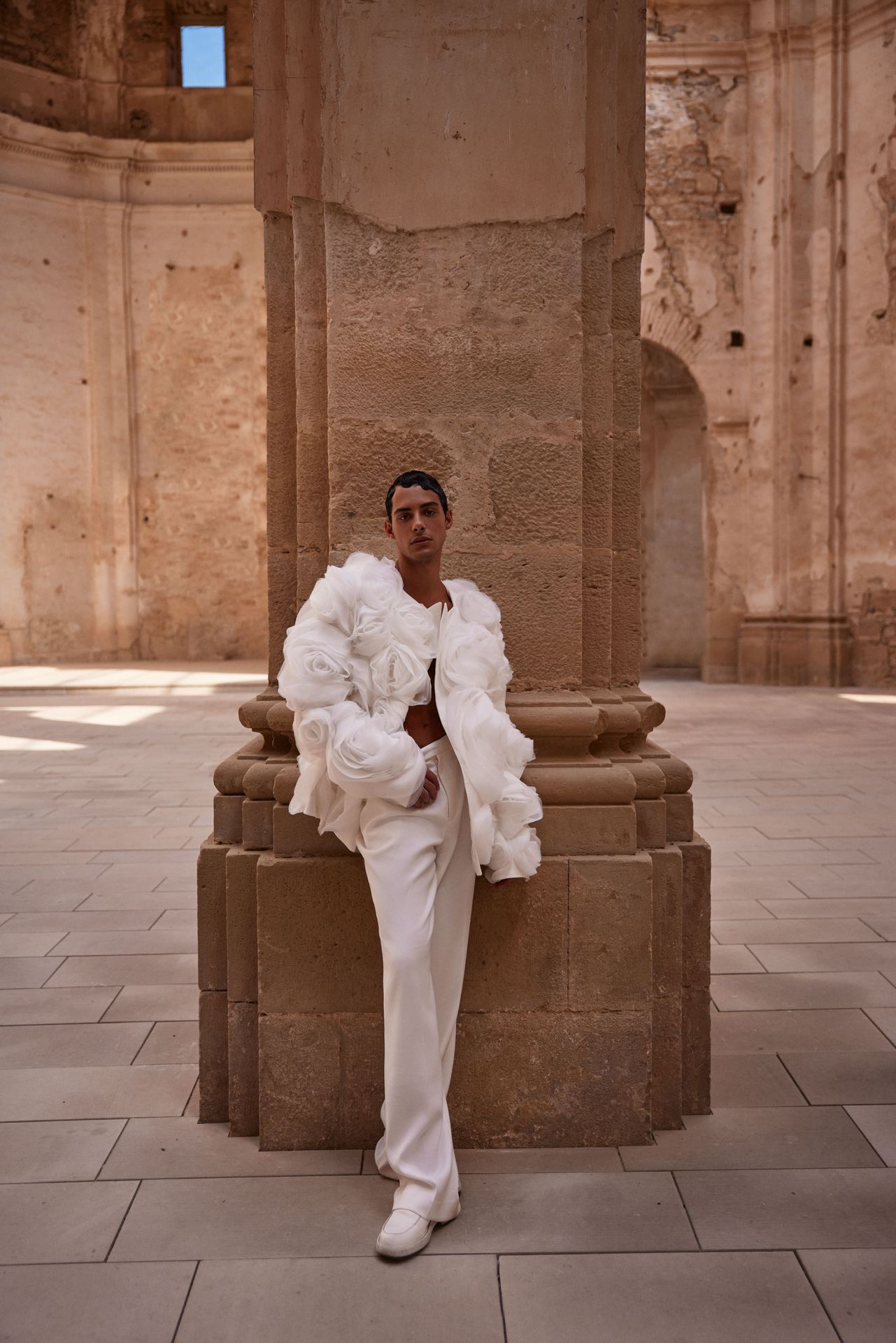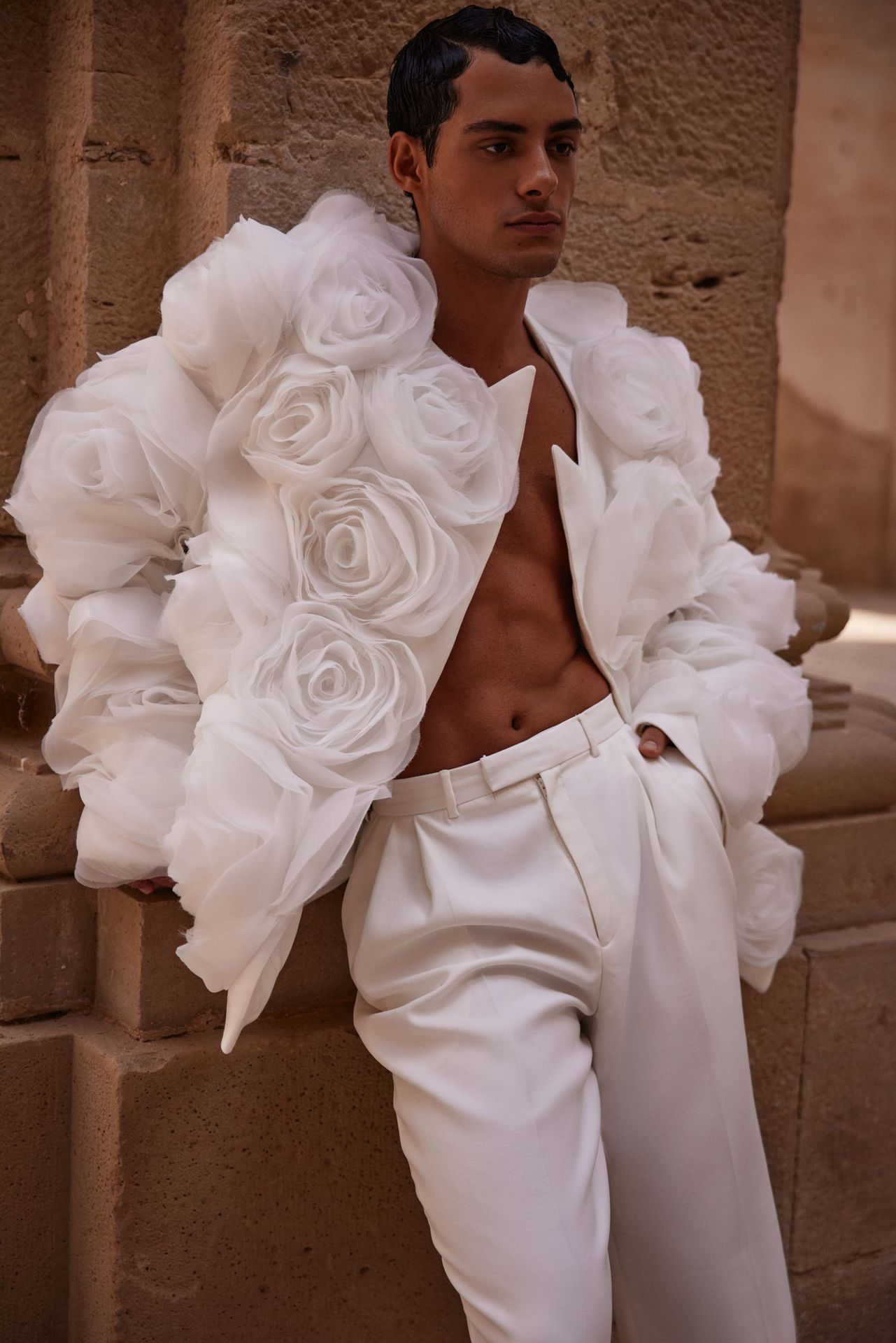 Extravagant unisex blazer with out-of-the-ordinary volumetric organza tulle flowers fashioned by hand.