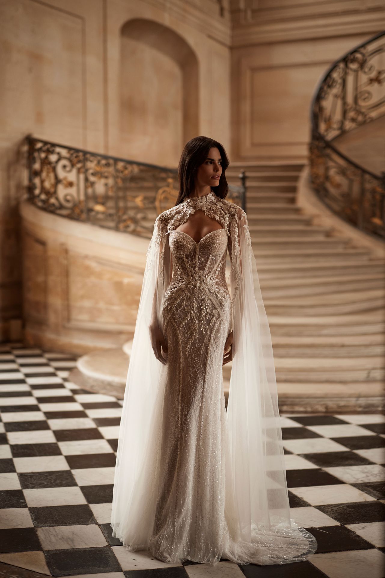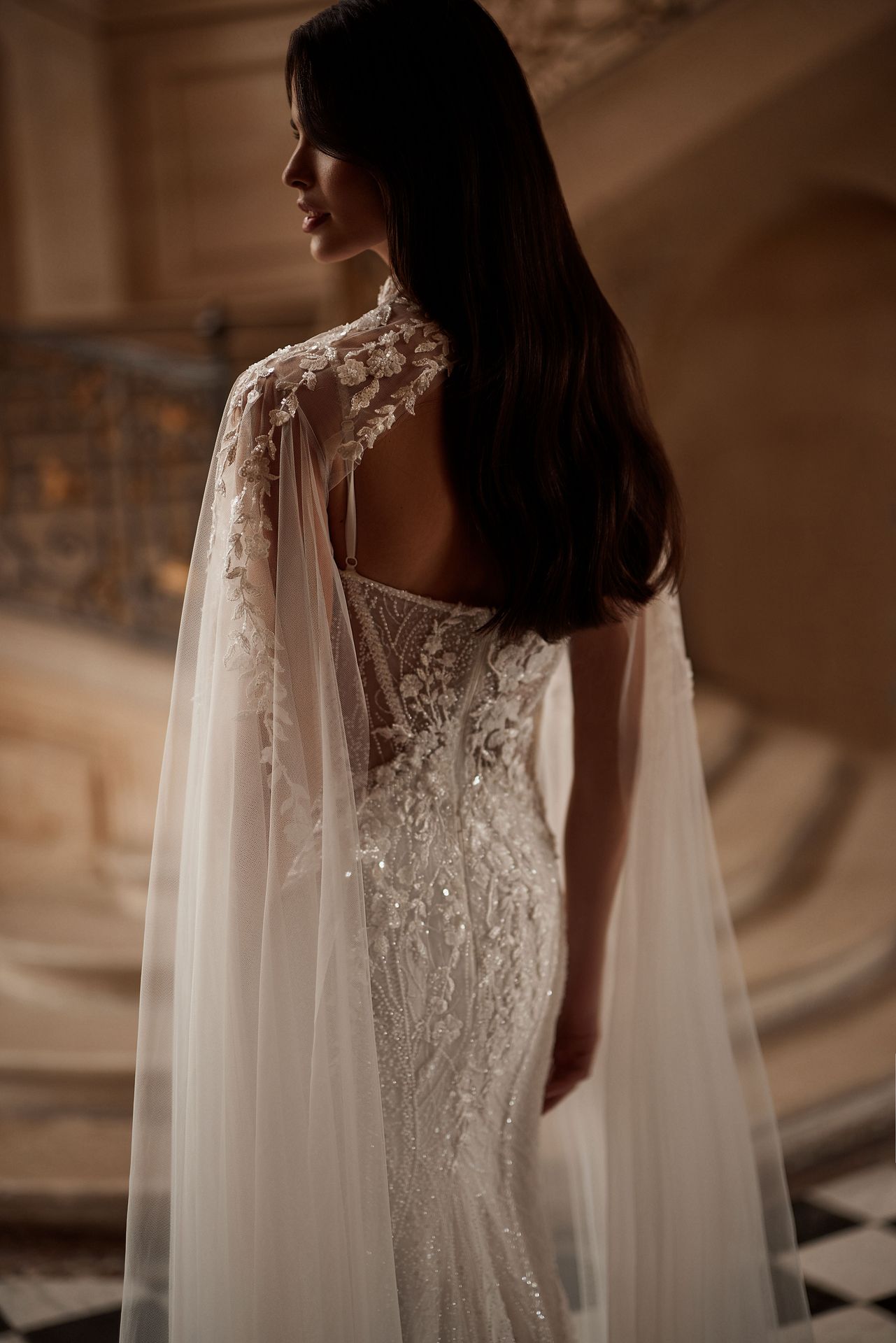 Spectacular spaghetti strap mermaid wedding gown made from semi-transparent lace, embellished by hand with sequin patterns and floral lace applique. Featuring a heart-shaped neckline with built-in cups, a semi-transparent embellished bodice supported by delicate straps, detachable off-the-shoulder sleeves, a zip-up closure at the back, and a maxi fitted skirt with a short train. Can be complemented by a dramatic turtleneck cape embellished with floral appliques.