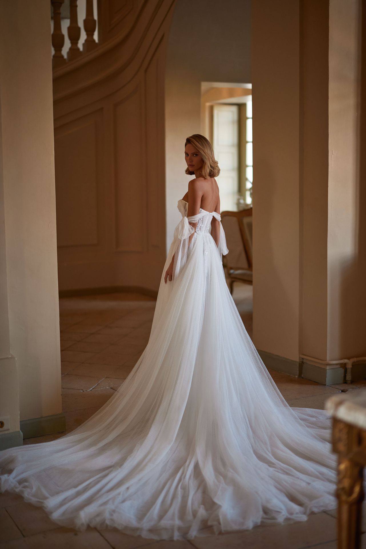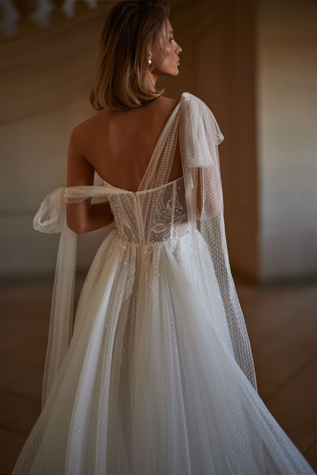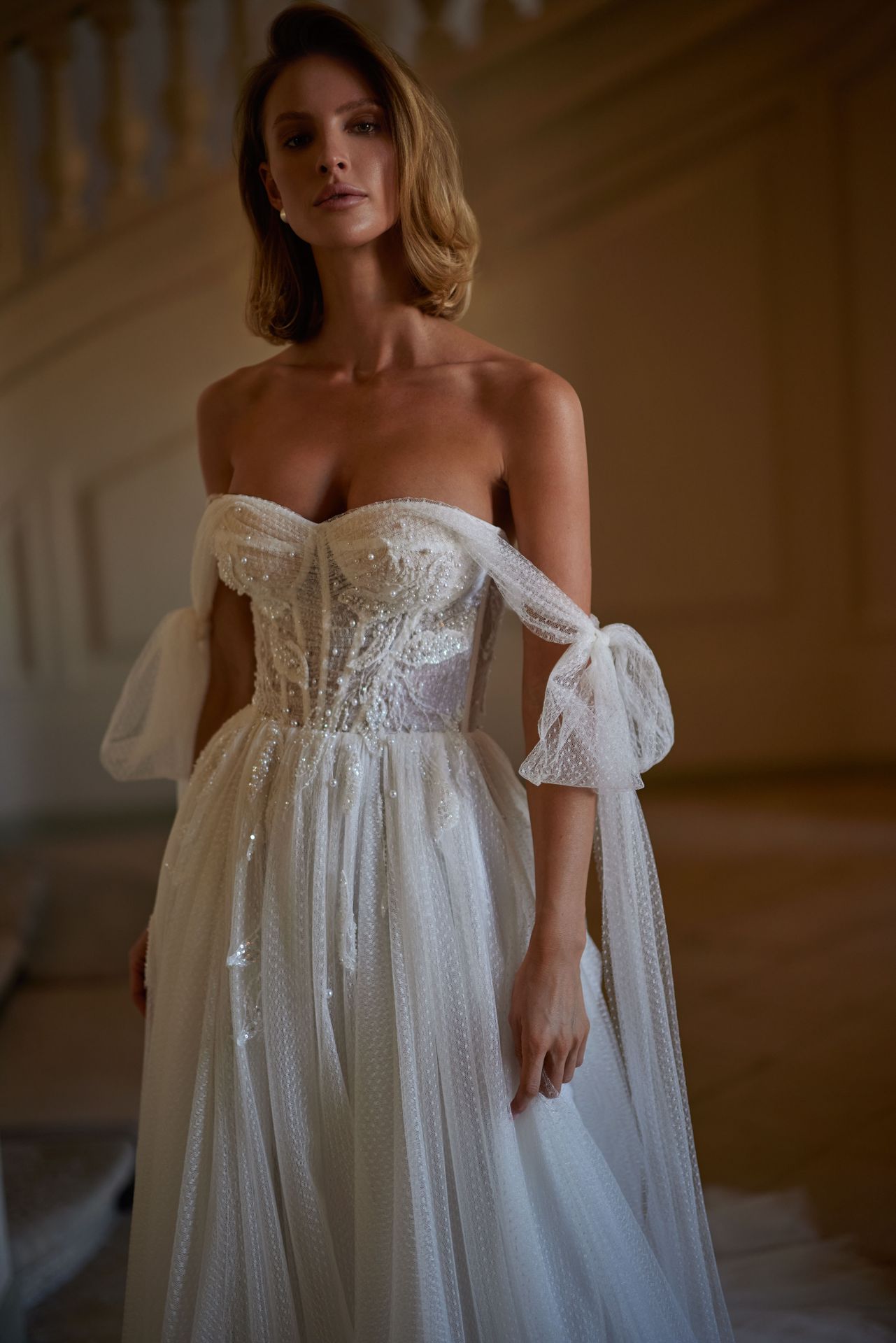 Captivating semi-transparent A-line wedding gown adorned with 3D flowers, pearls, and sequins. Featuring a heart-shaped corset with tulle straps that can be styled by tying the top in different ways or dropping it on the shoulders. The maxi skirt is full of lace overlay and has a long puffy train.