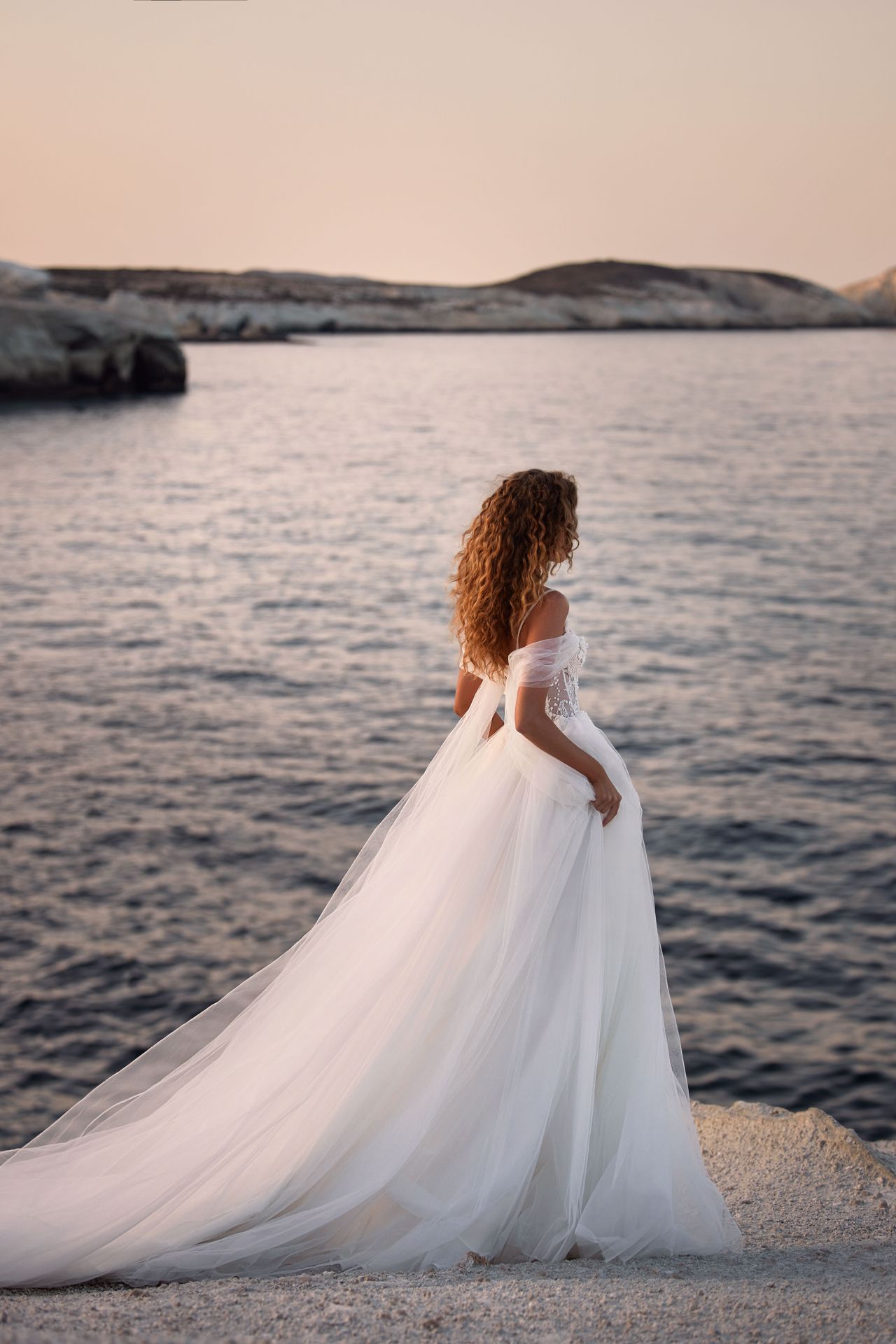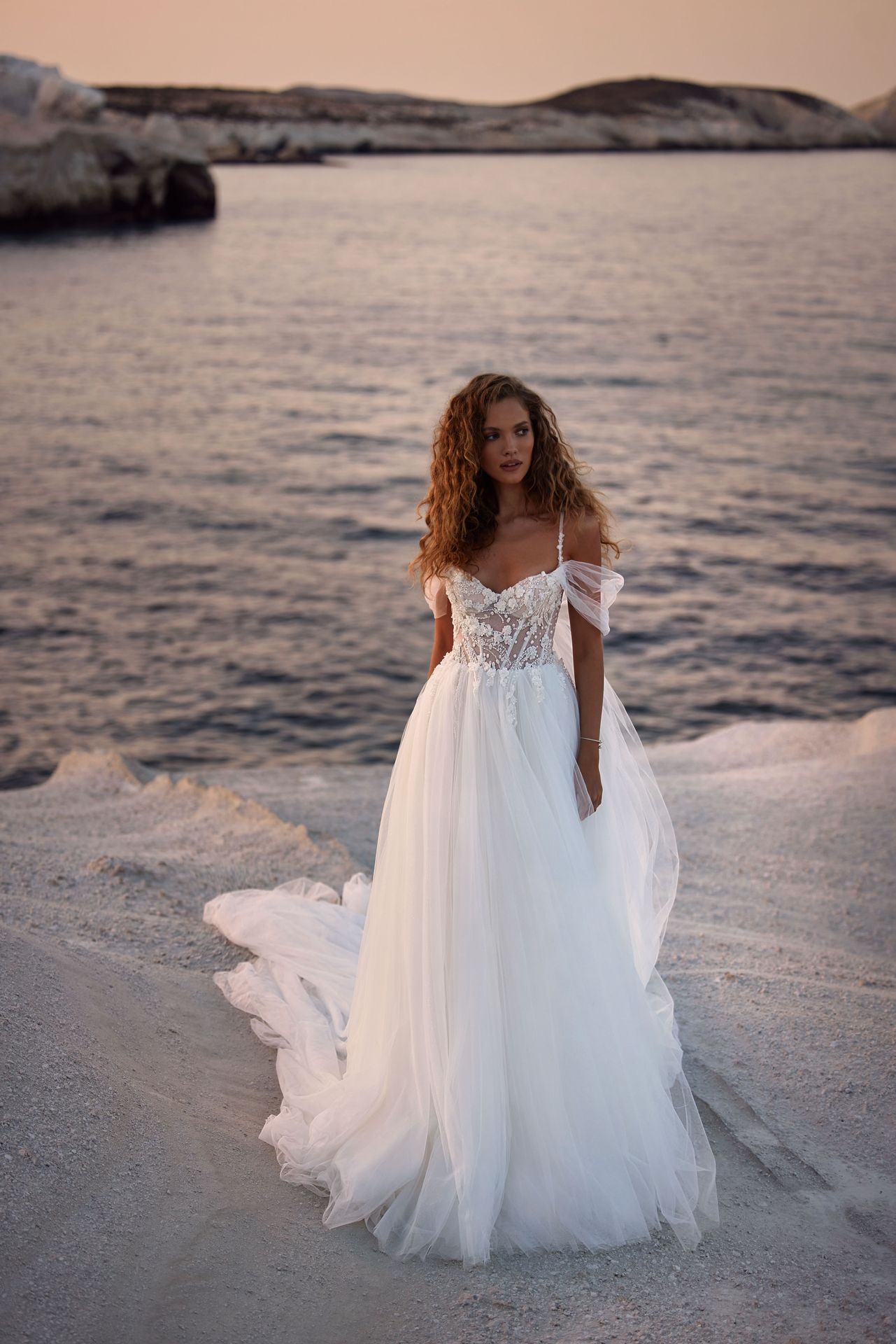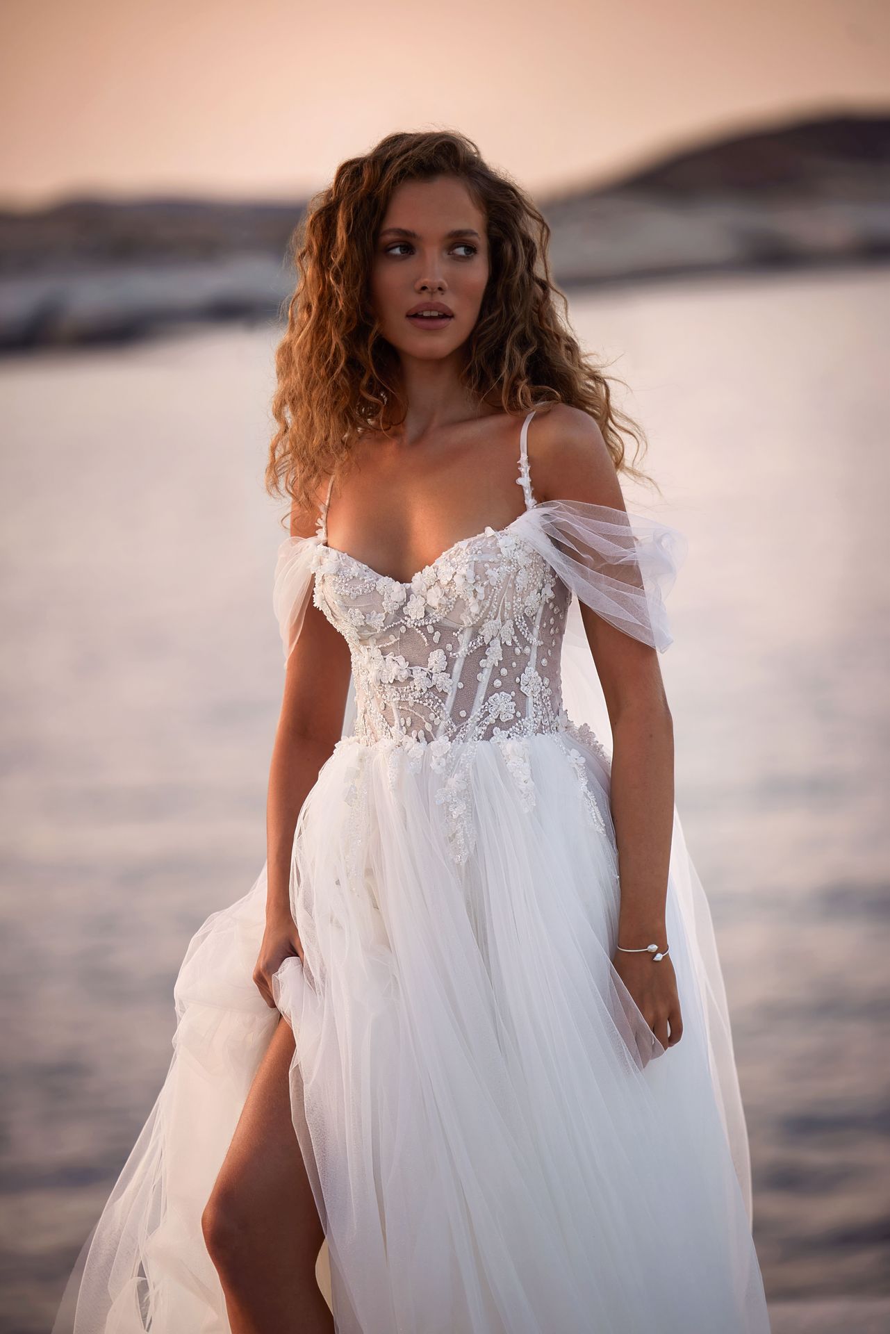 Adorable tulle gown covered in glitter on straps with off-the-shoulder sheer puffy sleeves, heart-shaped corset, a thigh slit, and 3D florals all over the gown.