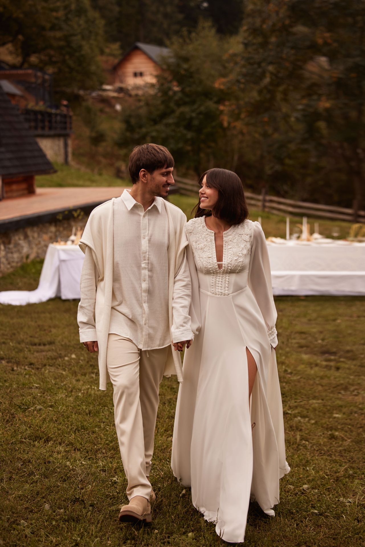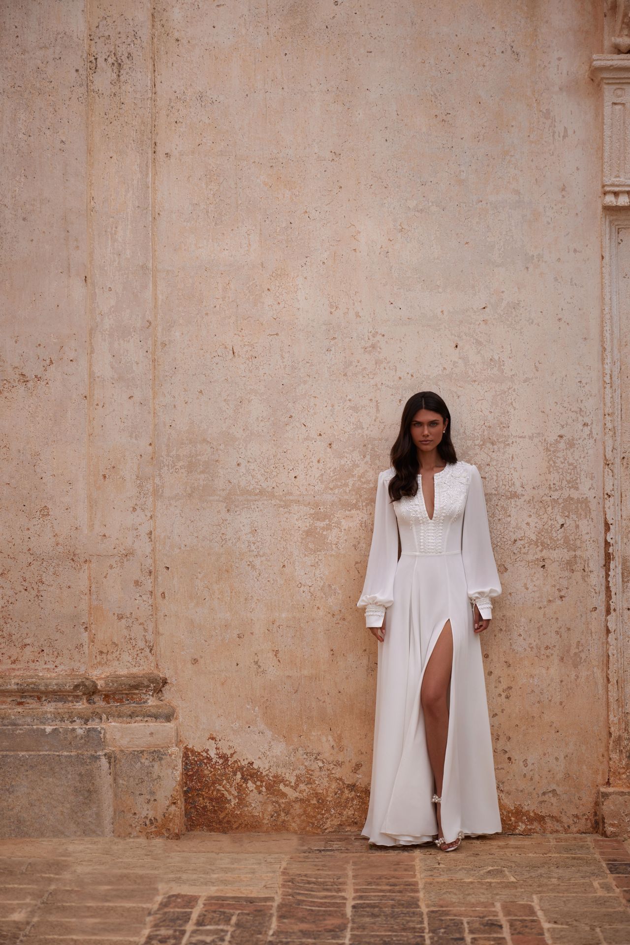 Crafted from an airy chiffon long-sleeved wedding gown with a V-neckline embellished with intricate beadwork, puffy long sleeves, and a flowy skirt with a side slit.