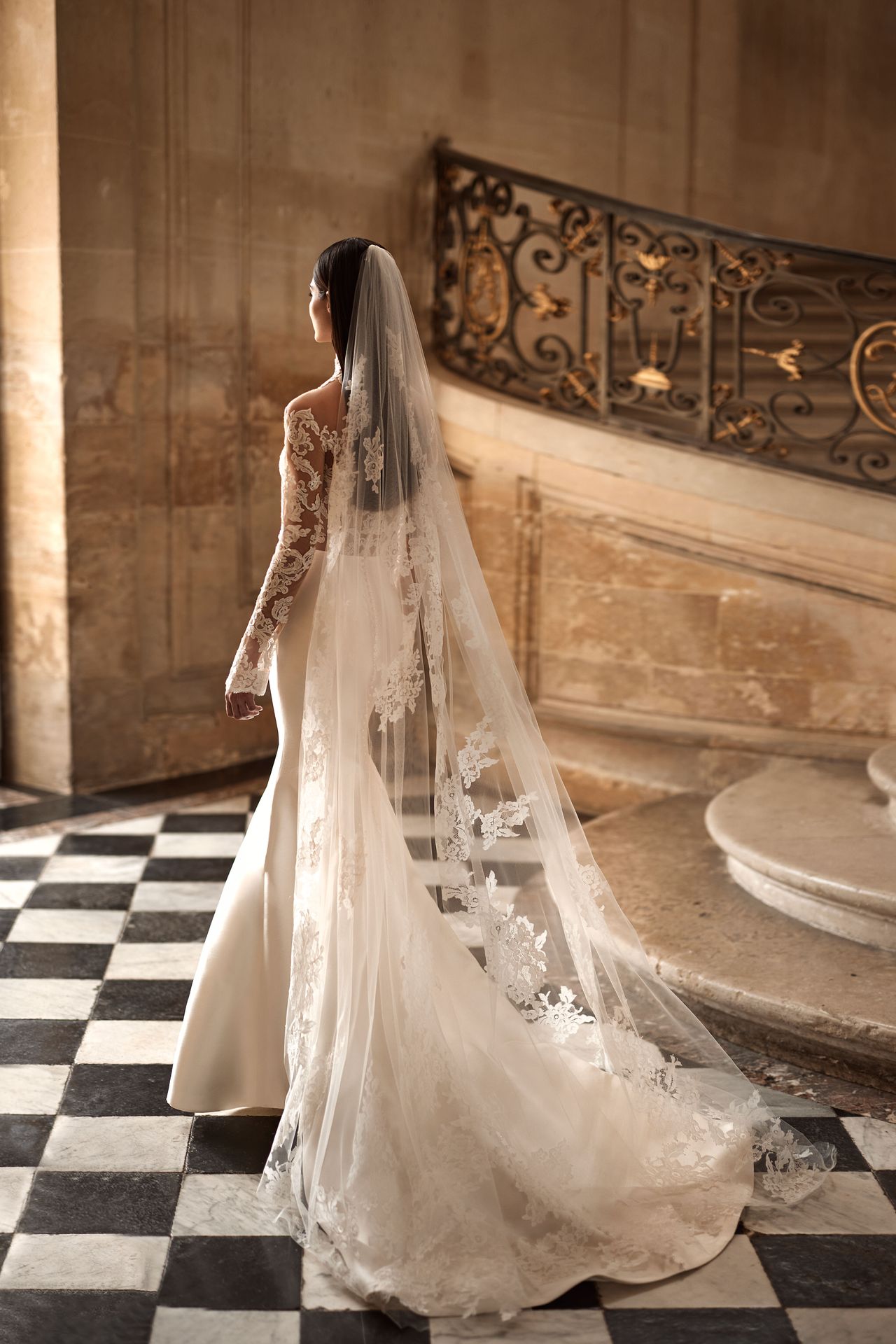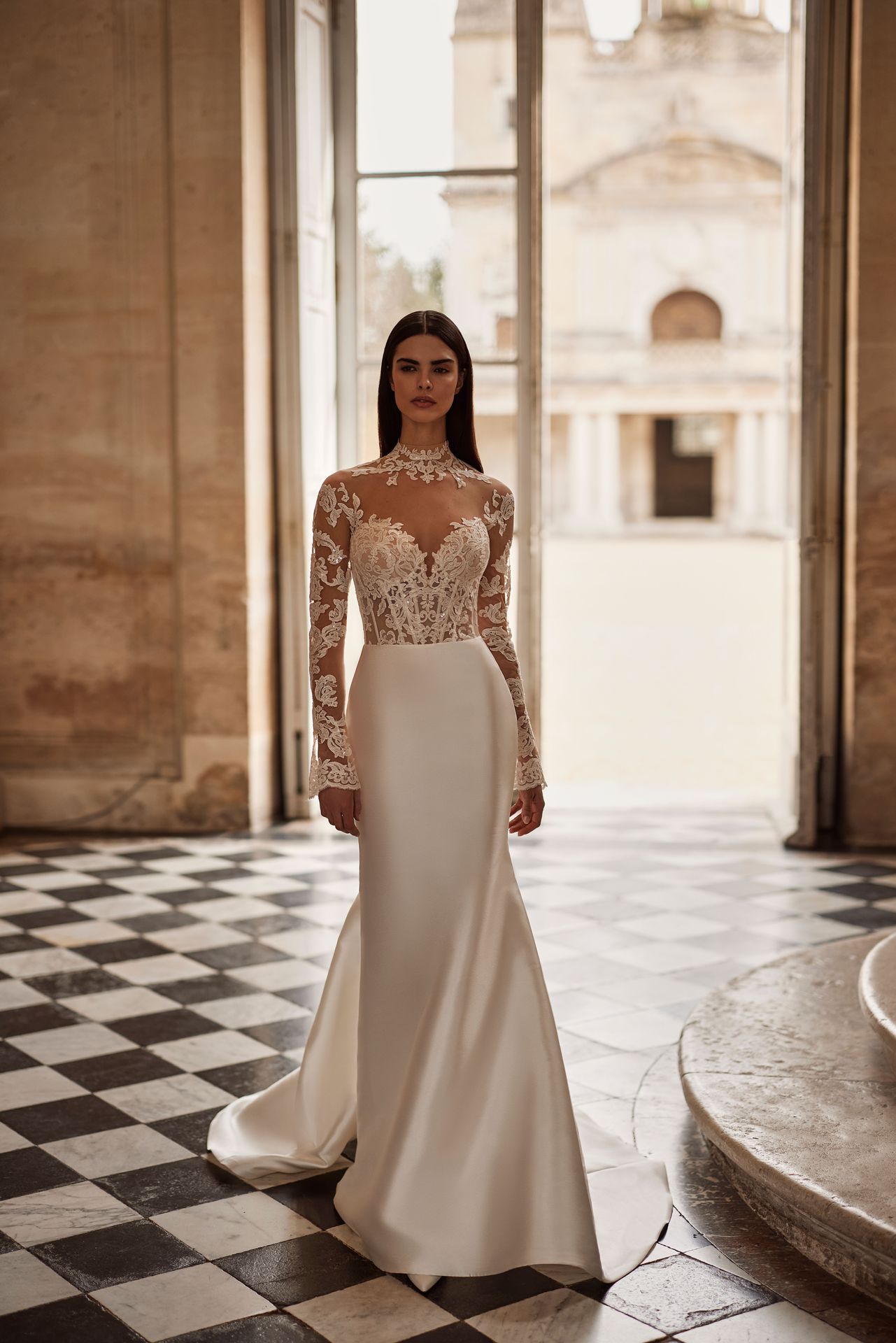 Exceptional turtleneck wedding gown in a trumpet silhouette. Featuring a buttoned back and a sheer turtleneck long-sleeved bodice embellished by hand with exquisite floral lace and sequins, creating a delicate pattern that spills over the corset and sleeves. Fashioned from mikado fabric, the skirt delicately embraces curves and is completed with a short train.