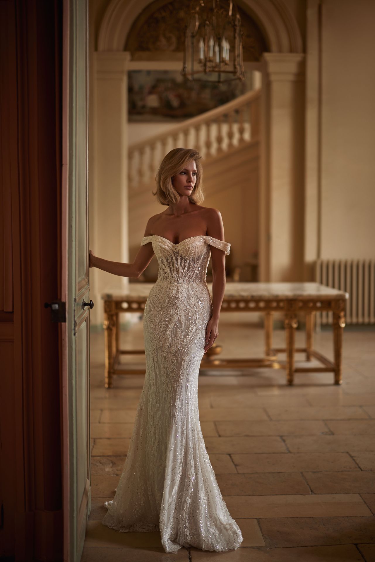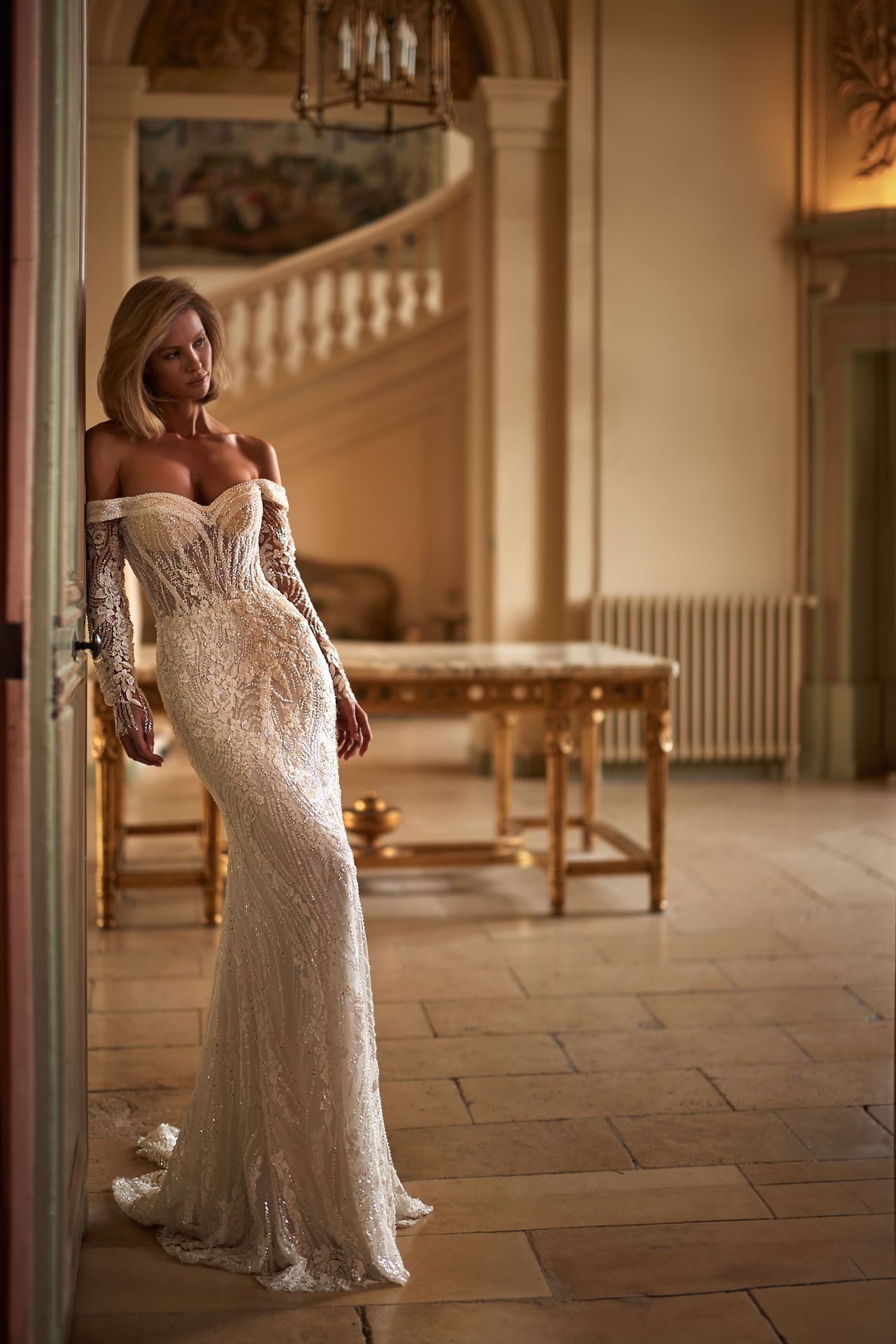 Breathtaking long-sleeved off-the-shoulder mermaid wedding gown made from semi-transparent lace embellished by hand with sequins, pearls, and 3D floral appliques. Featuring a detailed heart-shaped neckline, a semi-transparent embellished bodice, a zip-up closure on the back, and maxi fitted skirt with a short train.