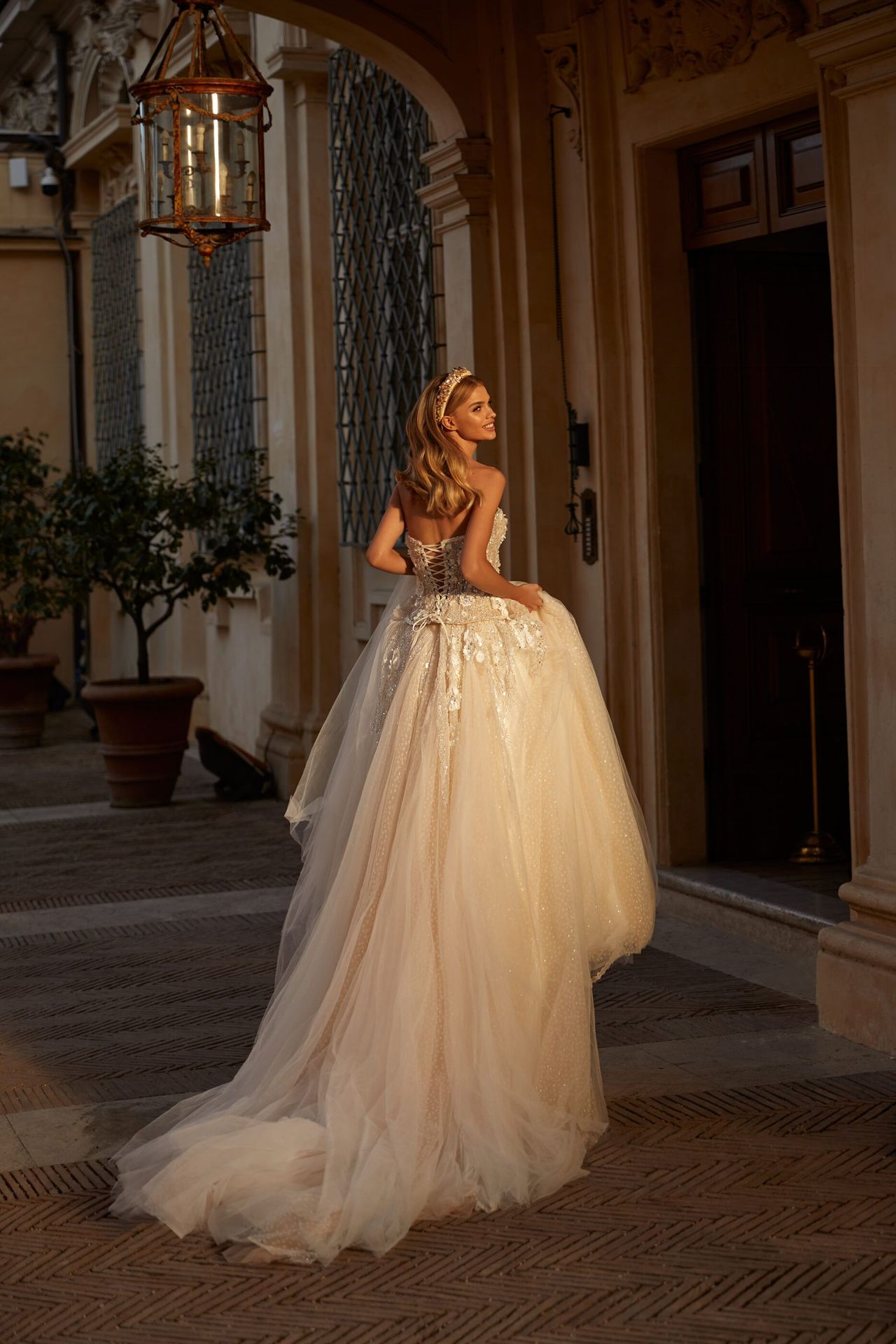 A-line ivory wedding dress with a tulle skirt and beaded floral embellished corset with lace-up closure on the back. Can be complemented with Leggra corset with a belt and Libera skirt.