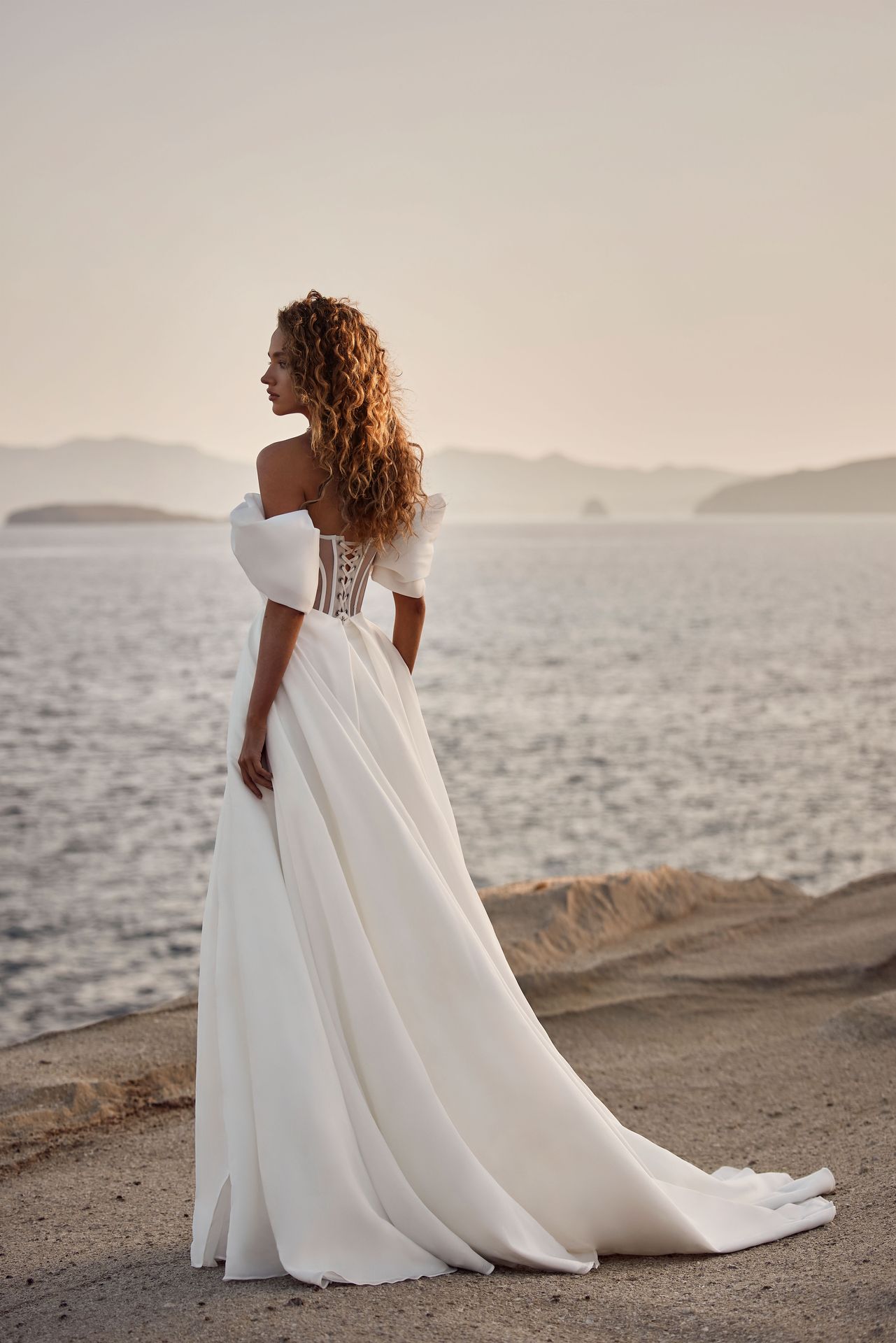 Sophisticated organza wedding gown with a wrapped heart-shaped bodice, lace-up closure on the back, off-the-shoulder puffy sleeves, and draped maxi skirt with a thigh slit and a short train.