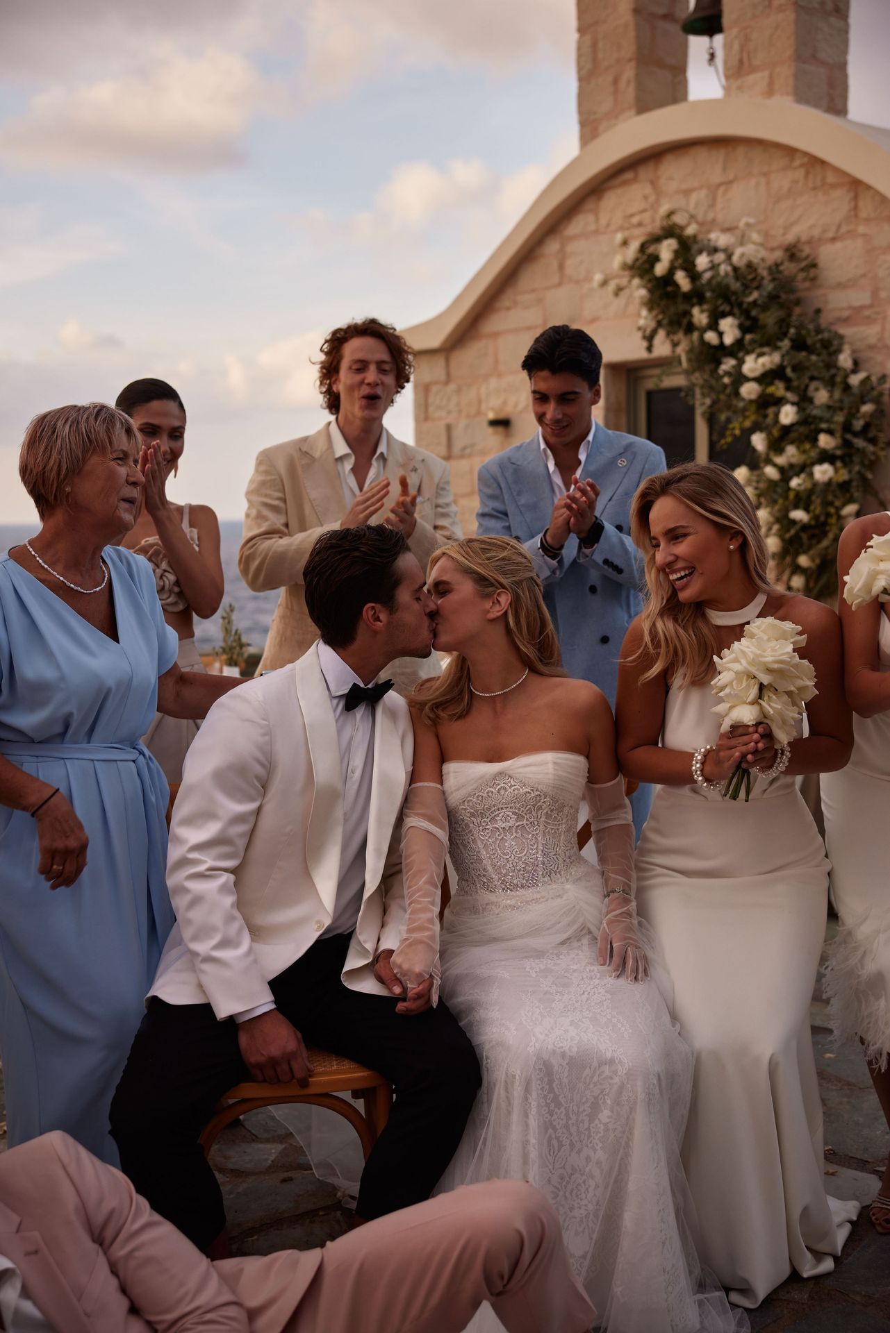 Showstopper wedding set with a lace corset and a fitted lace skirt. The corset features a straight neckline and a lace-up closure on the back, while a skirt comes with a scalloped hem and a midi train. The set comes with a detachable airy sheer tulle skirt adorned with drapery and an ethereal off-the-shoulder tulle cape with a midi train.