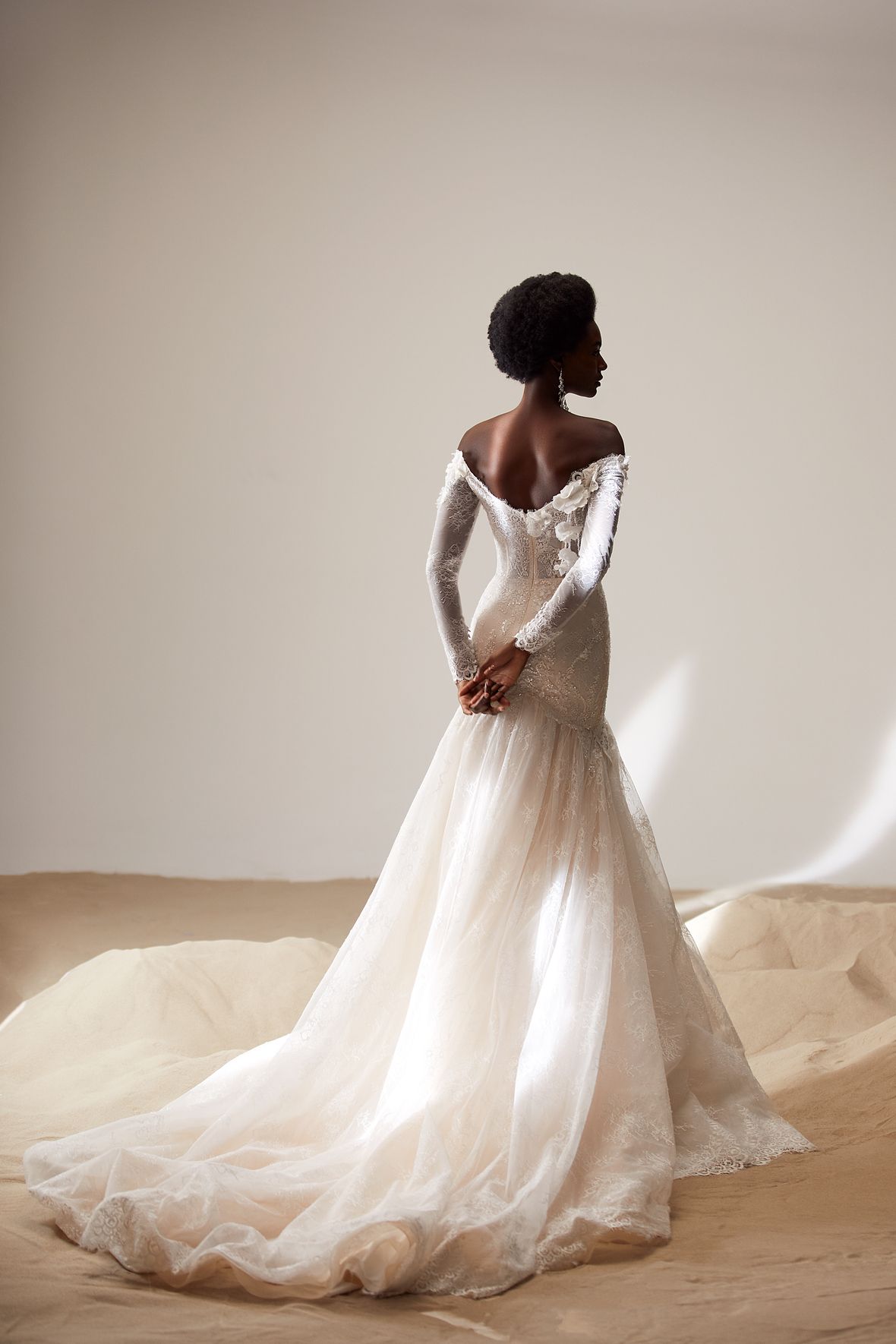 Gorgeous off-the-shoulder trumpet wedding dress with tulle long sleeves, V-neckline and open back. Available in nude/ivory and total ivory color option.