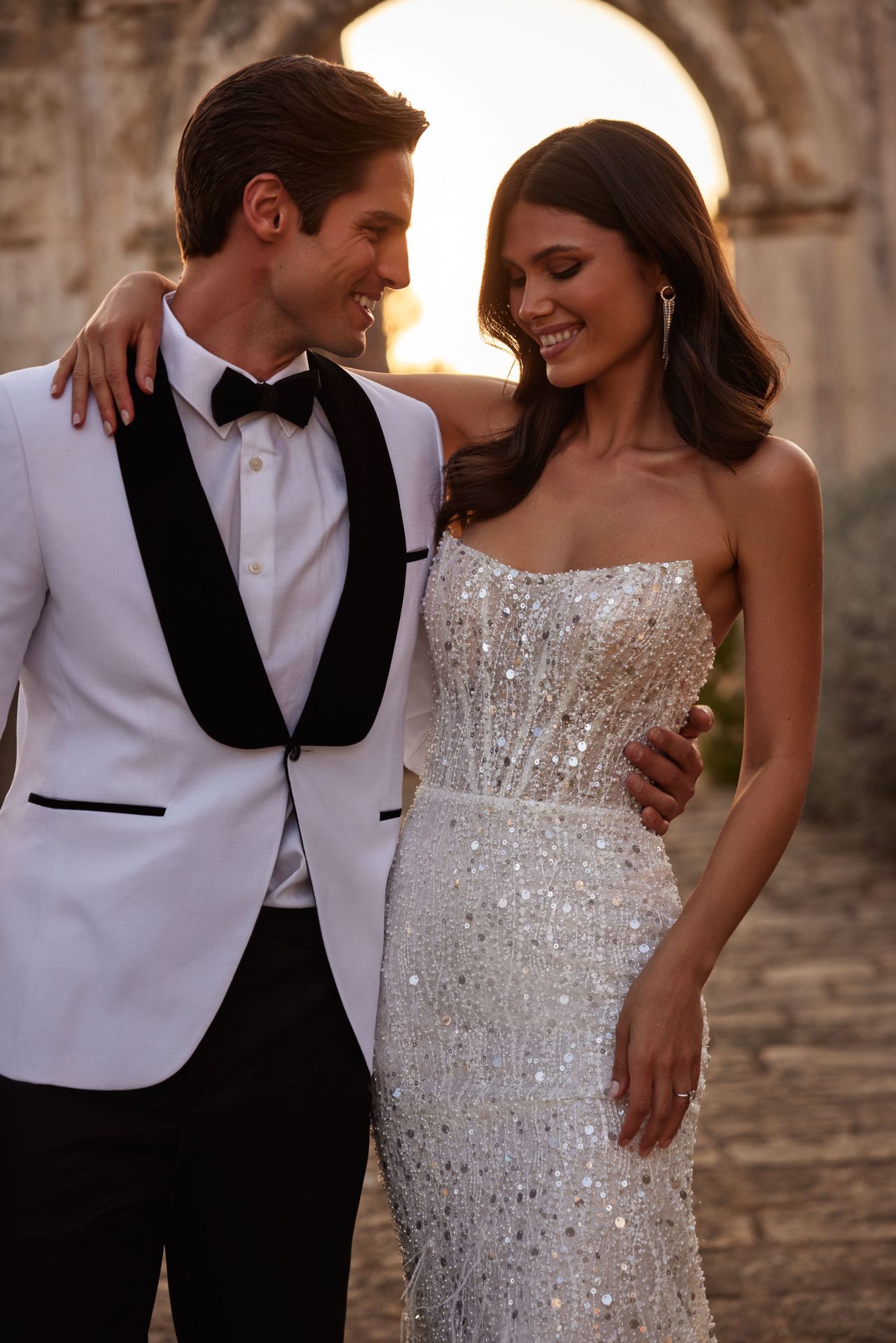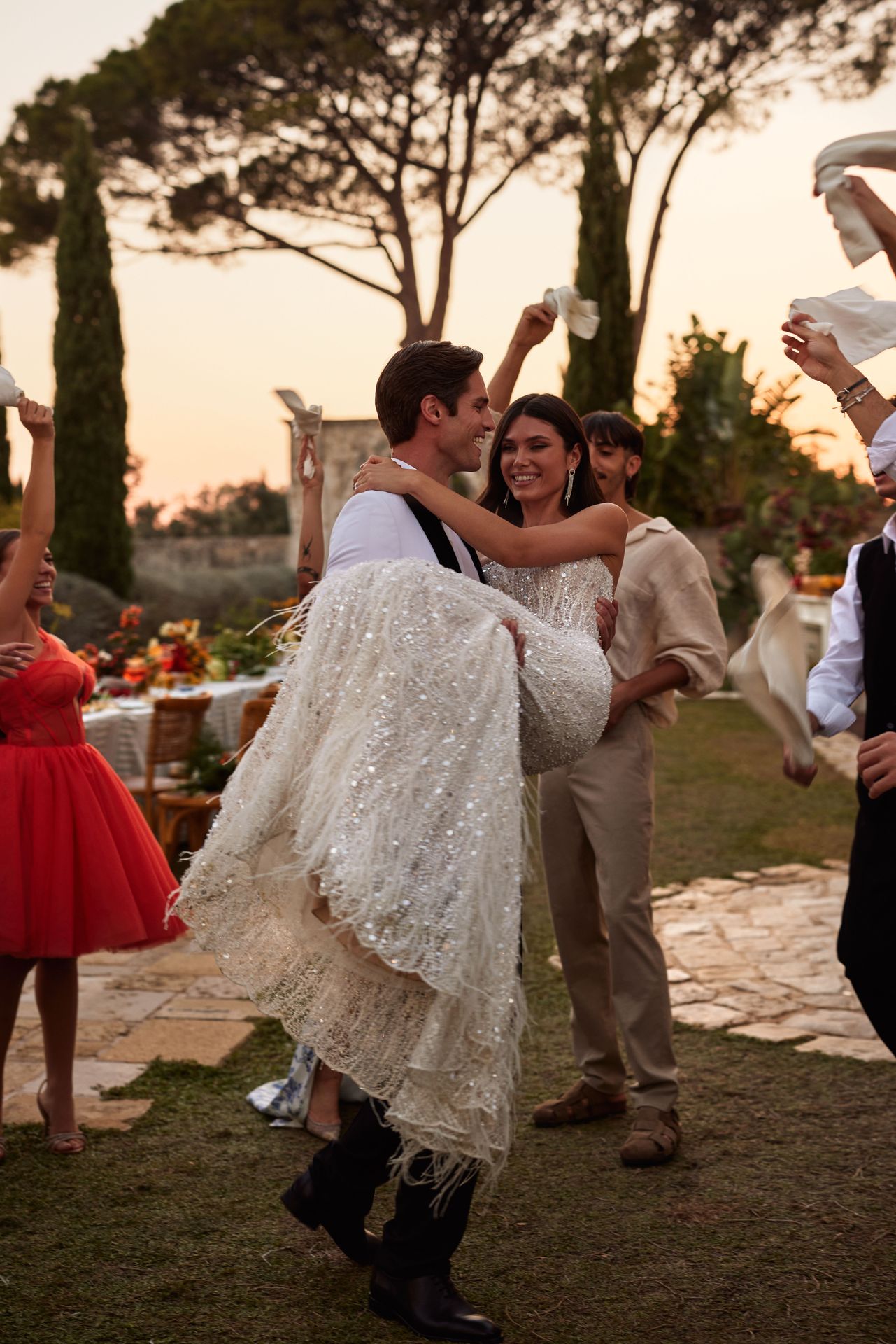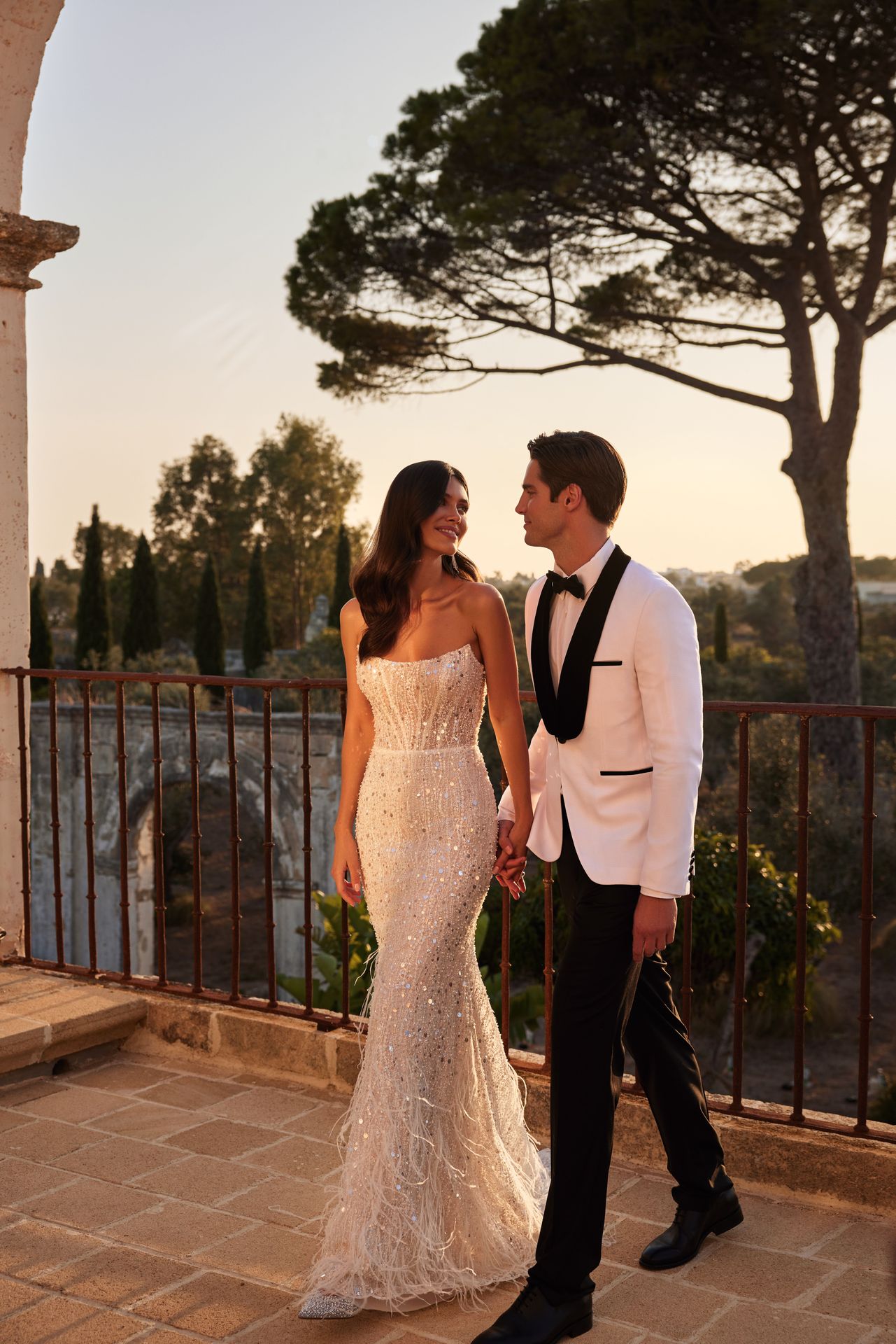 Astonishing mermaid gown made from semi-transparent lace embroidered with sequins, beadings, and feathers. Featuring a geometrical neckline, a boned shiny corset, a zip closure on the closed back, and a romantic skirt decorated by hand with feathers and sequins.