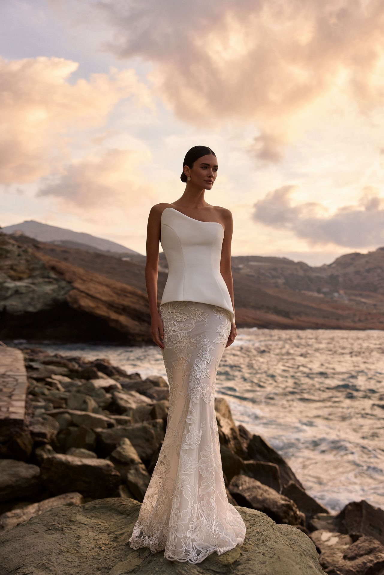 Edgy and chic asymmetric corset top fashioned from smooth chiffon fabric in a structured silhouette. Featuring a one-shoulder neckline for a contemporary twist, visual boning, and a zip closure at the back that enhances a flattering shape. Pair this corset with a chiffon Lucetta mermaid skirt or lace Lucetta mermaid skirt.