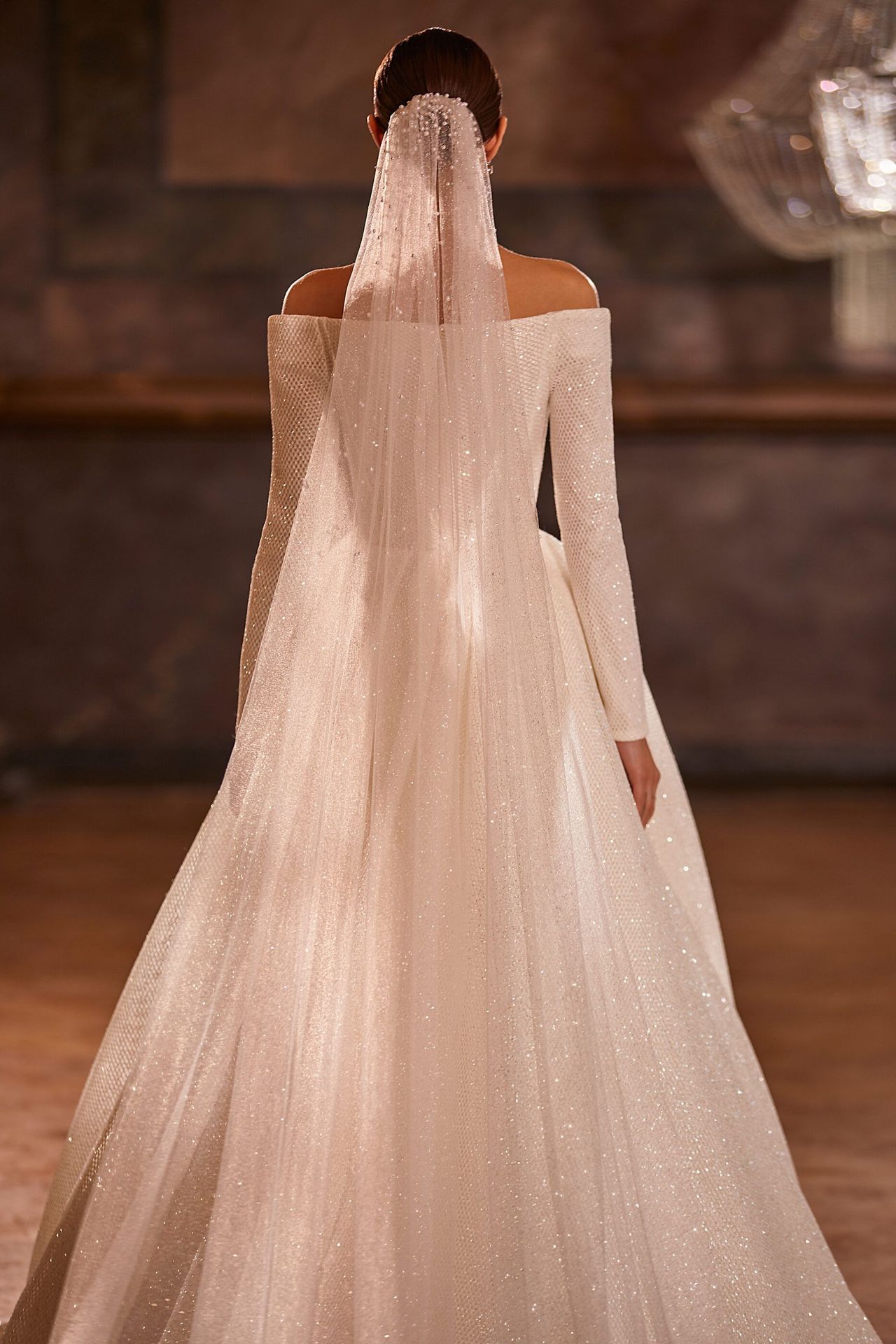 Gorgeous off-the-shoulder royal ballgown wedding dress in ivory. Features a waffle weave fabric, bateau neckline, long sleeves, and a full skirt with a long train.