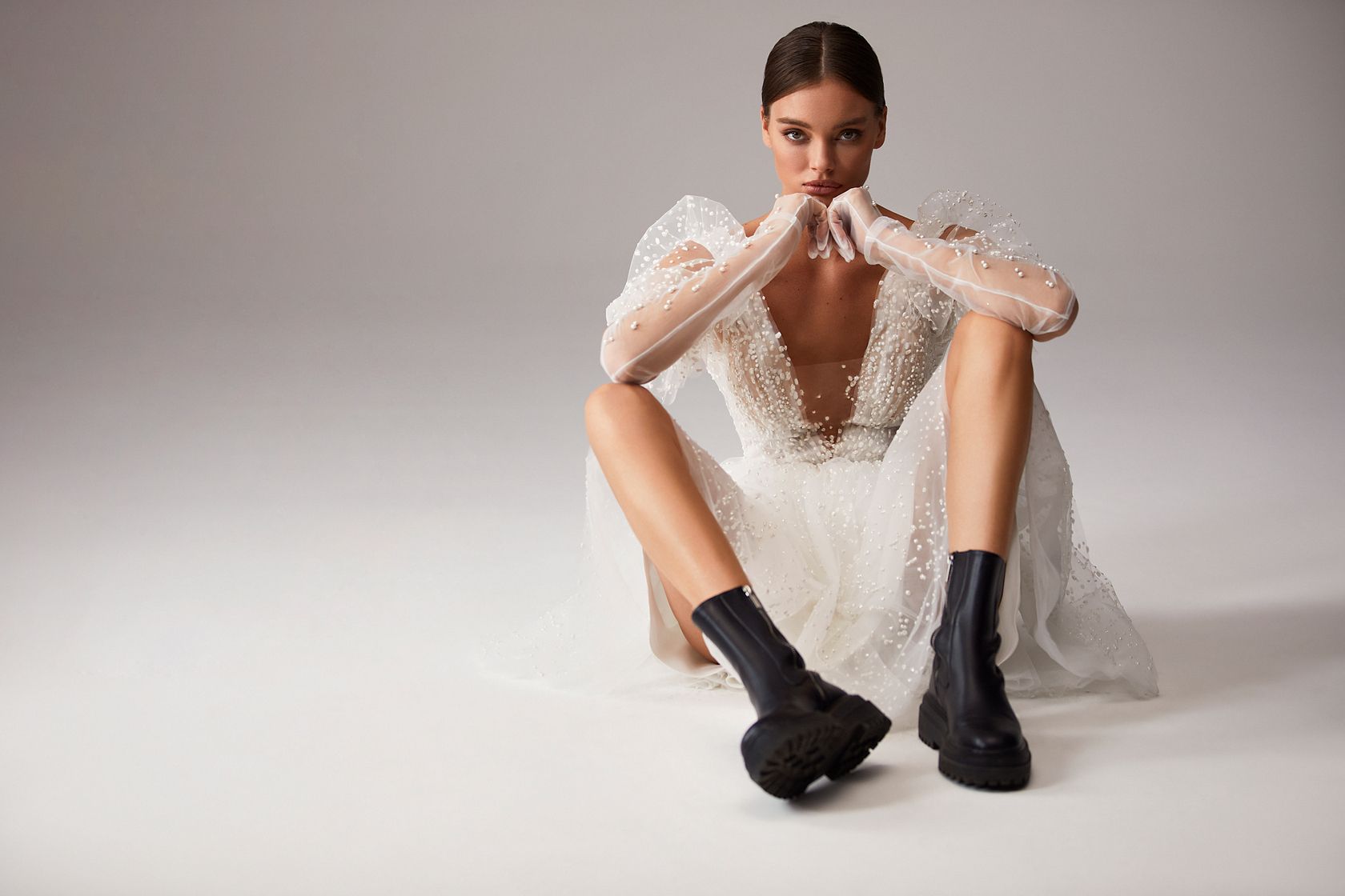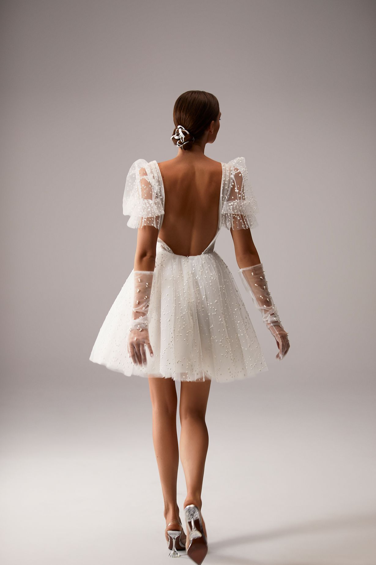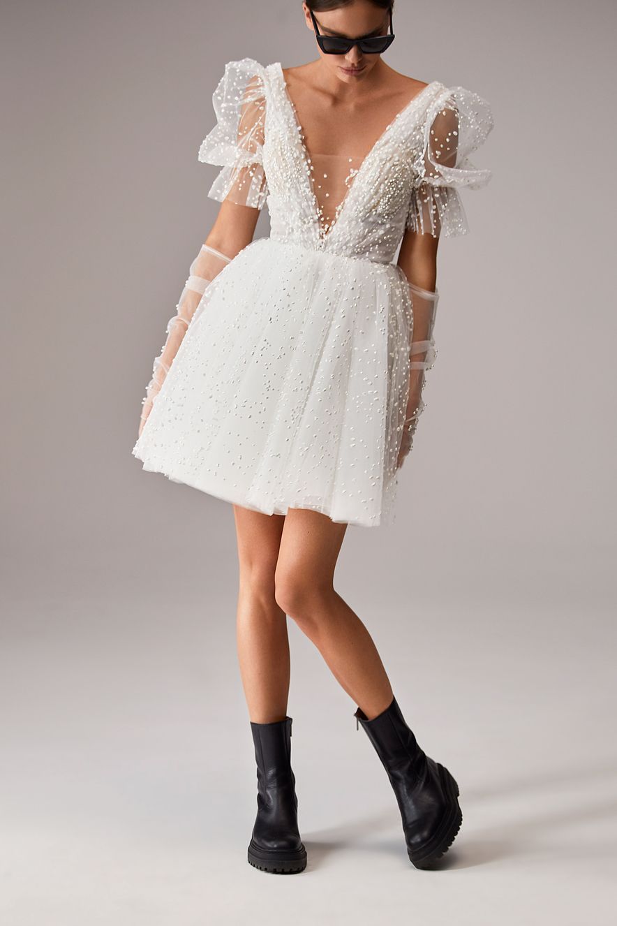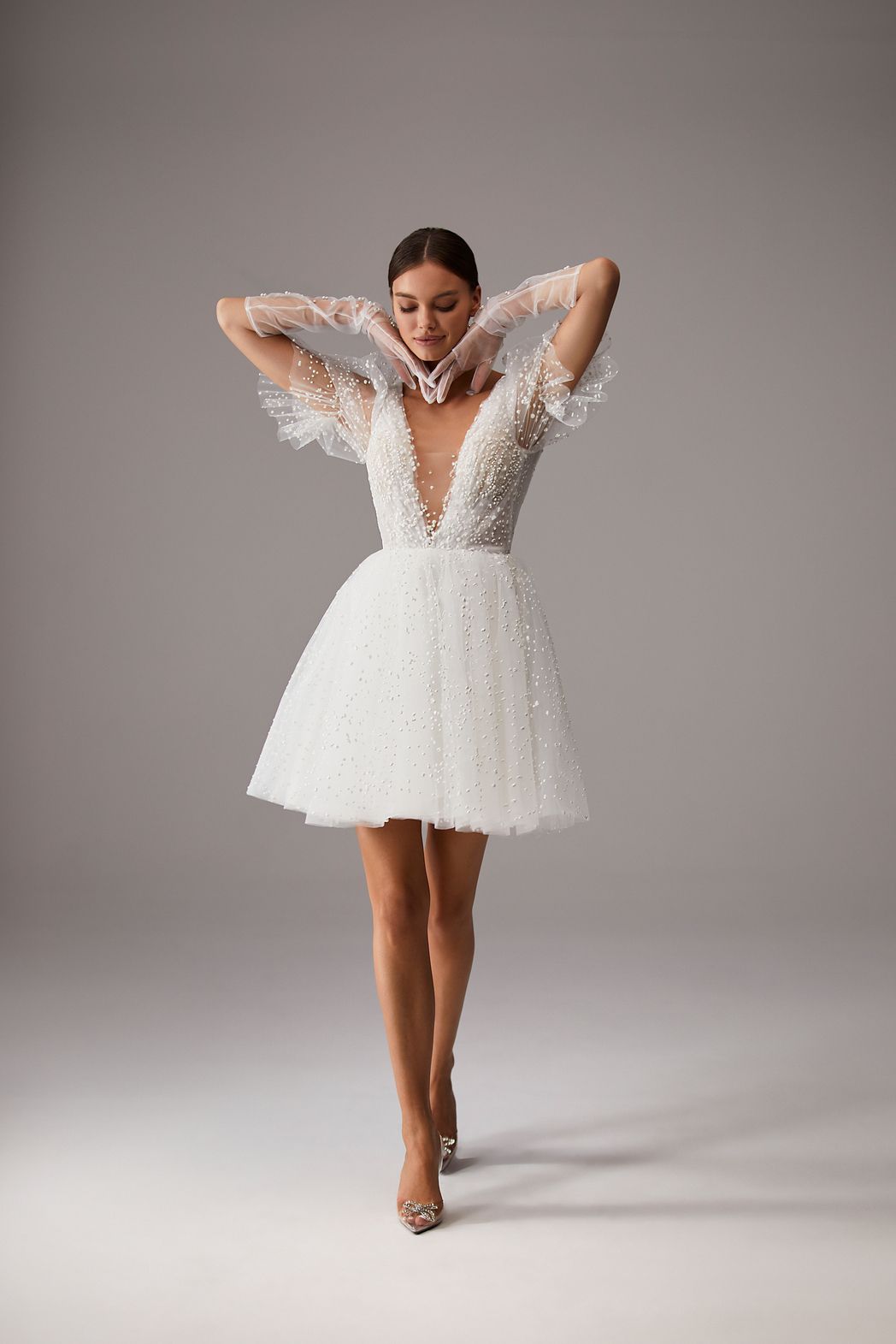 Dots tulle mini dress with V-neckline puffy sleeves and princess skirt. Perfect as a second wedding dress or evening party dress.