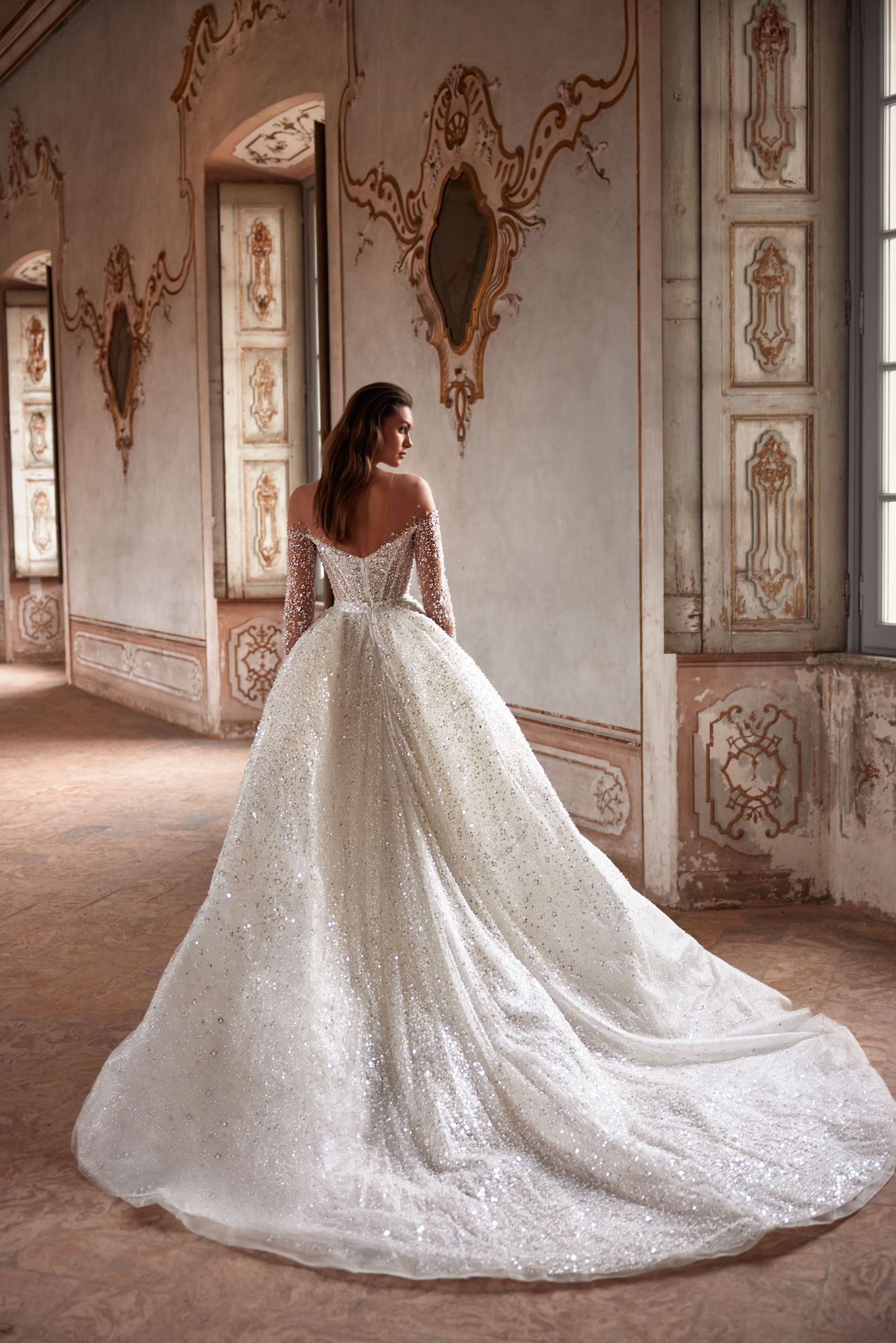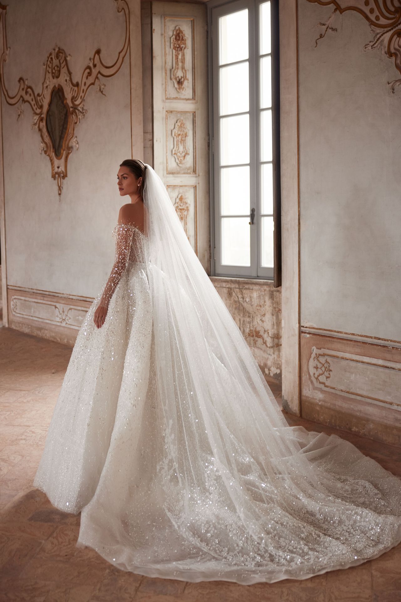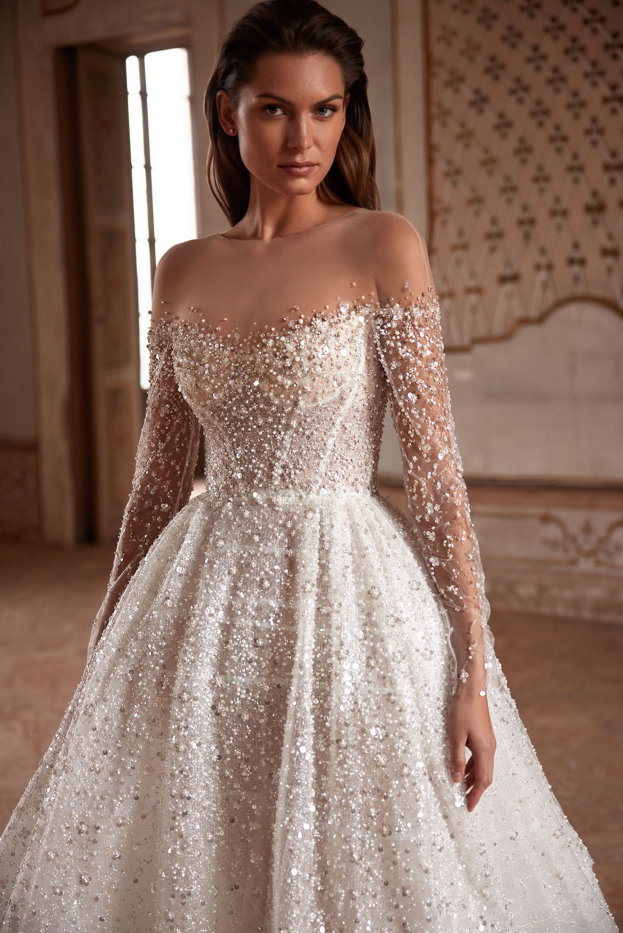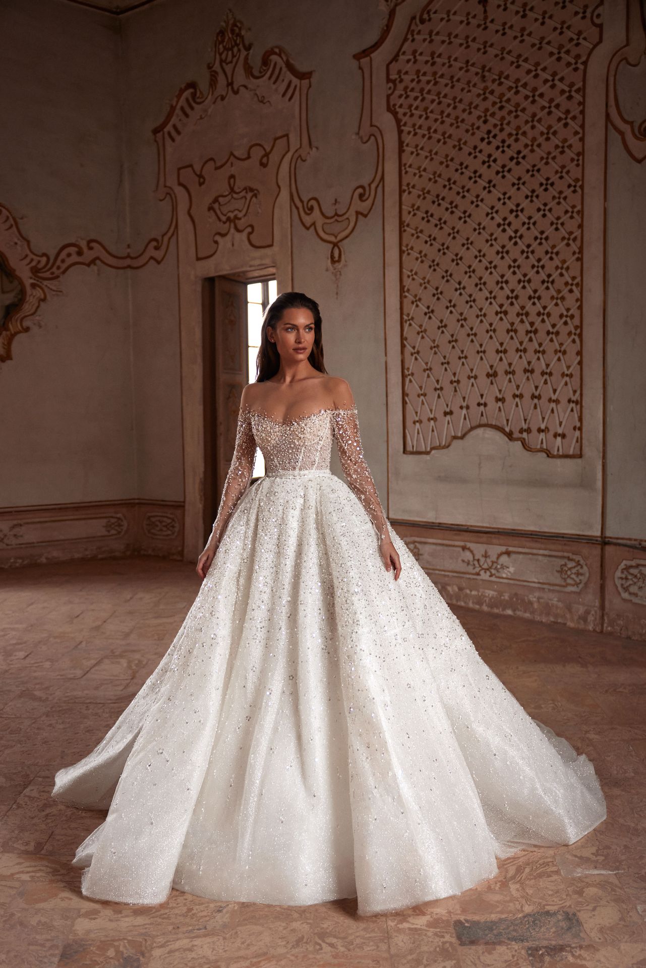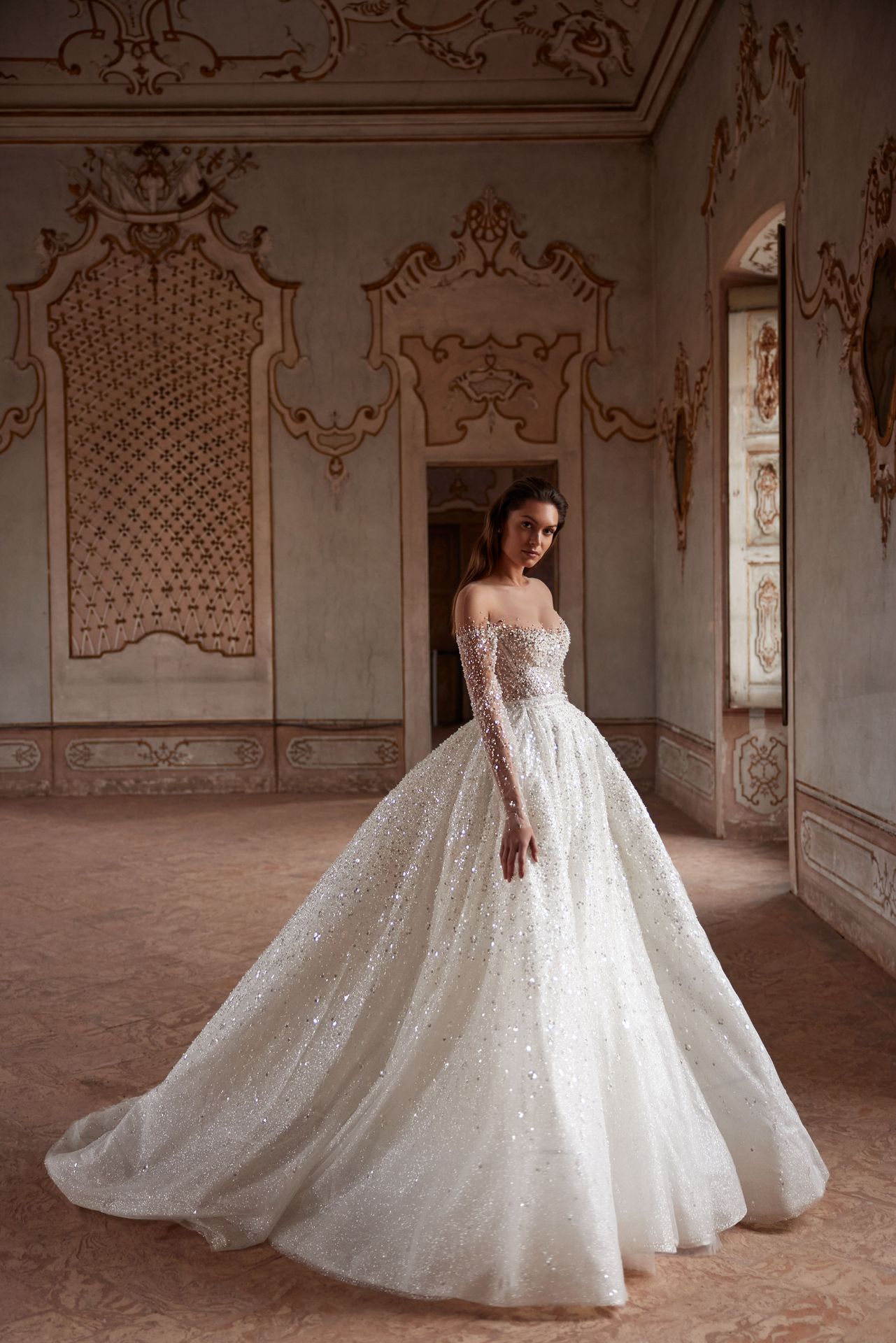 Opulent long-sleeved off-the-shoulder ball gown presented in delicate lace subtly embroidered with beadings and silver metallic sequins. The dramatically adorned corset and illusion boat neckline make a shoulder line more visible highlighting cinched waist, and playing with the proportions of the female form. The skirt has a gathered crinoline structure and is overlaid with delicate sequins.