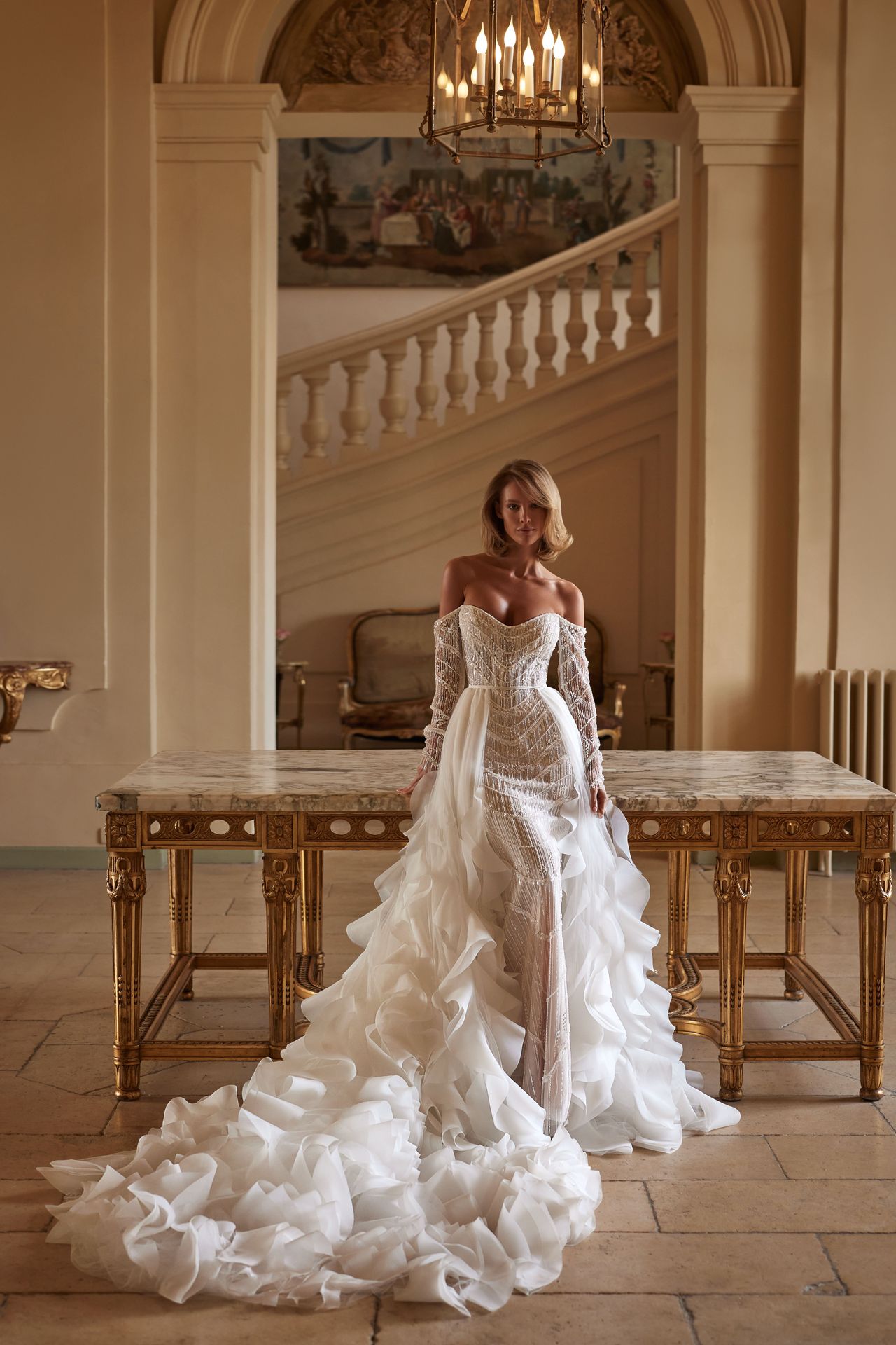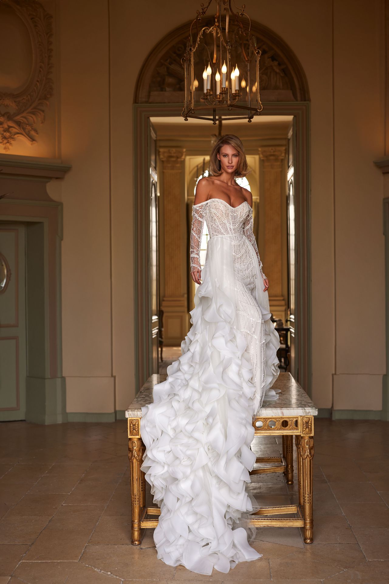 The bridal look can be elevated by a dramatic long detachable Madeira train made from dozens of organza layers handcrafted into volumetric ruffles.