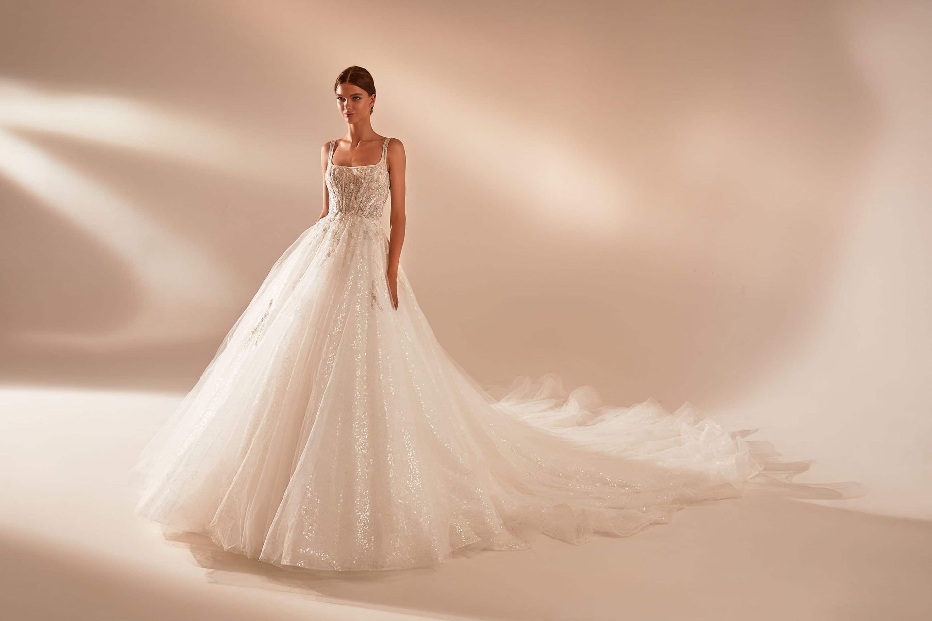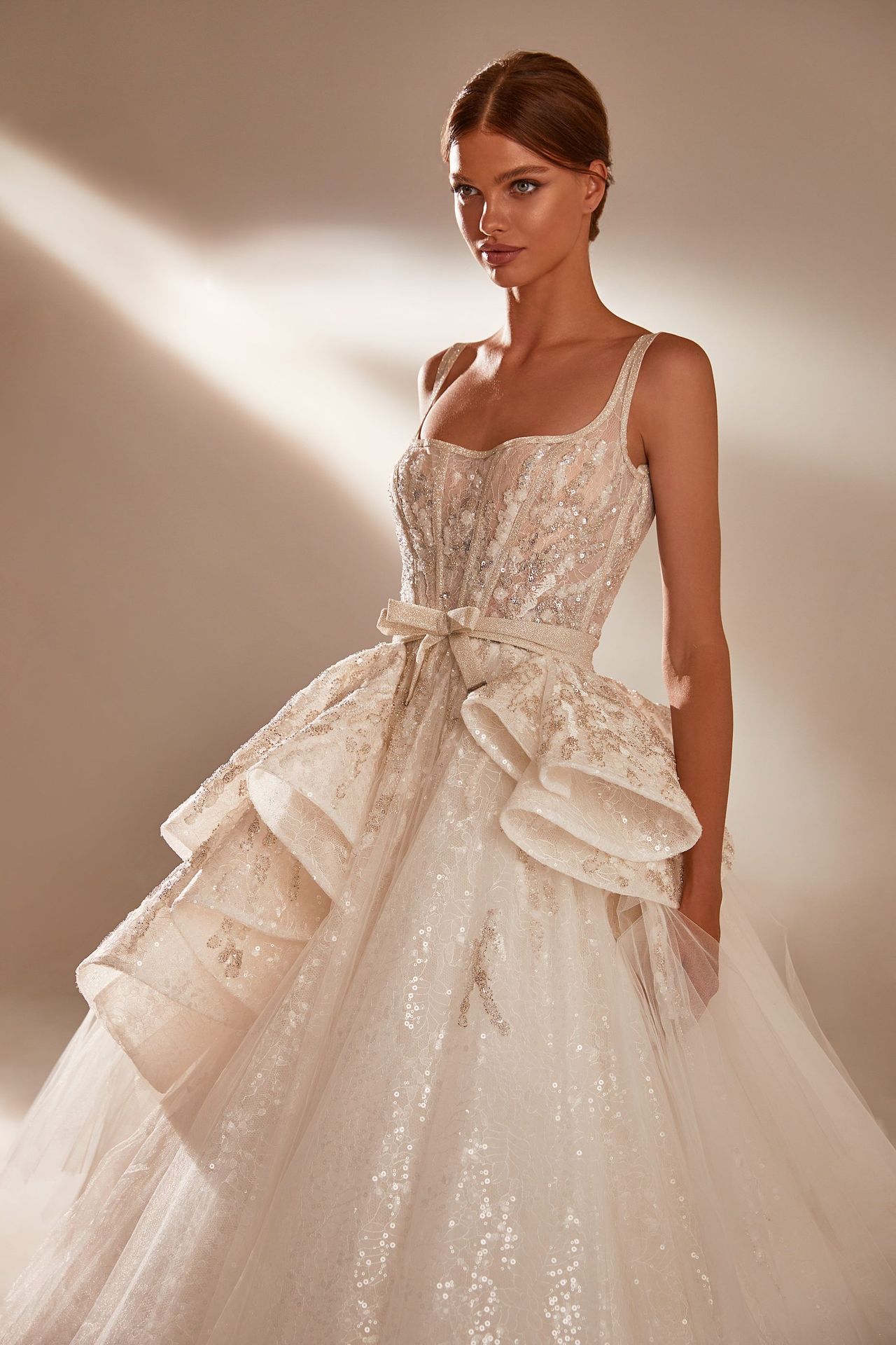 Fully embellished with sequins and delicate floral pattern wedding gown. Features thin spaghetti straps, a heart-shaped bodice, an open back, and a long train. The image can be complemented with a detachable fully adorned ruffle train with a tender bow-knot in the front.