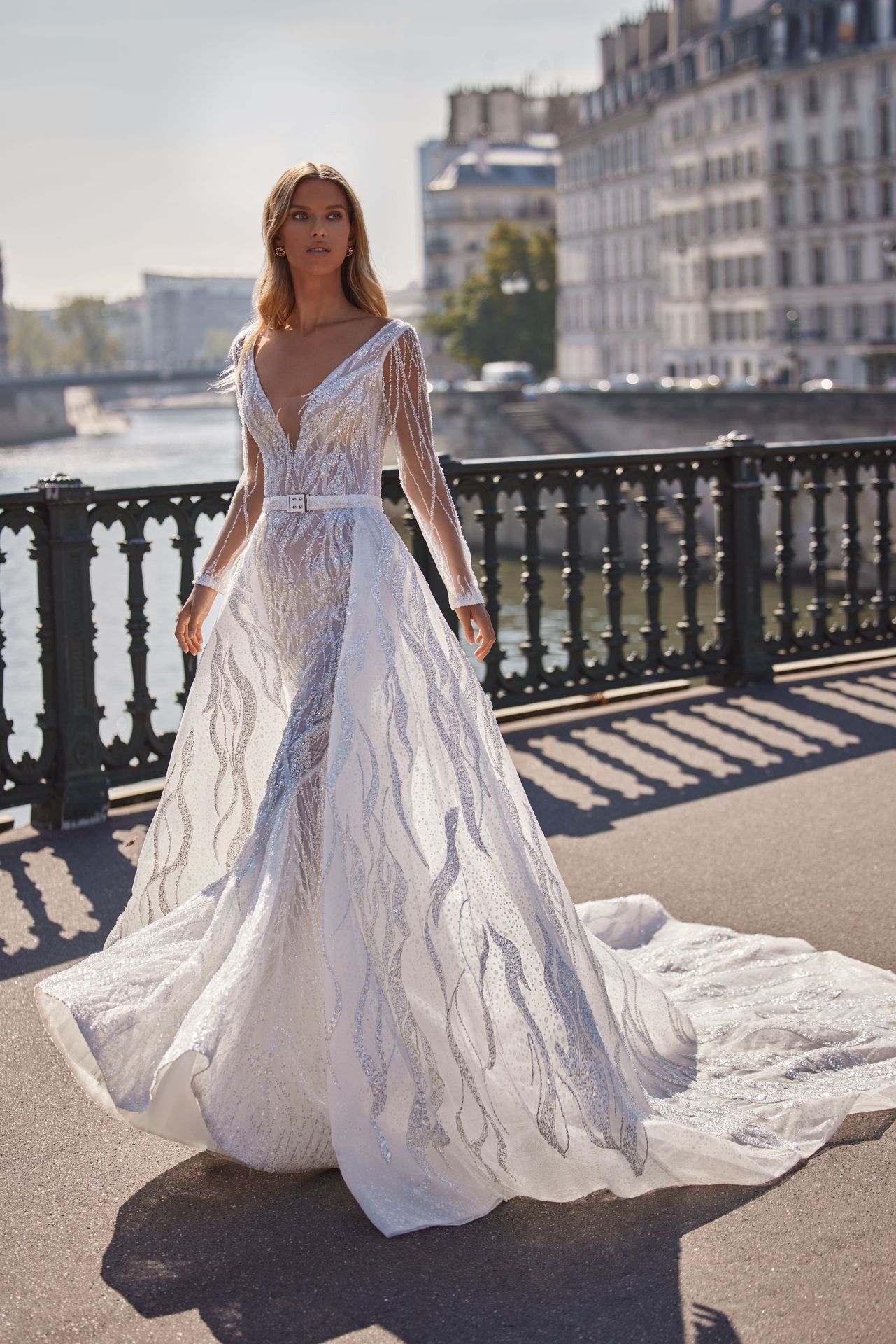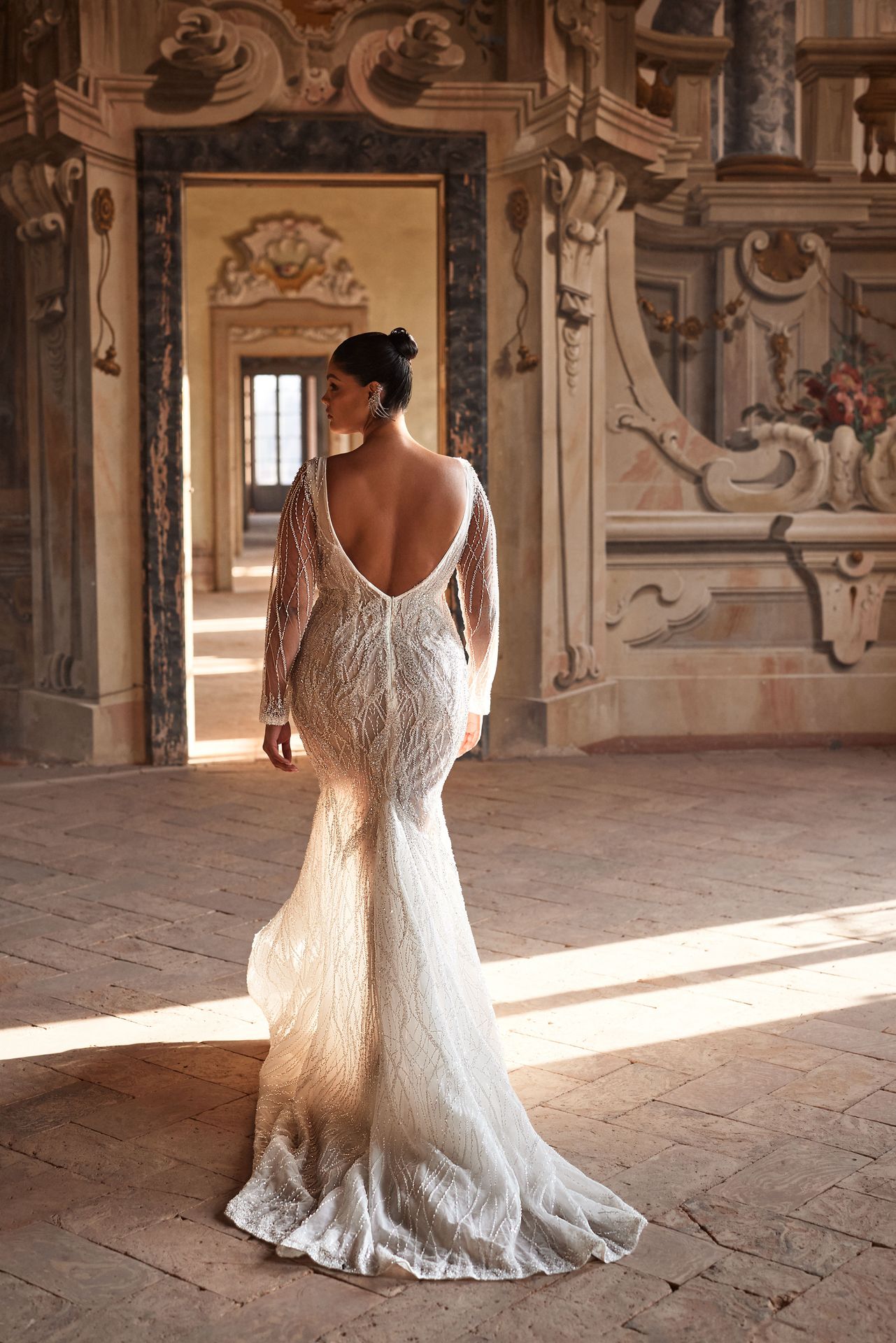 Astonishing semi-transparent mermaid wedding gown. Featuring a long-sleeved bodice with a plunging V-neckline, long sleeves, and a fitted skirt with a short train.
